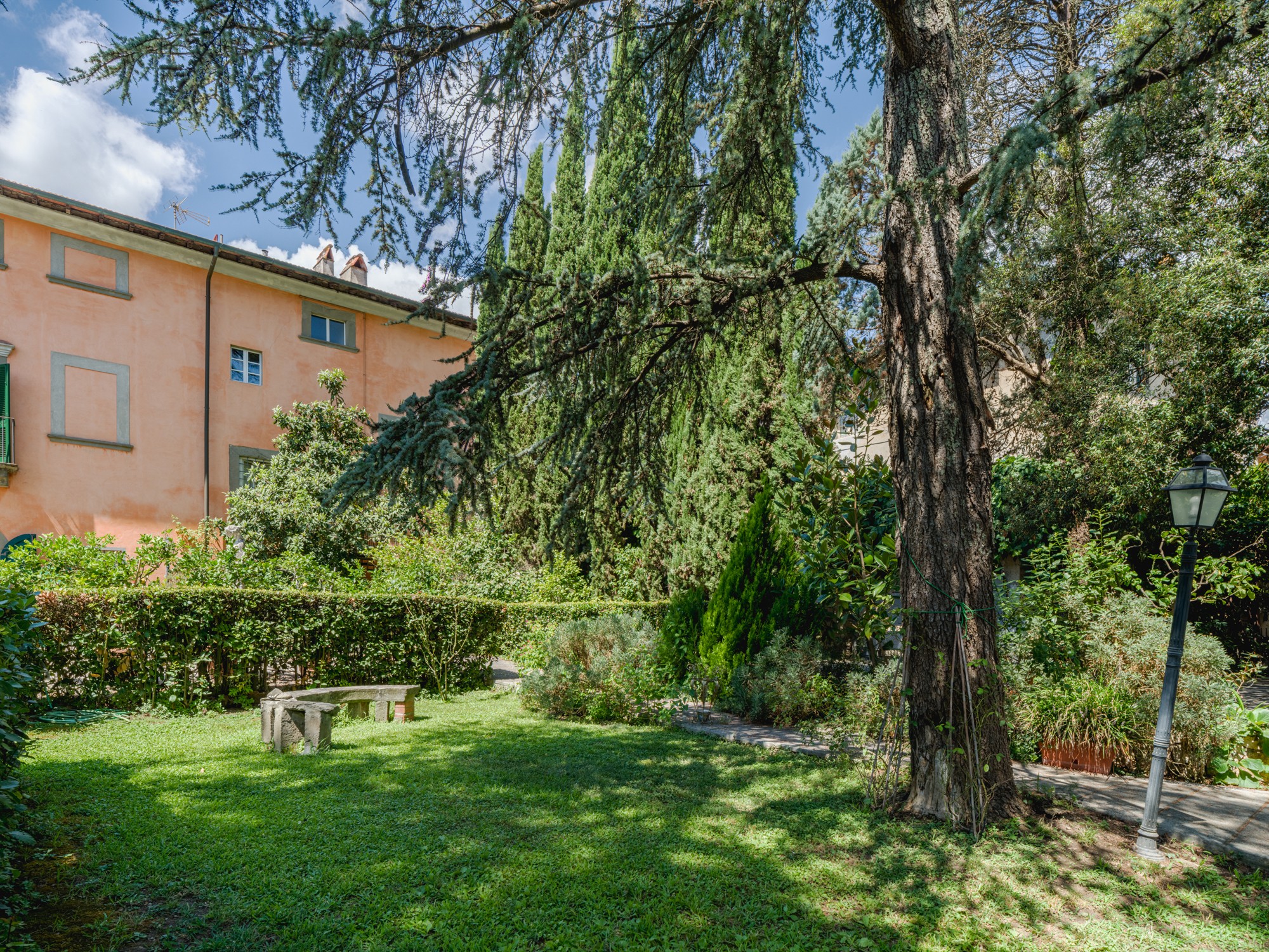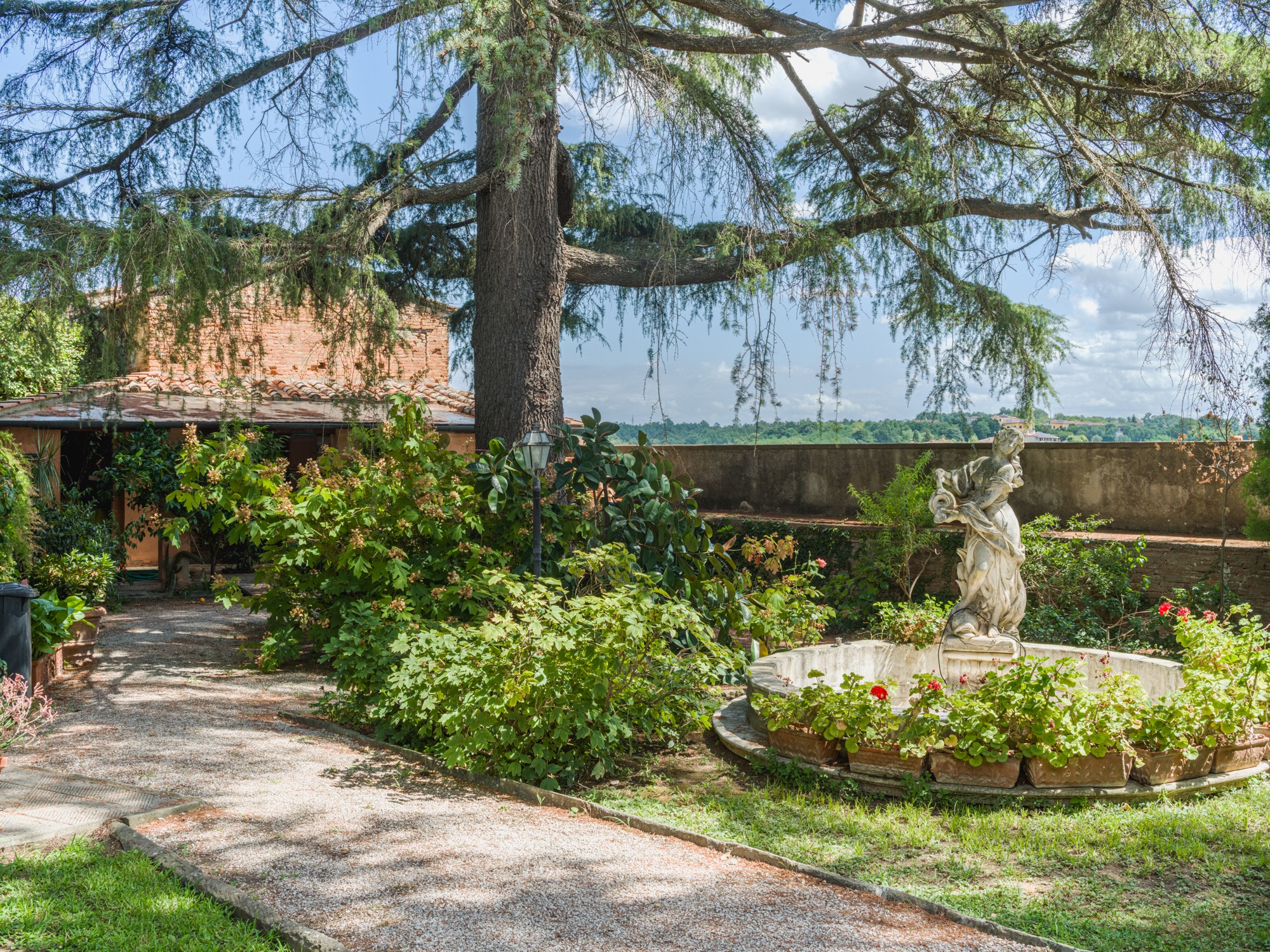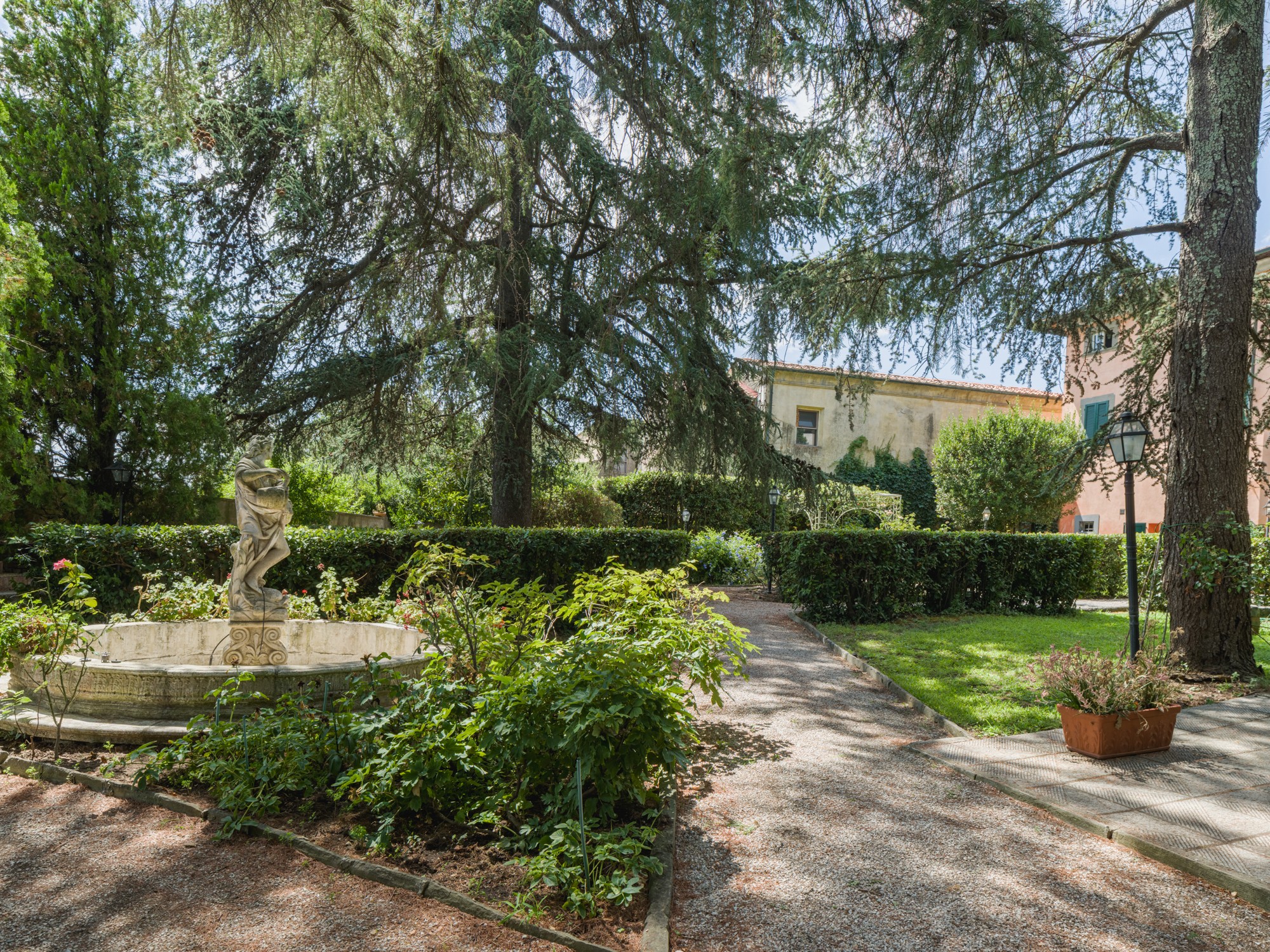 Le domaine, doté d’arbres anciens, s’étend comme un parc et offre une vue dégagée sur le paysage toscan. Un jardin formel à l’italienne jouxte directement le bâtiment. Une autorisation de construction pour une piscine (15 × 8 m, profondeur 1,6 m) a été accordée. D’autres surfaces sont disponibles pour un usage horticole ou de loisirs.