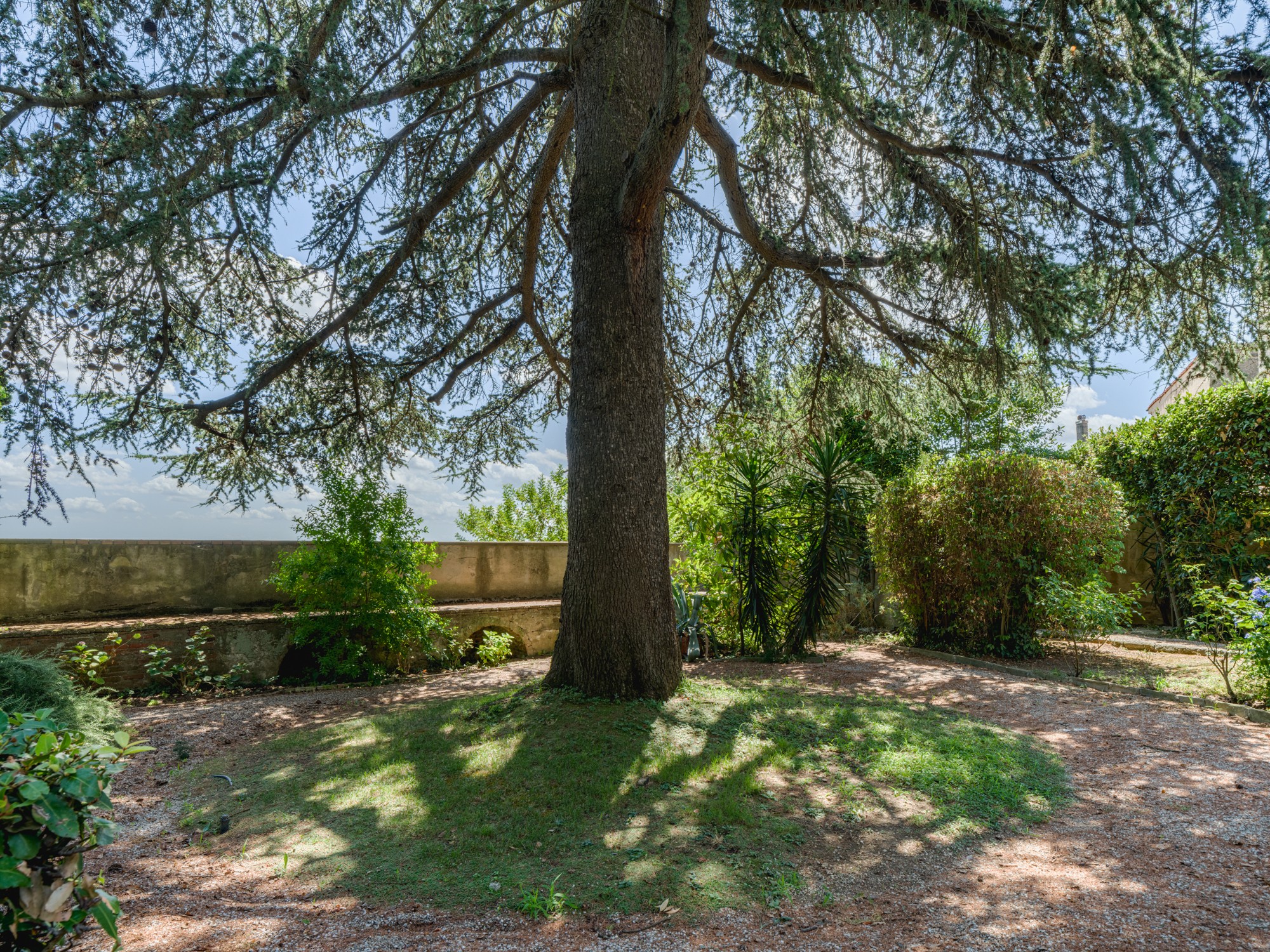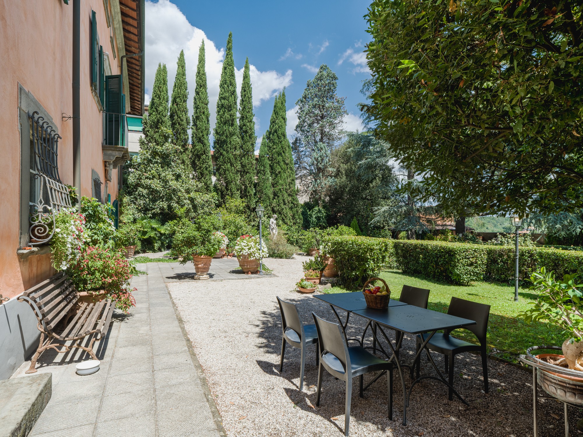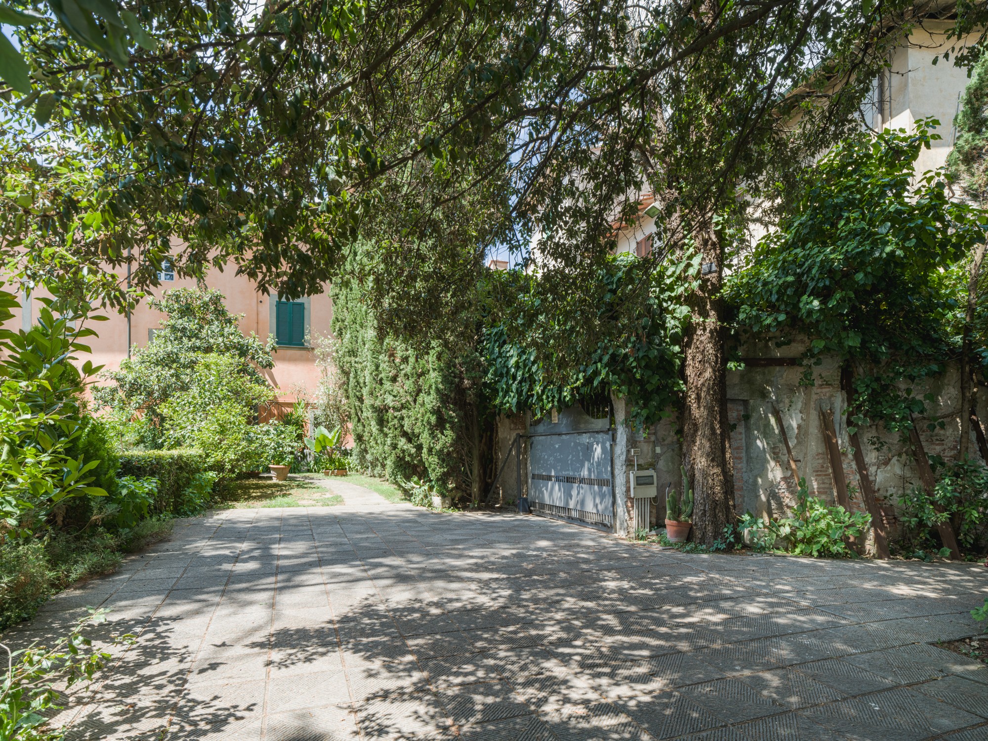 Le domaine, doté d’arbres anciens, s’étend comme un parc et offre une vue dégagée sur le paysage toscan. Un jardin formel à l’italienne jouxte directement le bâtiment. Une autorisation de construction pour une piscine (15 × 8 m, profondeur 1,6 m) a été accordée. D’autres surfaces sont disponibles pour un usage horticole ou de loisirs.