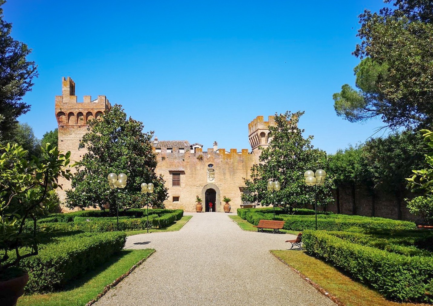 La fortification d’origine a été transformée au fil des siècles en un élégant château résidentiel, tout en préservant ses tours, remparts et chemins défensifs périphériques, aujourd’hui accessibles et offrant des vues panoramiques sur la campagne toscane.
