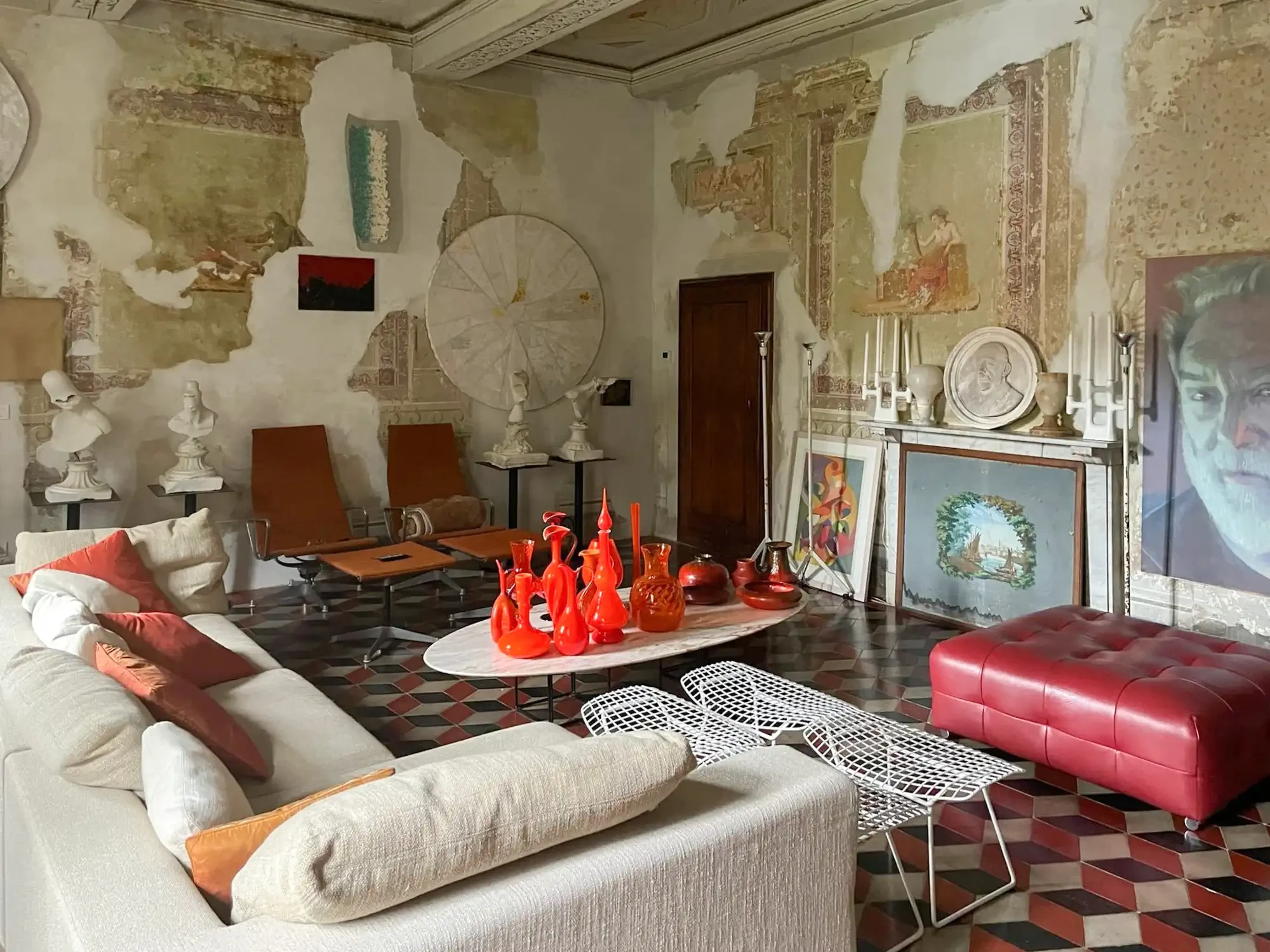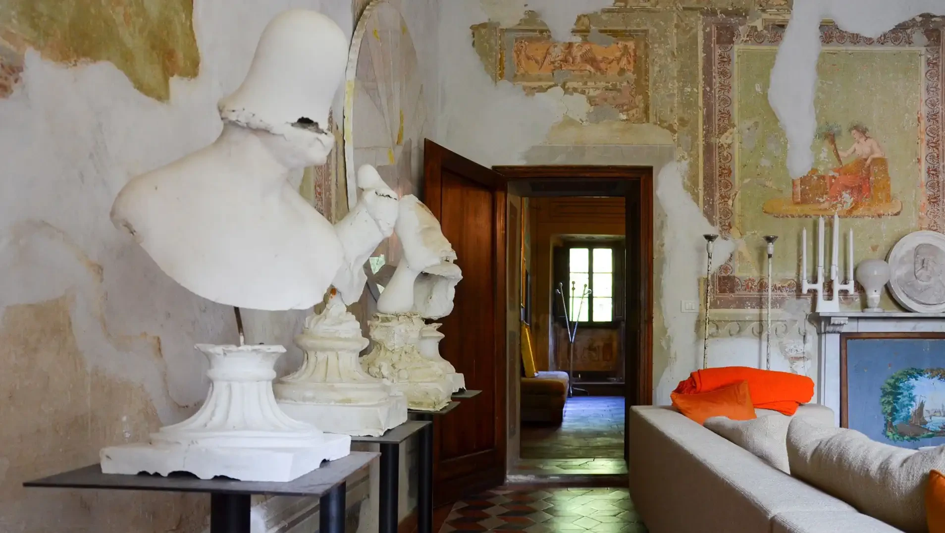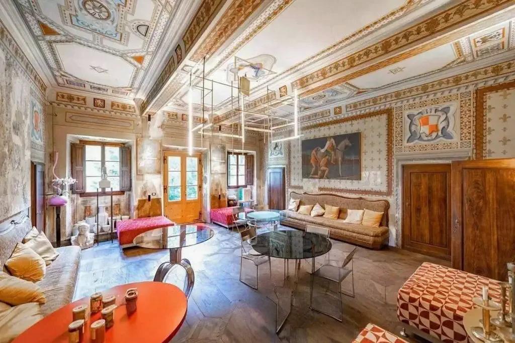 Lors de la restauration la plus récente, plusieurs cycles de fresques ont été mis au jour dans les pièces de réception et de vie. Les peintures murales présentent des motifs floraux et géométriques ainsi que des éléments architecturaux en trompe-l’œil. Un cycle représentant les quatre saisons existait à l’origine, mais une partie a été perdue lors de modifications du XIXᵉ siècle.