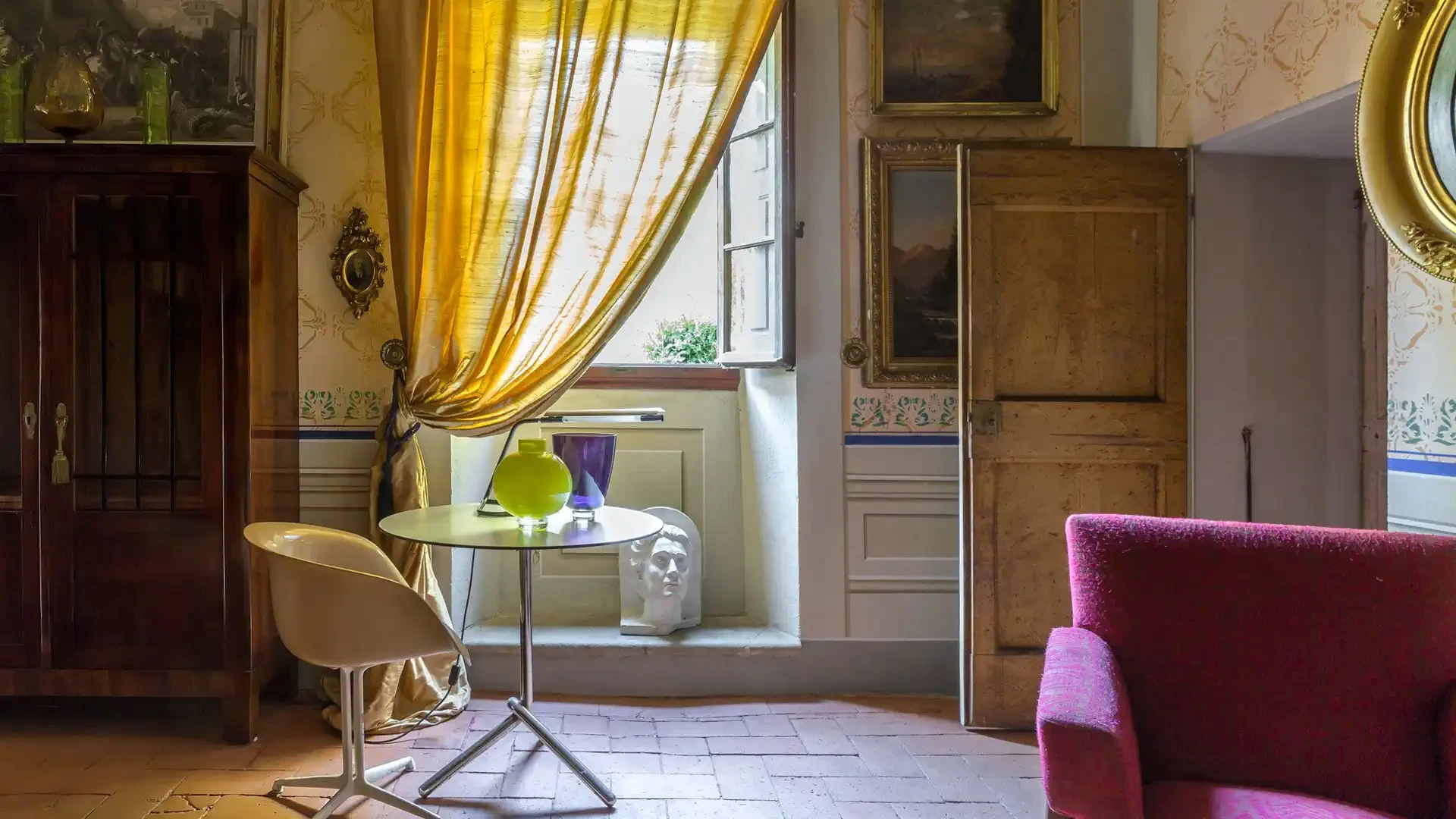 Les sols en terre cuite d’époque et les portes en bois ancien ont été conservés et s’intègrent harmonieusement à l’ensemble.