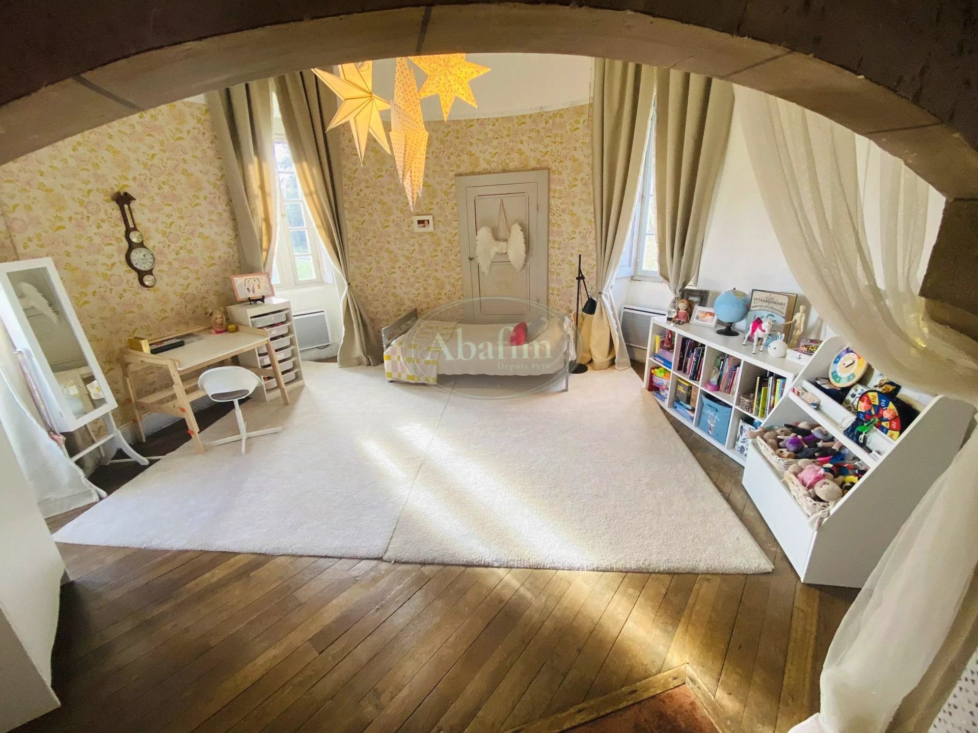 Die oberen Geschosse beherbergen Schlafzimmer, von denen einige renoviert wurden. Die Bibliothek erstreckt sich über drei Räume und 150 Quadratmeter mit historischem Buchbestand.