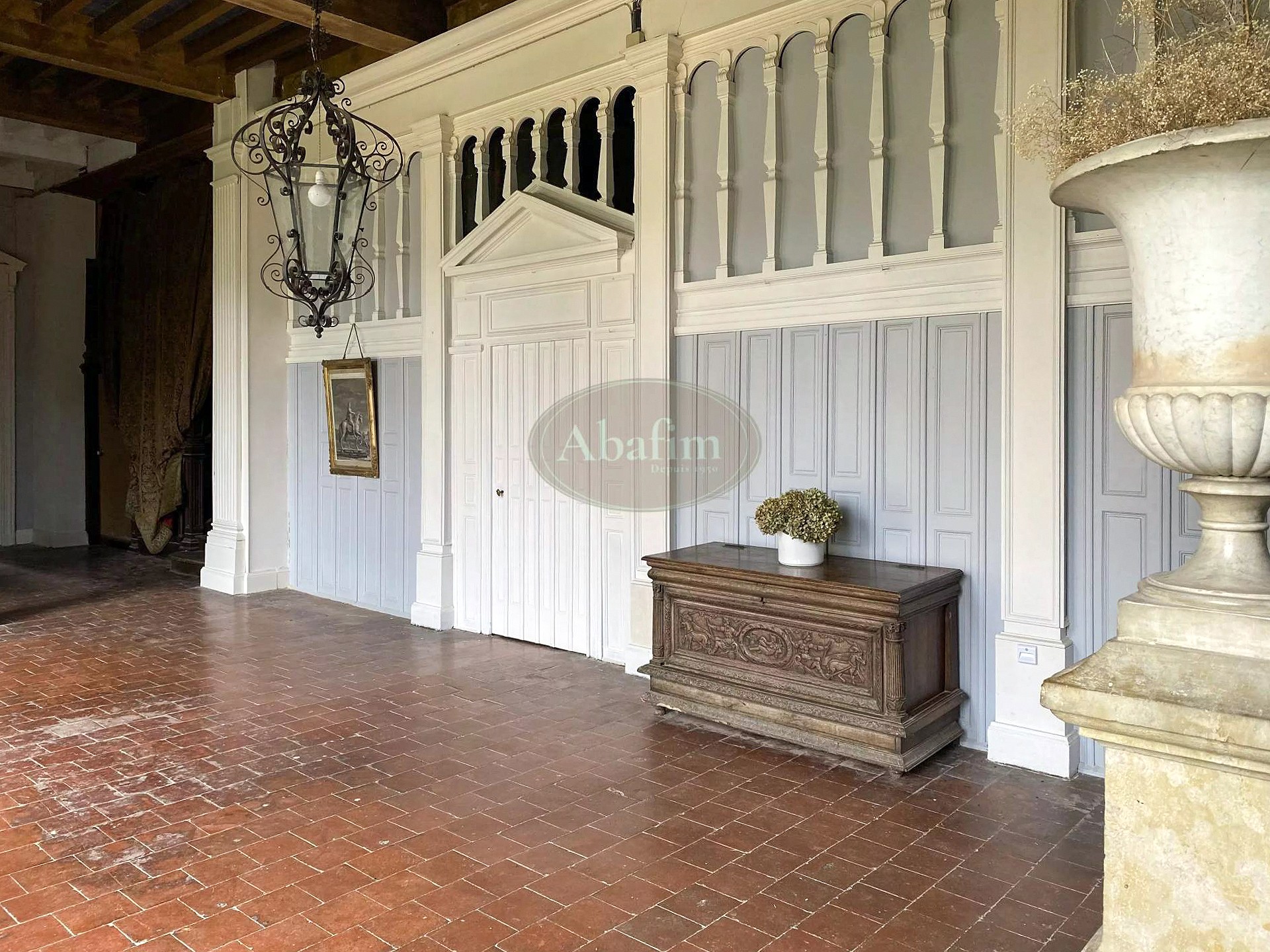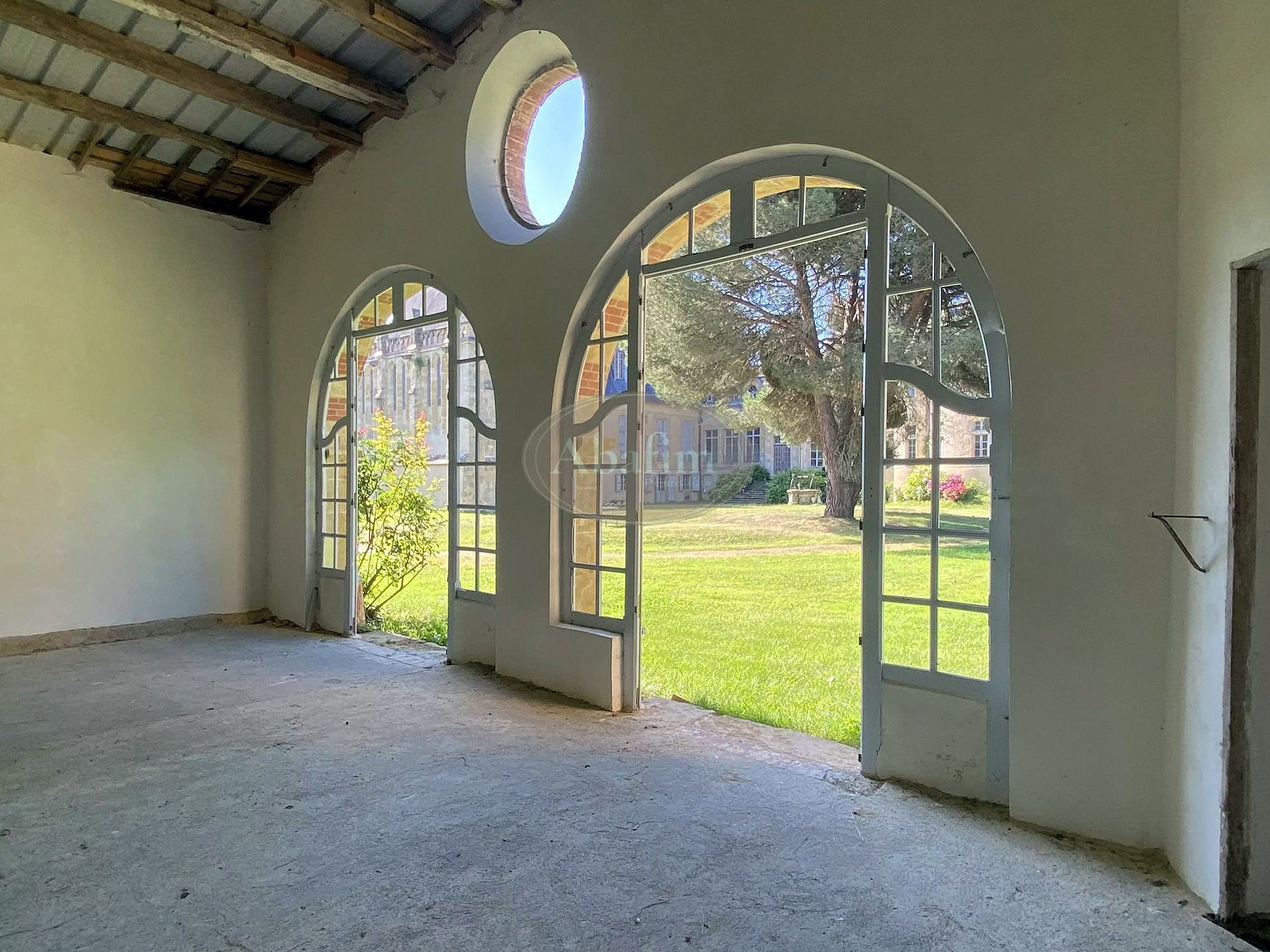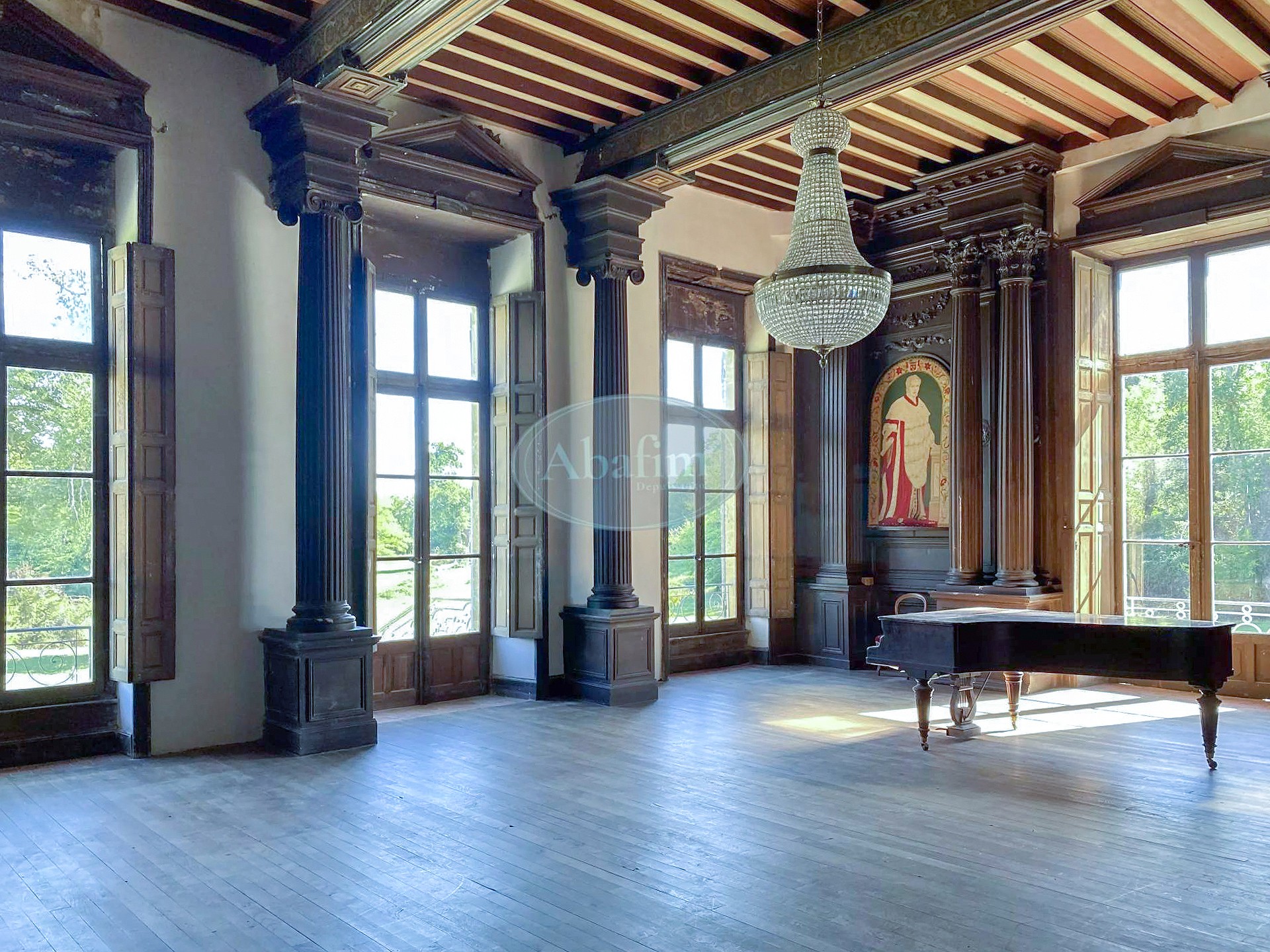 Das Hauptgebäude bietet über 2.000 Quadratmeter Fläche. Die zentrale Eingangshalle mit Terrakottafliesen und Holztäfelung erschließt die Empfangsräume. Zwei Festsäle von jeweils 90 Quadratmetern prägen das Erdgeschoss: der erste mit monumentalem Kamin, Eichenparkett und Kassettendecke, der zweite mit geschnitzten Säulen, Täfelung und Wandteppichen der Gründerfamilien. Dieser öffnet sich über eine Freitreppe zum Park. Die über fünf Meter hohen Decken und die zahlreichen Fenster schaffen lichtdurchflutete Räume. Ein 45 Quadratmeter großer, vollständig getäfelter Salon schließt die Enfilade ab.