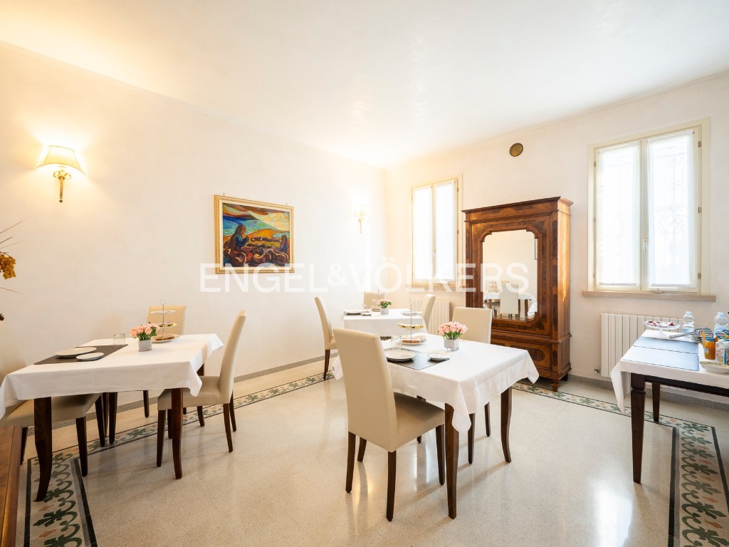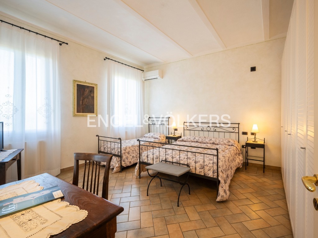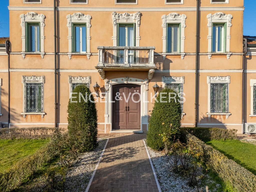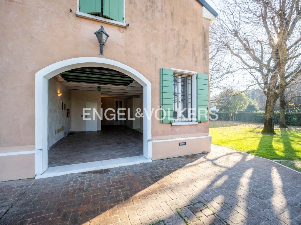 La demeure offre environ 400 m² de surface habitable, entourée d’un parc privé. Le rez-de-chaussée comprend un salon, une cuisine, un bureau et une salle de bains pour les invités. Le premier étage comprend trois chambres et deux salles de bains. Une unité indépendante au dernier étage complète la maison principale. La propriété comprend également un appartement sur deux niveaux, un grand garage avec buanderie et mezzanine, ainsi qu’une barchessa traditionnelle avec patio et deux garages supplémentaires. Le jardin offre quatre places de stationnement extérieures supplémentaires.