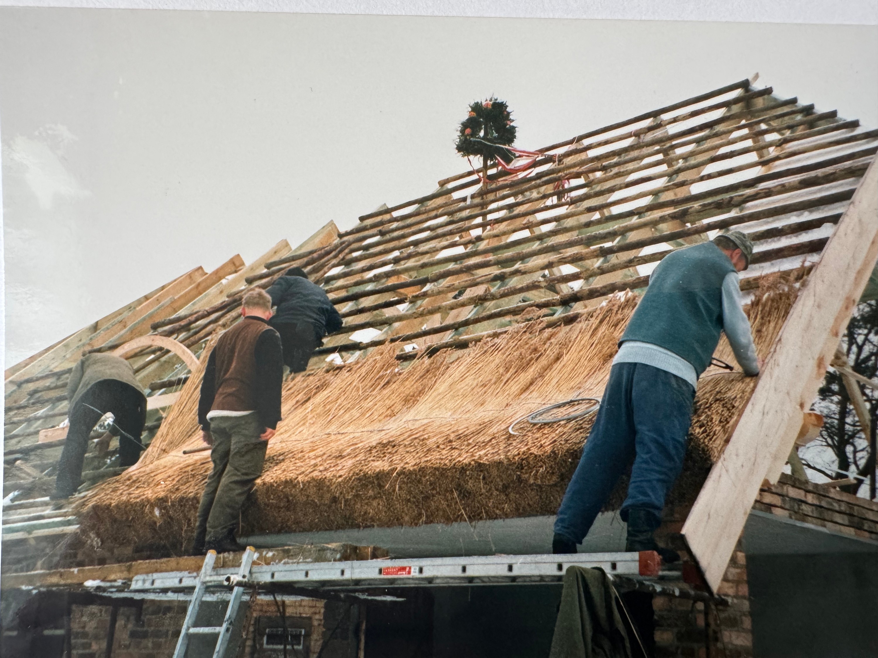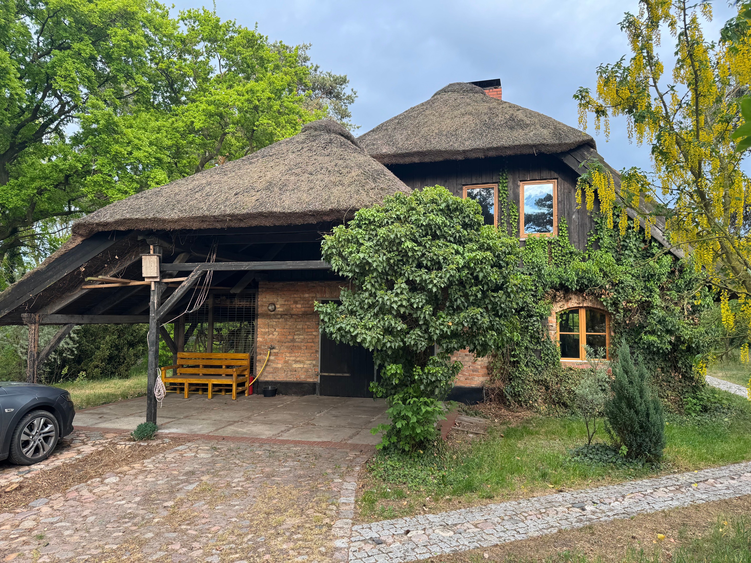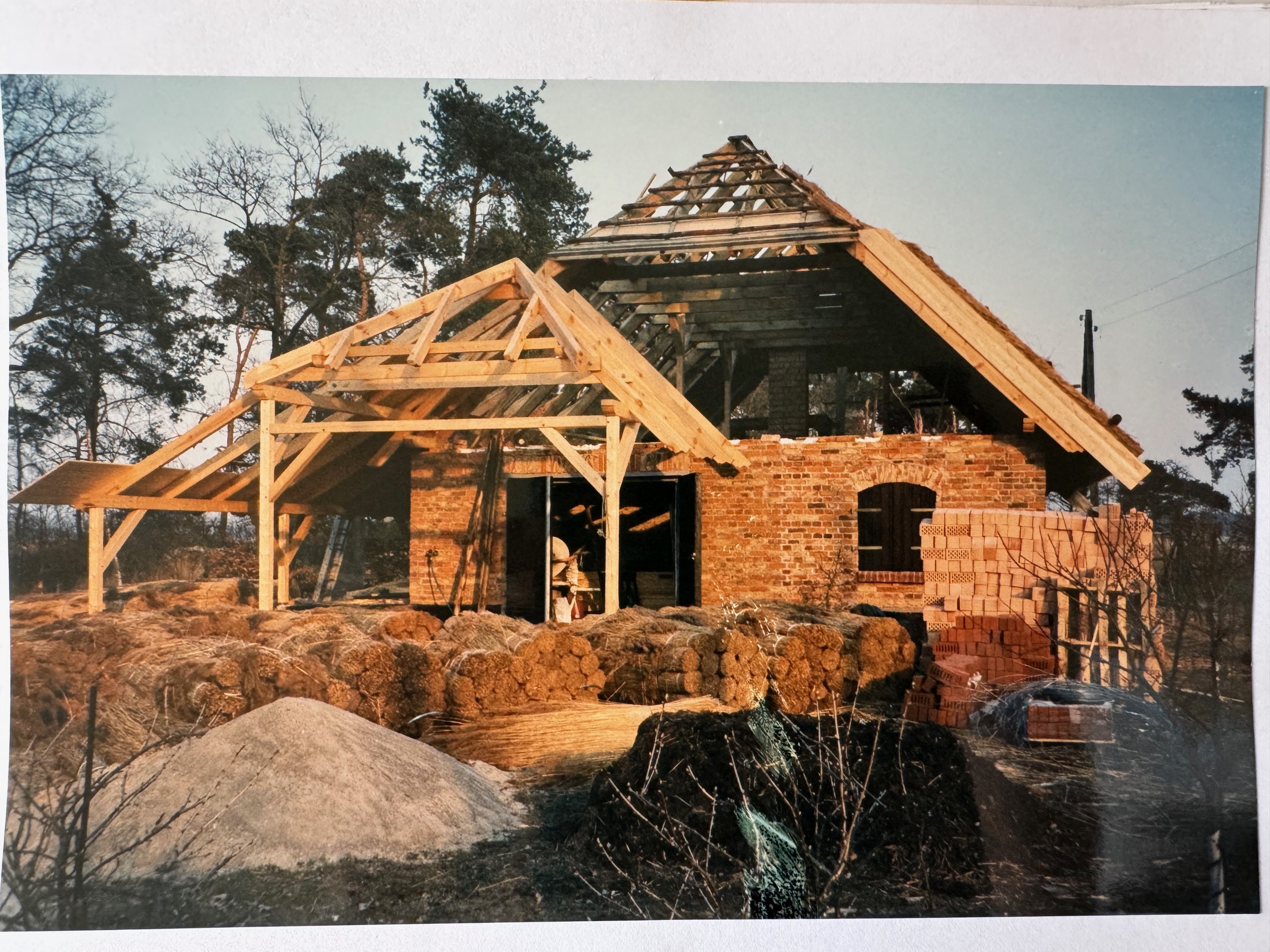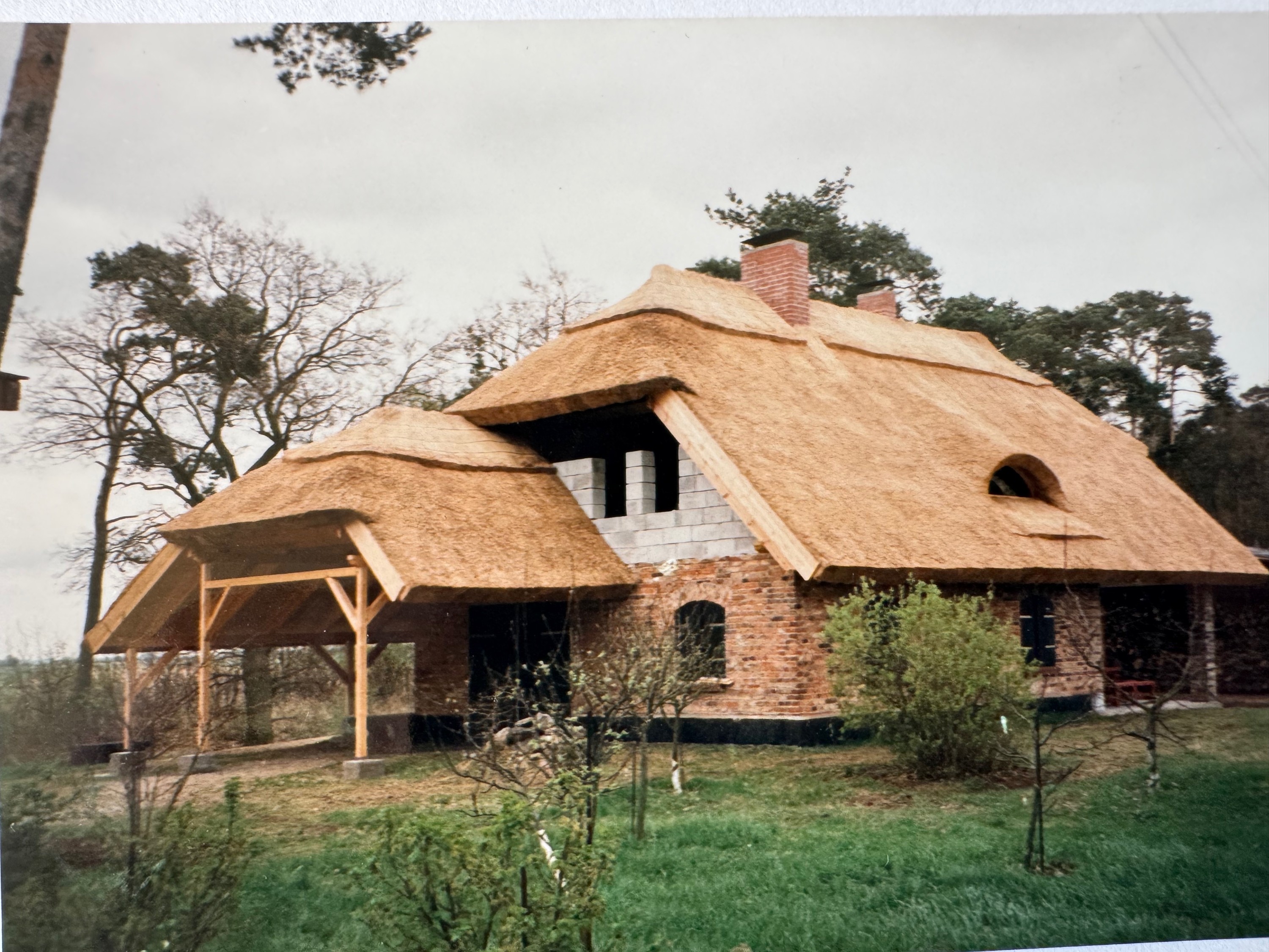 La maçonnerie massive avec ses fenêtres en arc a été réalisée à partir des briques d’origine à haute cuisson. La maison repose sur des fondations en béton entièrement renouvelées avec barrière horizontale contre l’humidité. Une ceinture en béton armé dissimulée assure l’ancrage stable de la charpente du nouveau toit à chevrons. La couverture en chaume a été réalisée selon la technique traditionnelle propre à la Poméranie occidentale, cousue à la main et particulièrement résistante.