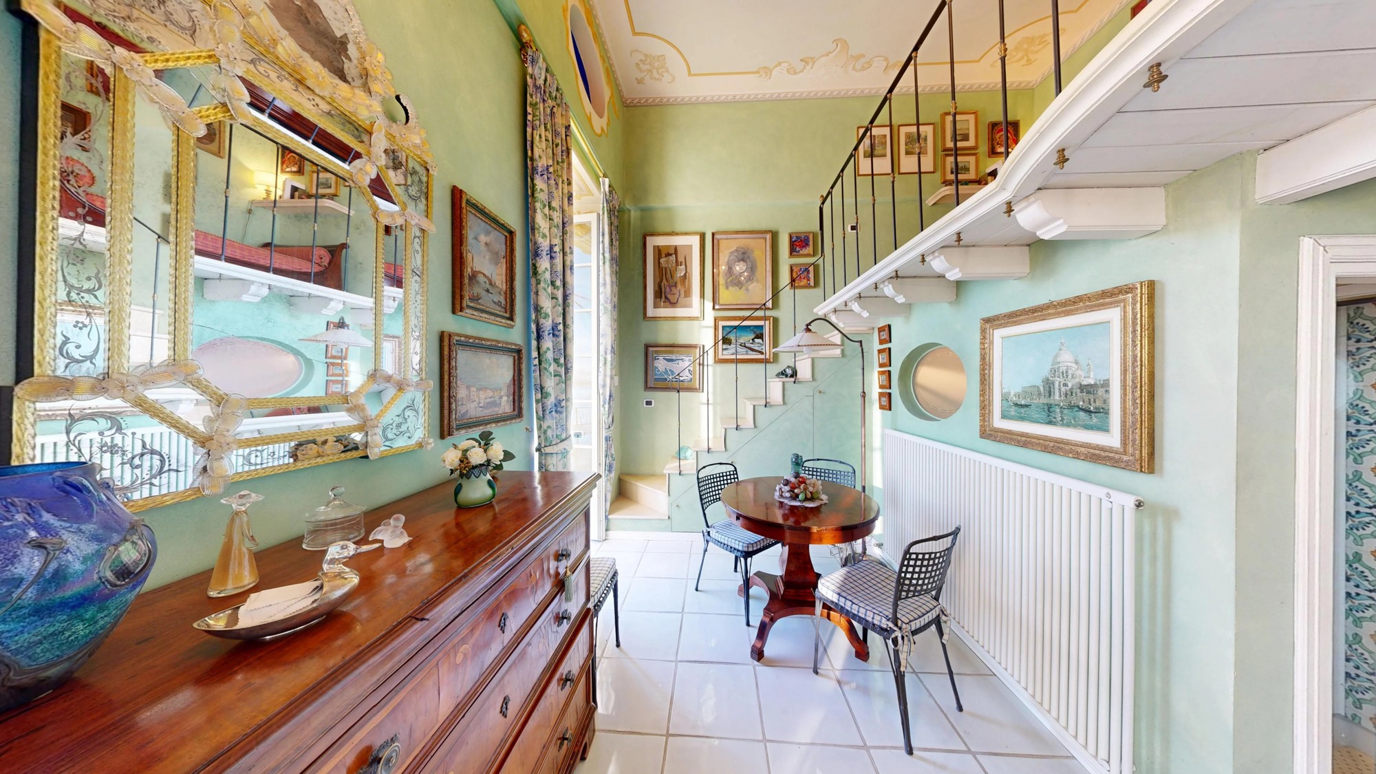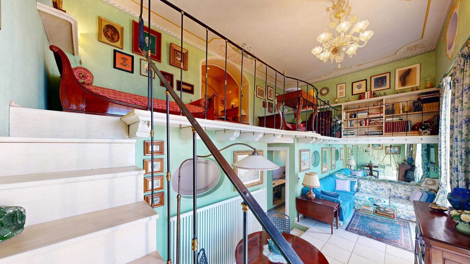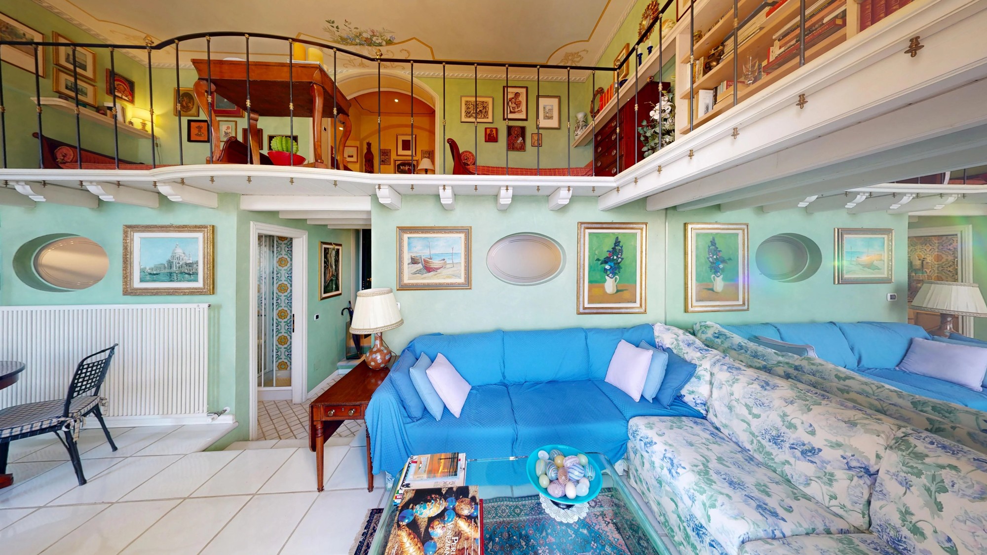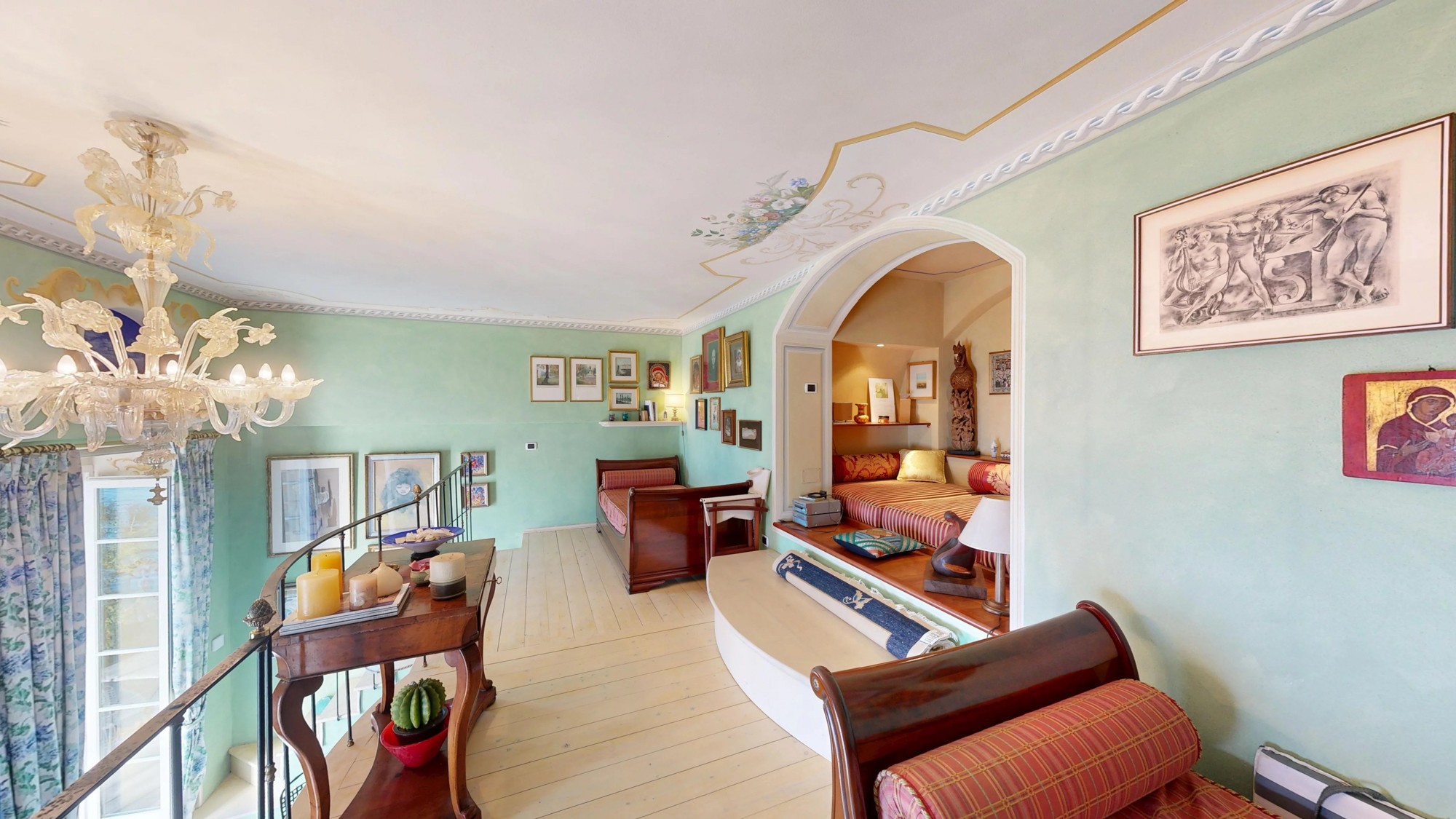 Der Wohnbereich im Erdgeschoss öffnet sich zu einer großen Terrasse mit Blick auf den See. Die Ebene umfasst weiterhin eine Küchenzeile und Bad mit Vietri-Keramik. Im Mezzanin liegt der Schlafbereich mit eingebautem Bett und maßgefertigtem Bücherregal. Pastellfarbene Freskendecken und venezianische Stuckaturen prägen die Innenräume.