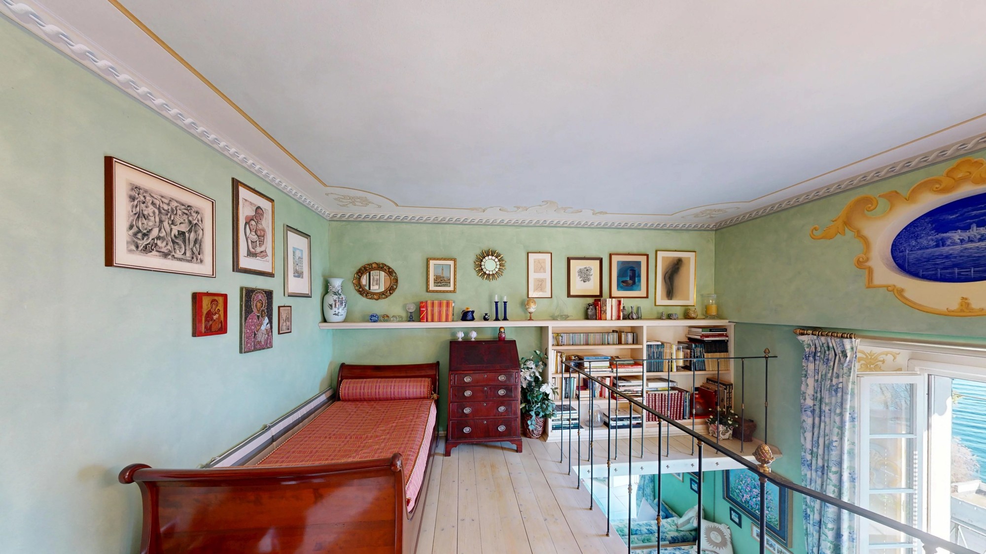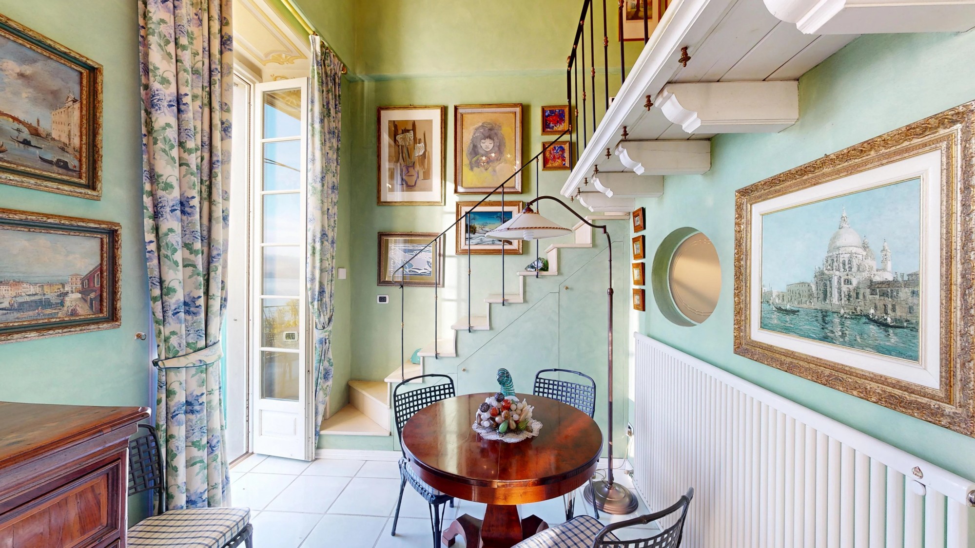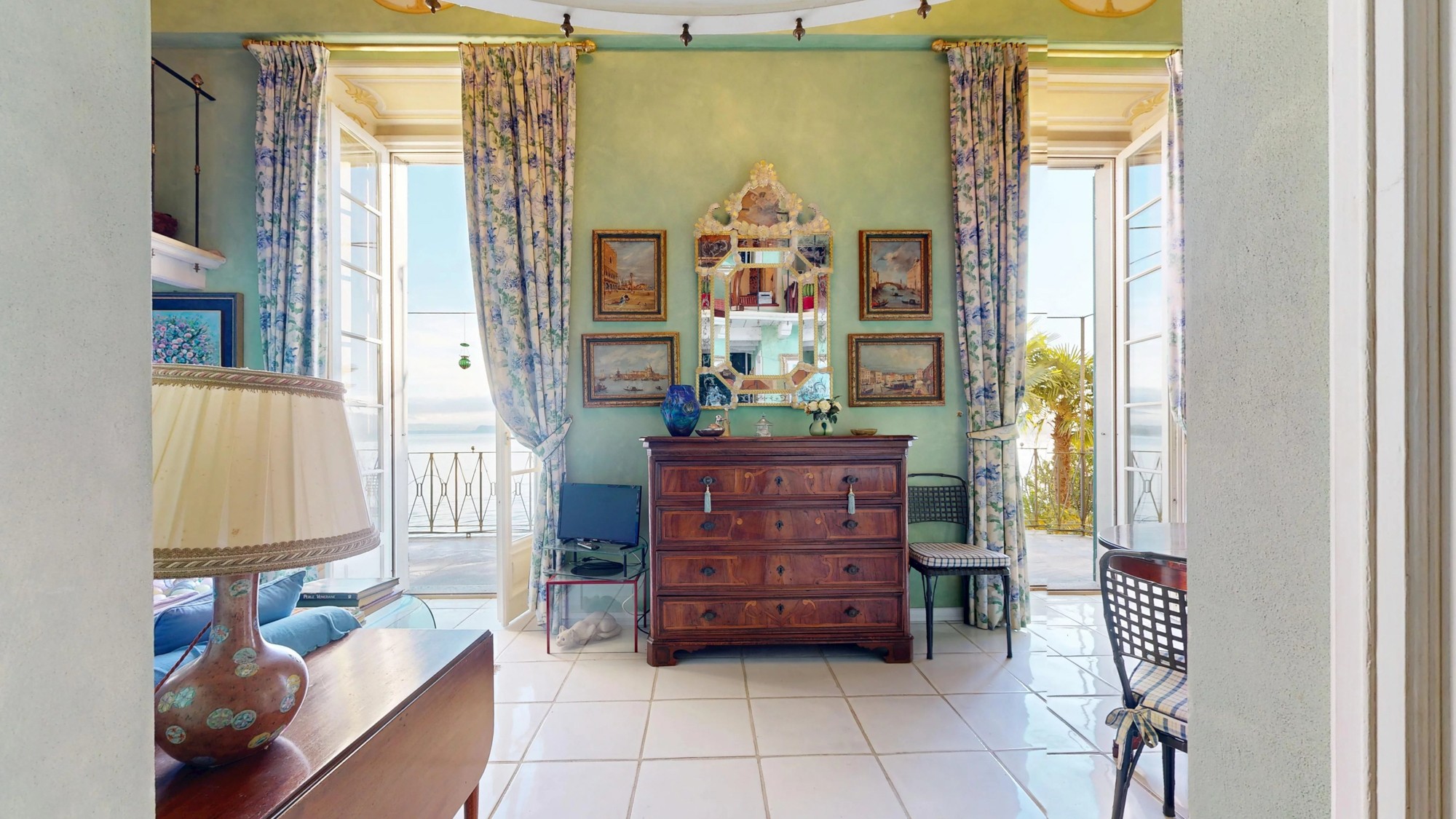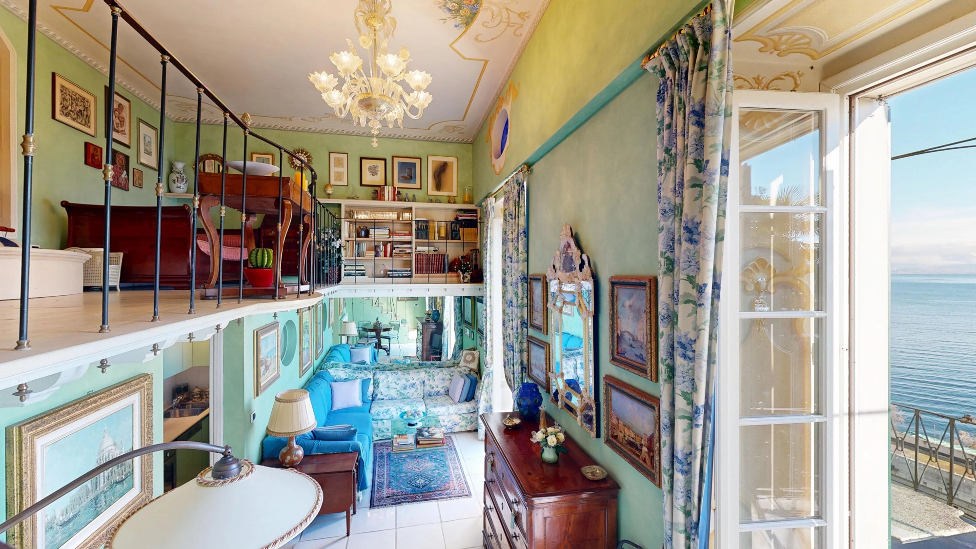 Der Wohnbereich im Erdgeschoss öffnet sich zu einer großen Terrasse mit Blick auf den See. Die Ebene umfasst weiterhin eine Küchenzeile und Bad mit Vietri-Keramik. Im Mezzanin liegt der Schlafbereich mit eingebautem Bett und maßgefertigtem Bücherregal. Pastellfarbene Freskendecken und venezianische Stuckaturen prägen die Innenräume.