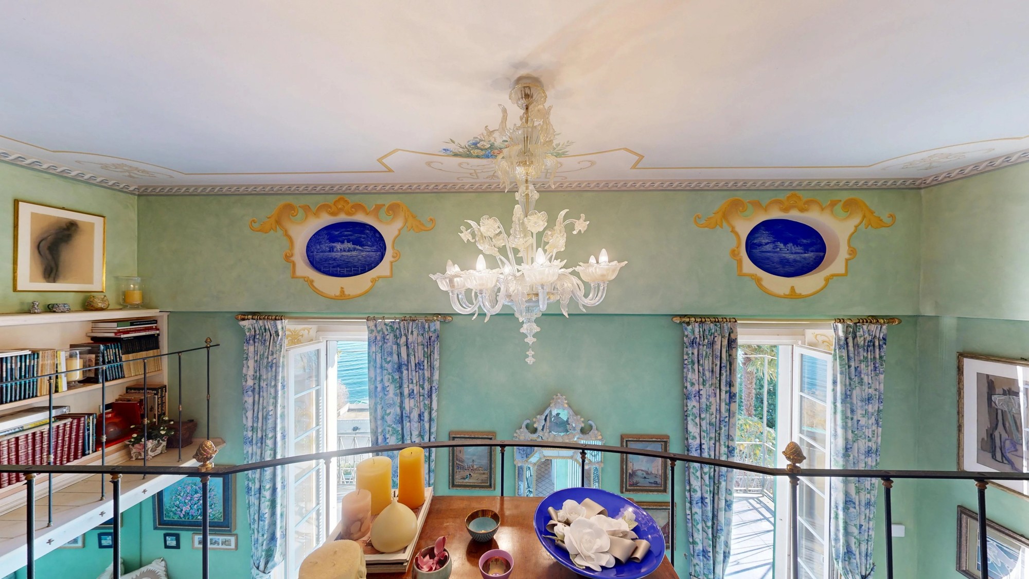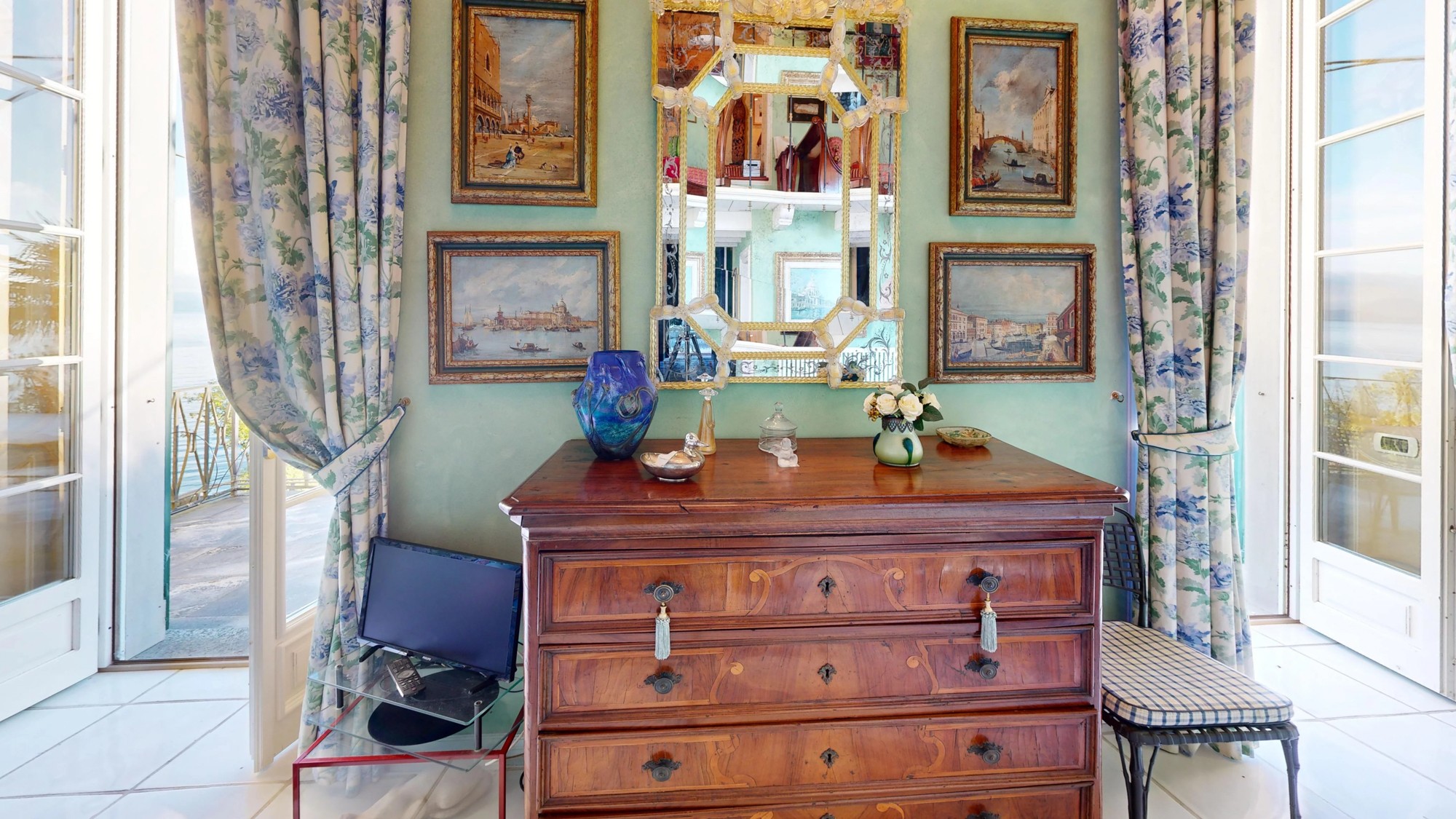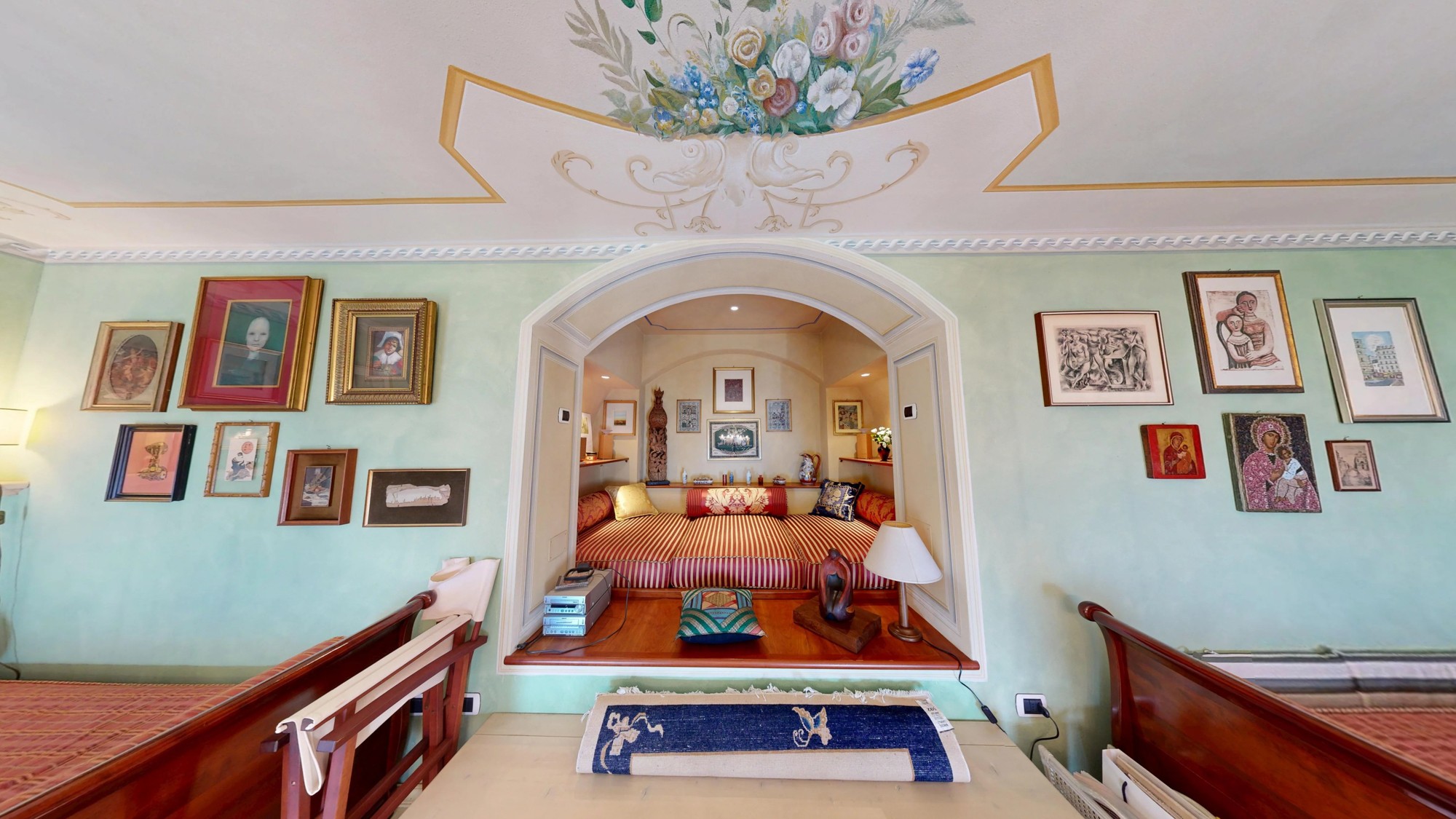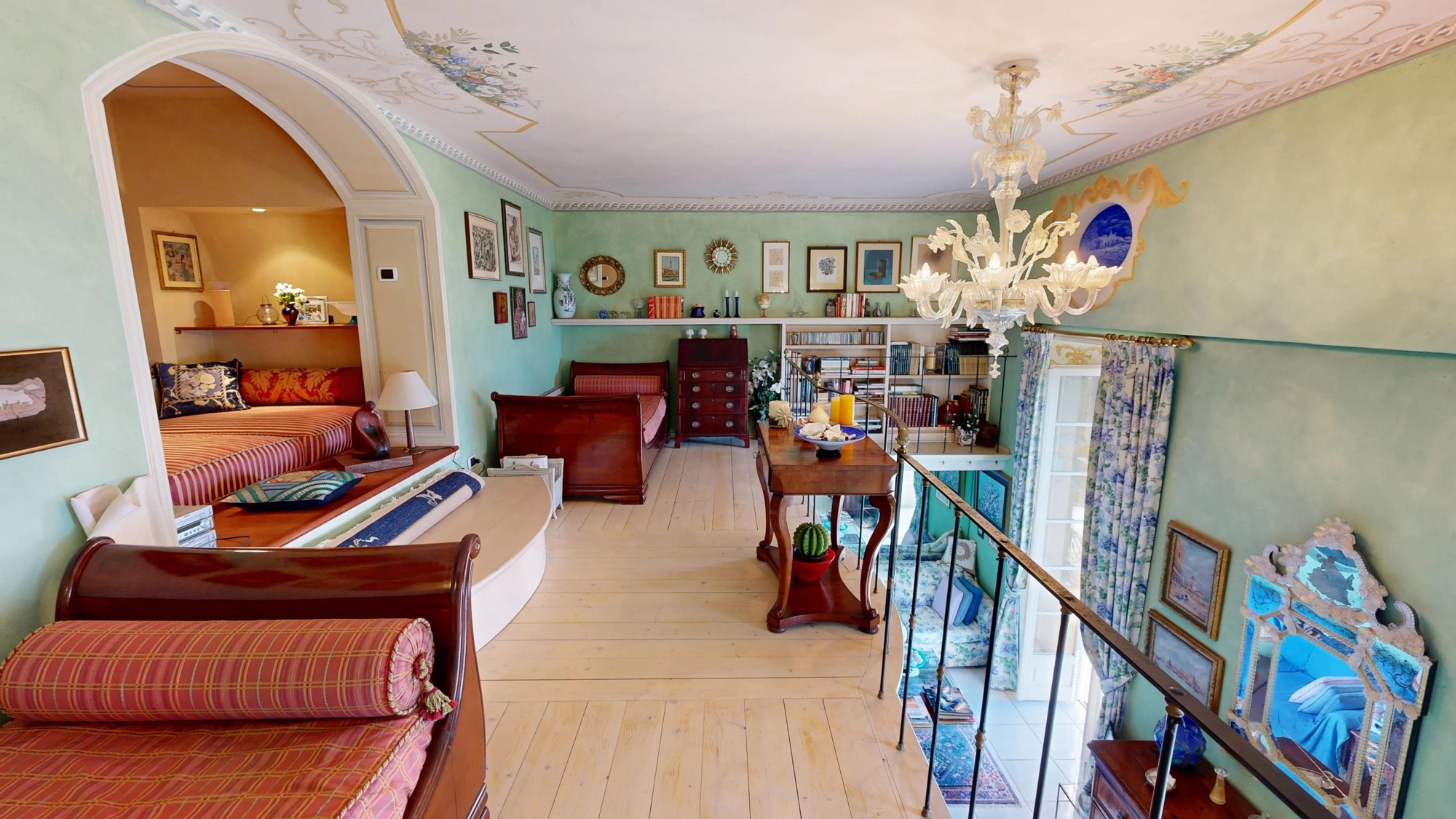 Der Wohnbereich im Erdgeschoss öffnet sich zu einer großen Terrasse mit Blick auf den See. Die Ebene umfasst weiterhin eine Küchenzeile und Bad mit Vietri-Keramik. Im Mezzanin liegt der Schlafbereich mit eingebautem Bett und maßgefertigtem Bücherregal. Pastellfarbene Freskendecken und venezianische Stuckaturen prägen die Innenräume.