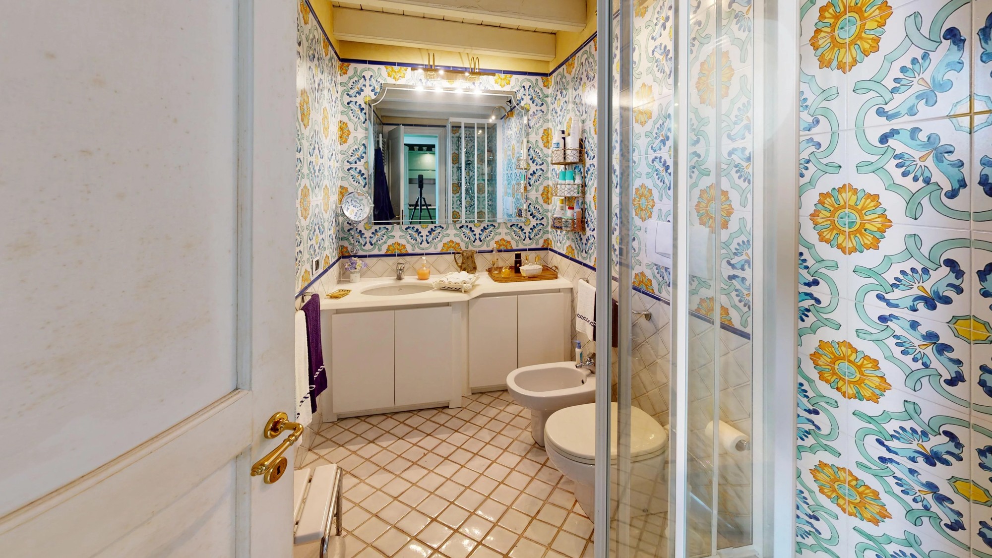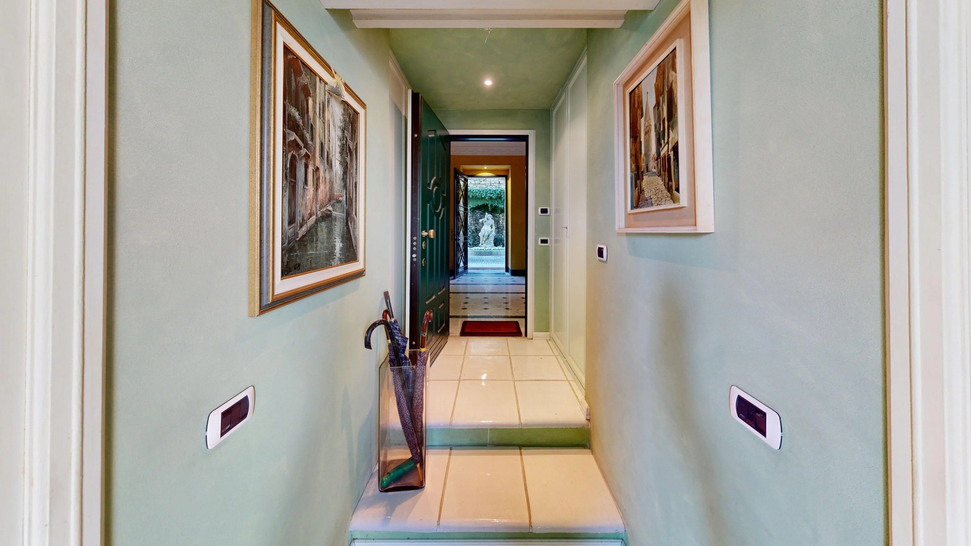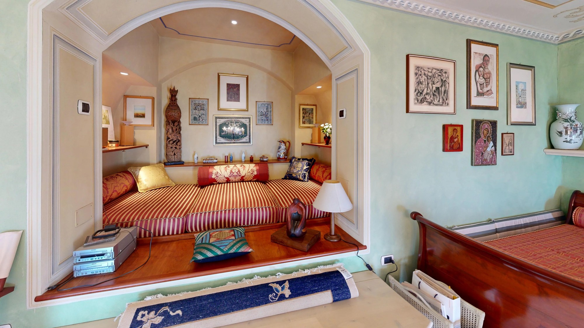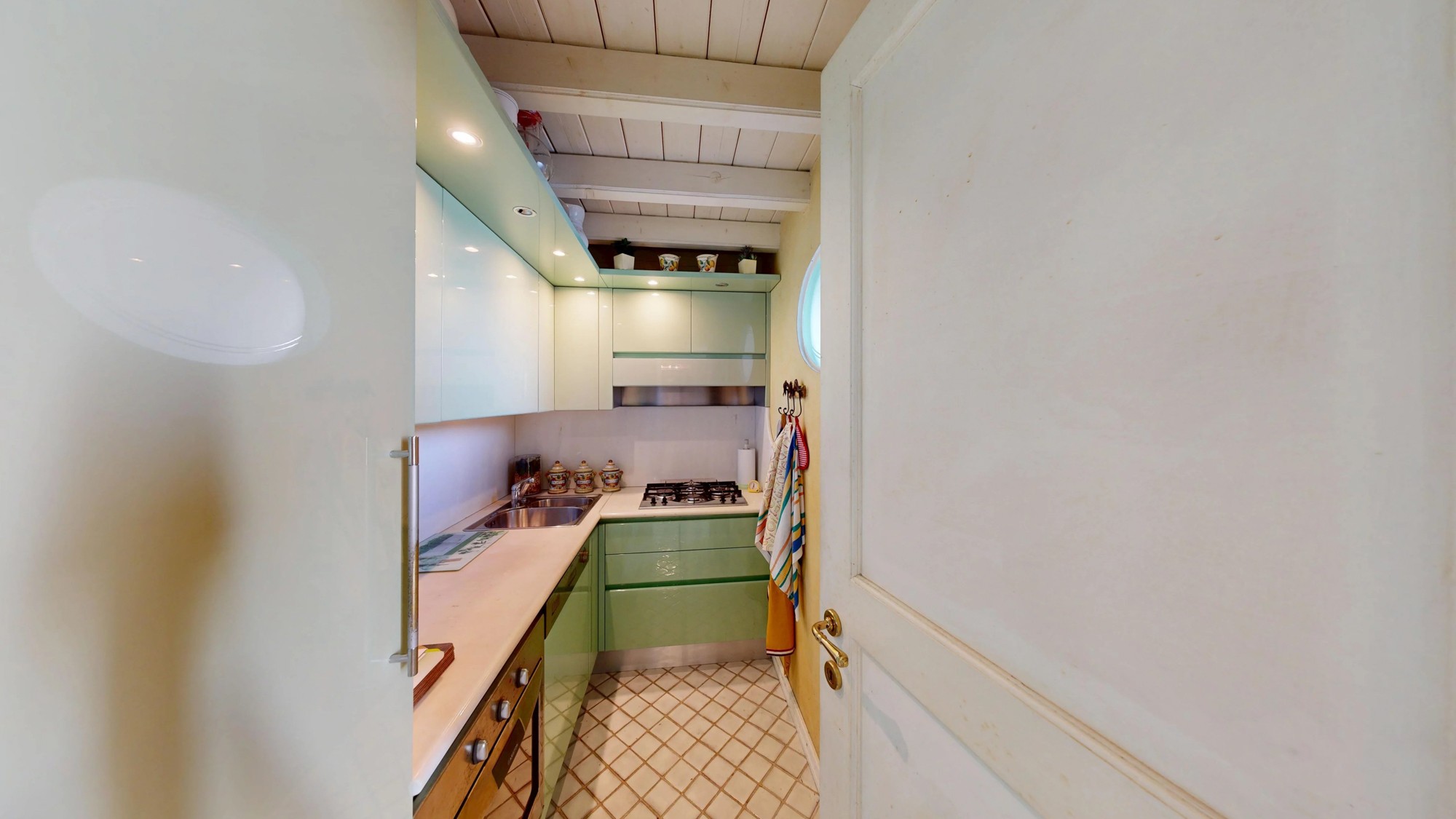 Der Wohnbereich im Erdgeschoss öffnet sich zu einer großen Terrasse mit Blick auf den See. Die Ebene umfasst weiterhin eine Küchenzeile und Bad mit Vietri-Keramik. Im Mezzanin liegt der Schlafbereich mit eingebautem Bett und maßgefertigtem Bücherregal. Pastellfarbene Freskendecken und venezianische Stuckaturen prägen die Innenräume.
