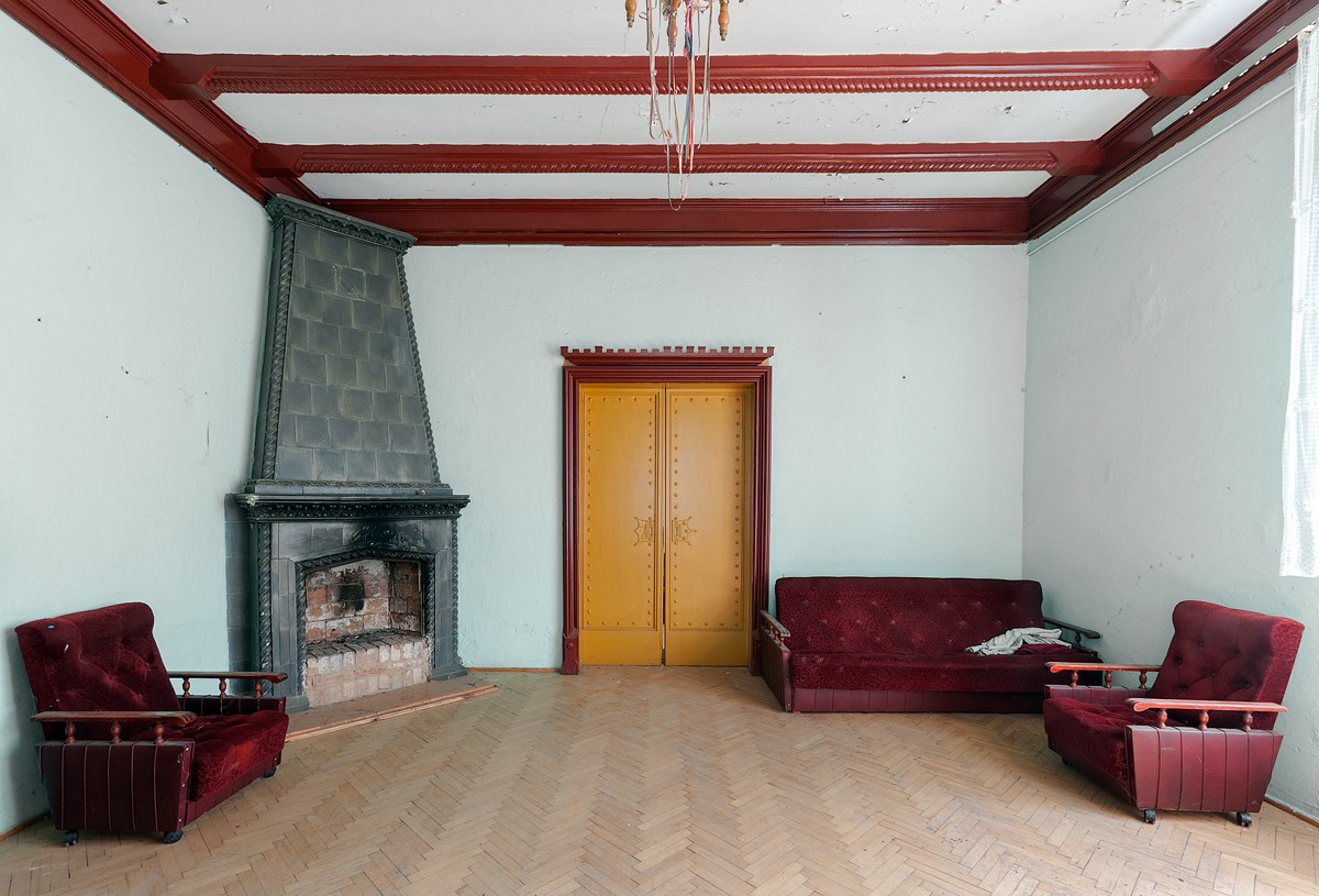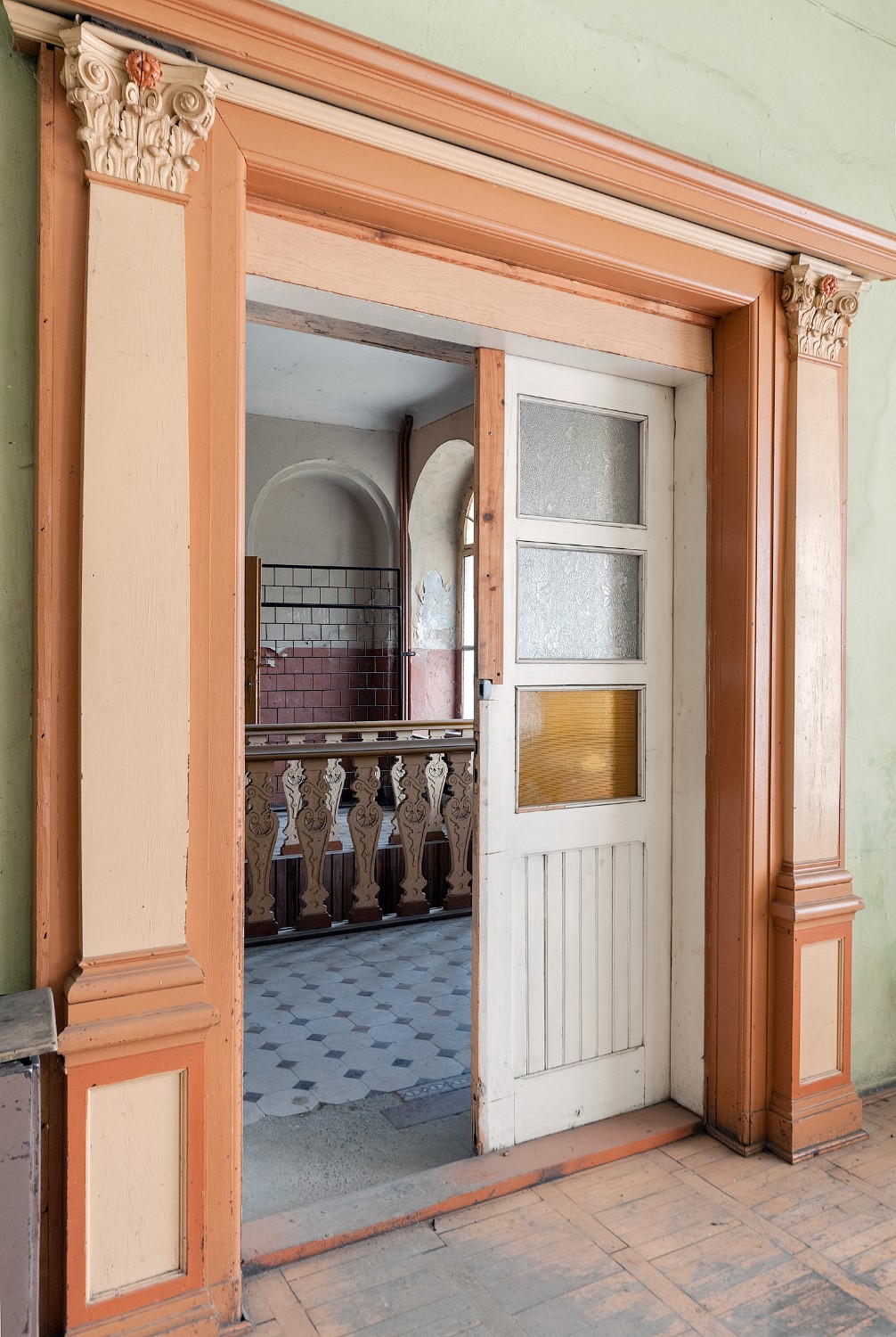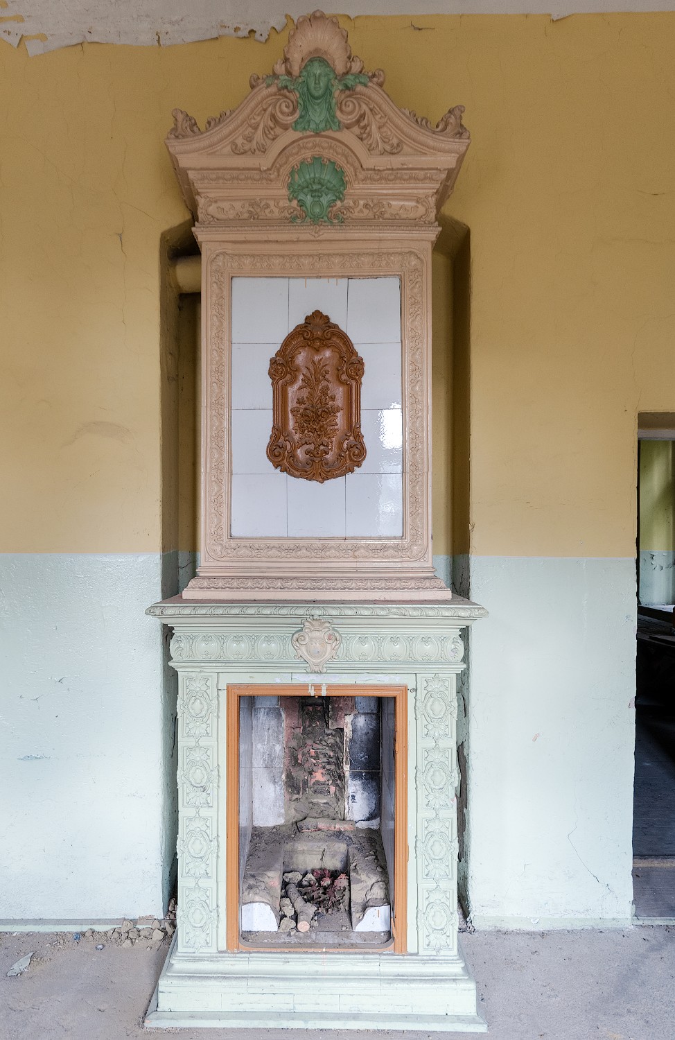 Ein gerader Treppenaufgang führt in die geräumige Halle im Oberschoss mit Zugang zu repräsentativen Bereichen und zum einst reich dekorierten Festsaal, der seinen repräsentativen Charakter im Zuge der Nachkriegsnutzungen verloren hat. Daneben ist die originale Raumanordnung mit architektonischen Details aus der Entstehungszeit weitgehend erhalten, darunter historische Böden, stuckierte Decken, Bodenfliesen, massive Türen sowie Kamine und Kachelöfen.
