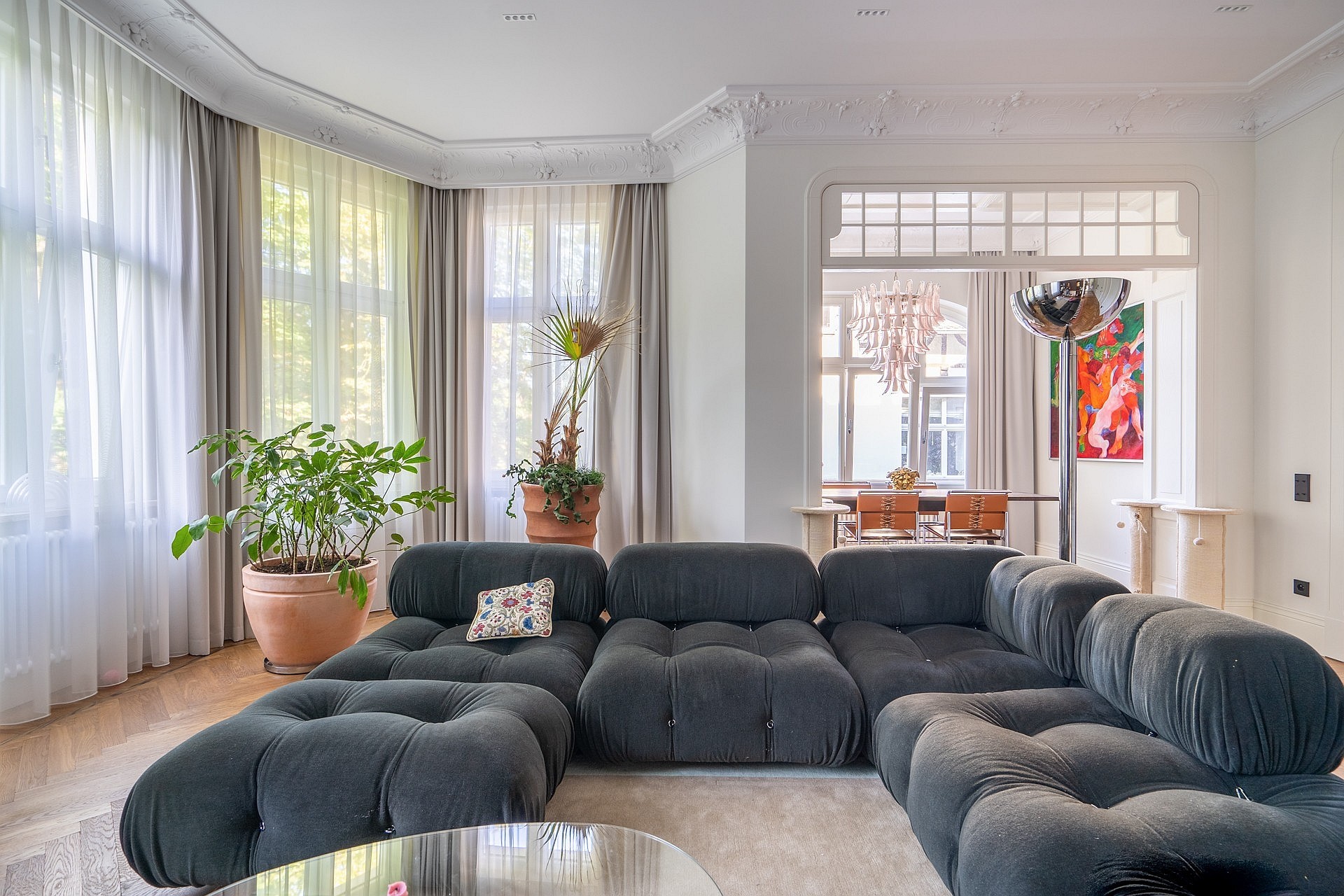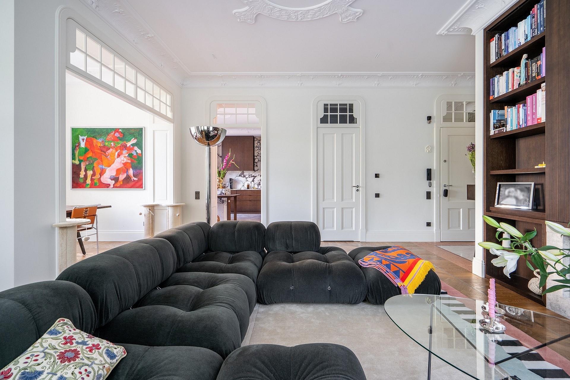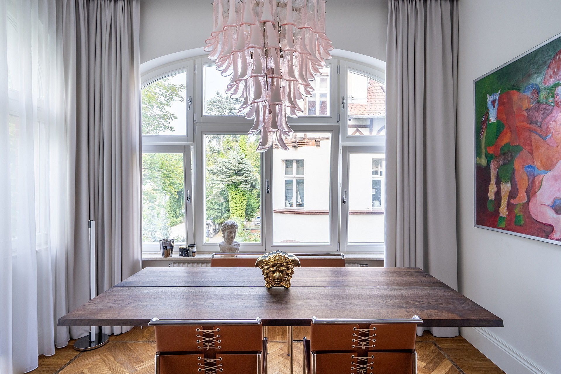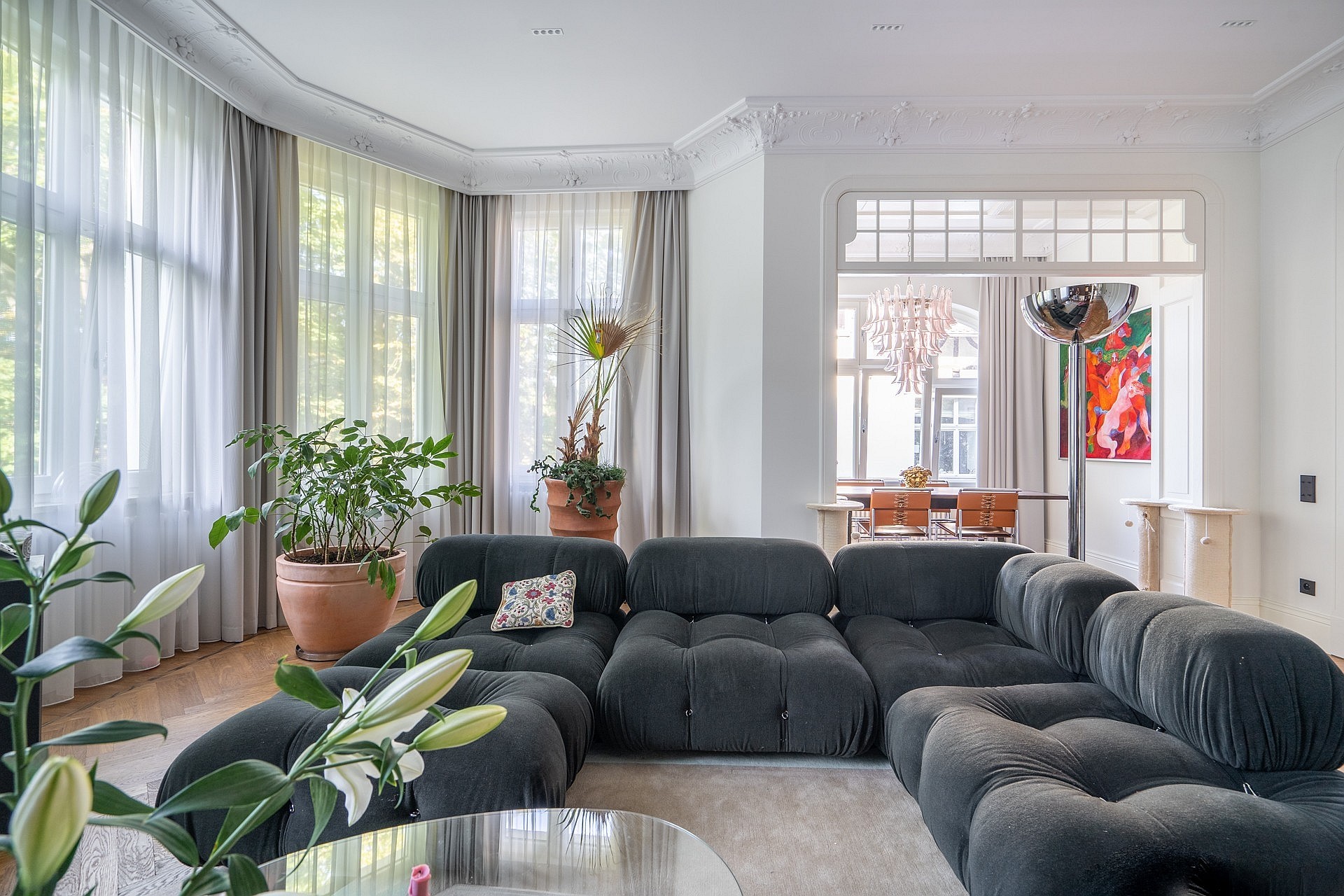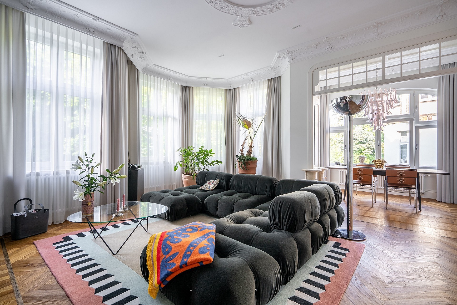 Originaler Eichenparkett im französischen Fischgrätmuster, Stuckverzierungen an Wänden und Decken, maßgefertigte Möbel. Deckenhöhe über drei Meter. Große Fenster sorgen für gute Tageslichtversorgung.