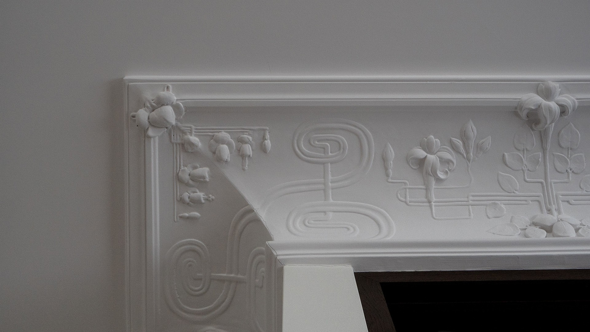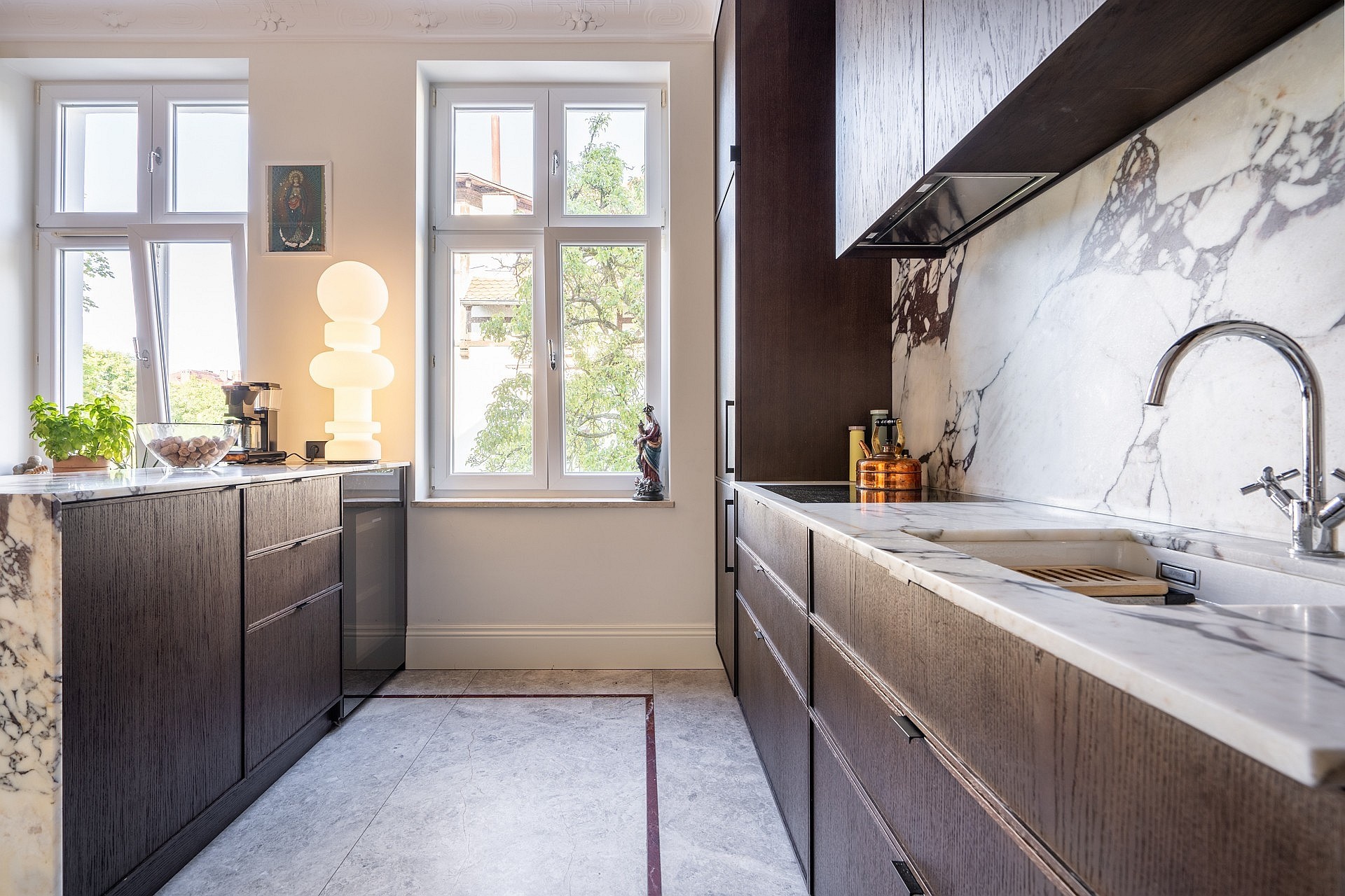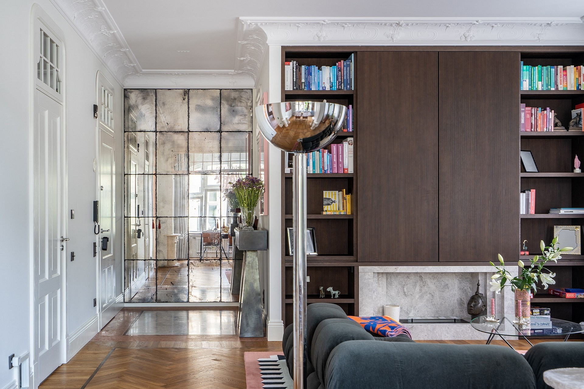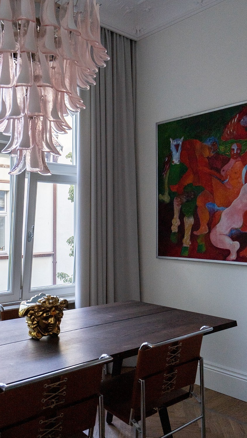 Originaler Eichenparkett im französischen Fischgrätmuster, Stuckverzierungen an Wänden und Decken, maßgefertigte Möbel. Deckenhöhe über drei Meter. Große Fenster sorgen für gute Tageslichtversorgung.