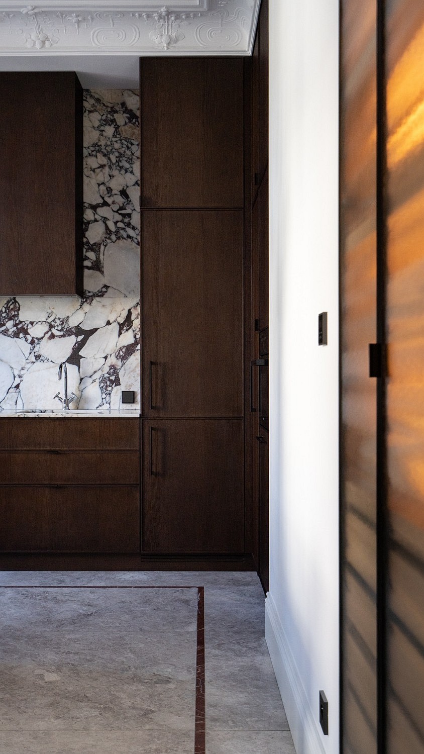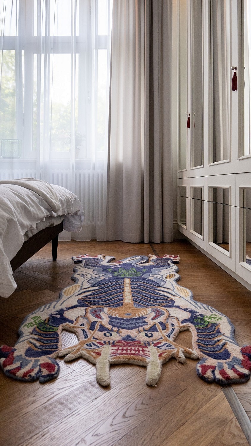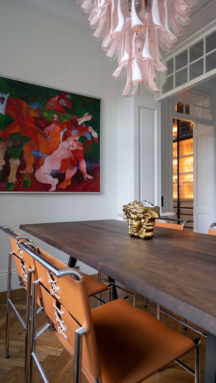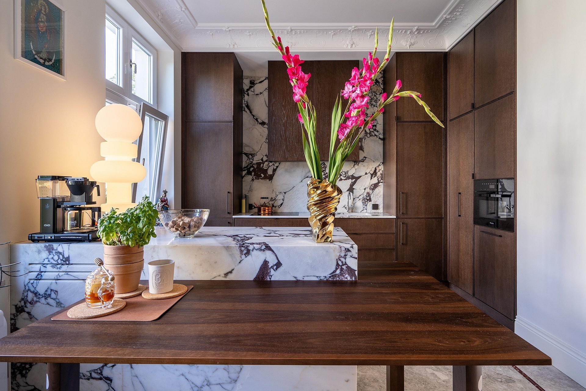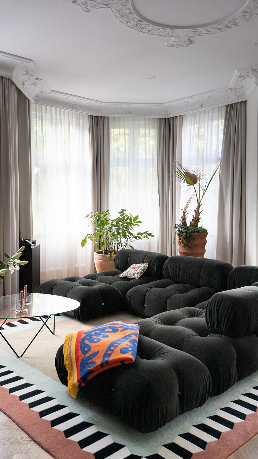 Originaler Eichenparkett im französischen Fischgrätmuster, Stuckverzierungen an Wänden und Decken, maßgefertigte Möbel. Deckenhöhe über drei Meter. Große Fenster sorgen für gute Tageslichtversorgung.