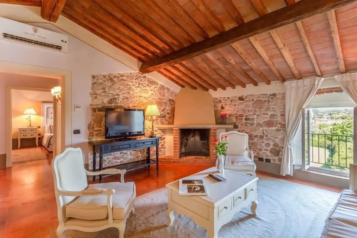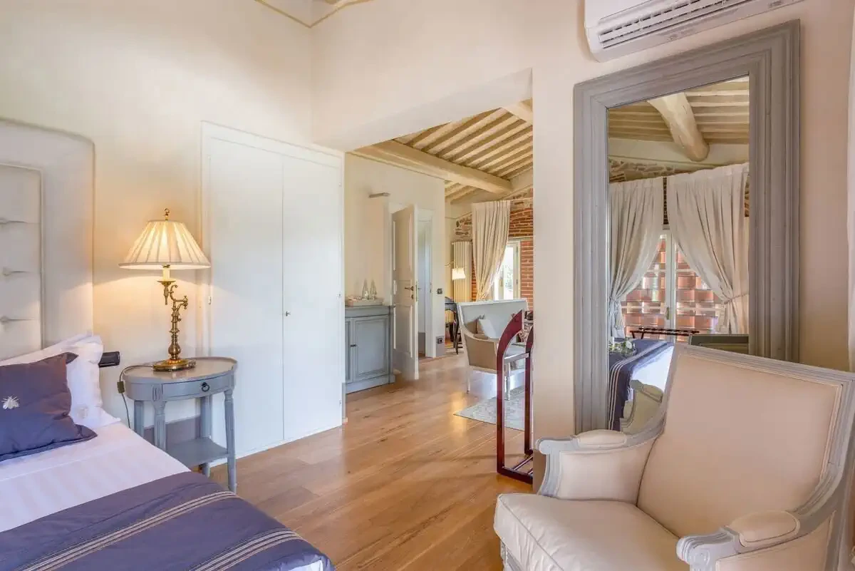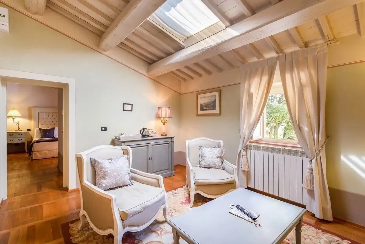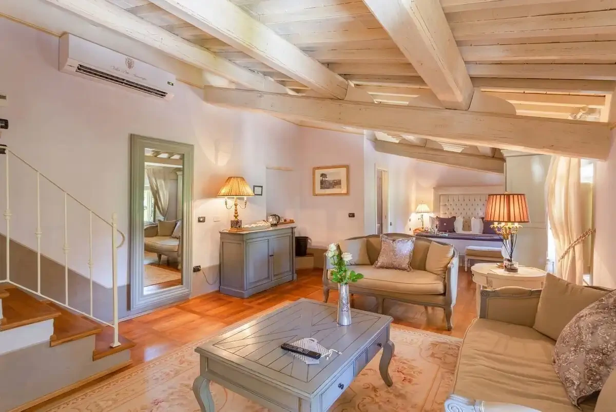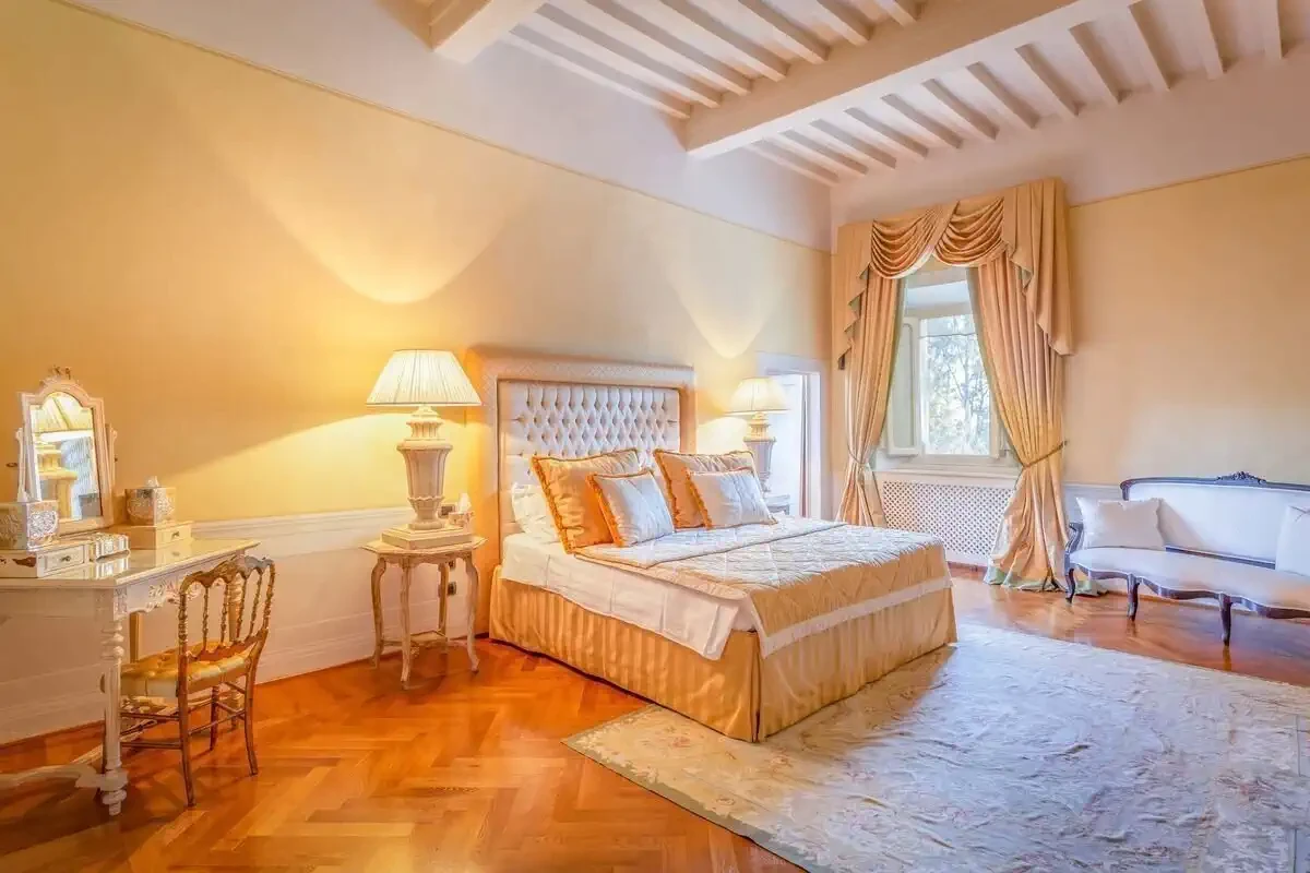 La demeure conserve l’esprit d’une résidence aristocratique toscane avec salons d’apparat, ouvertures sur le parc, terrasses et loggias. Les 13 suites bénéficient de surfaces généreuses, de salles d’eau contemporaines et de climatisation.