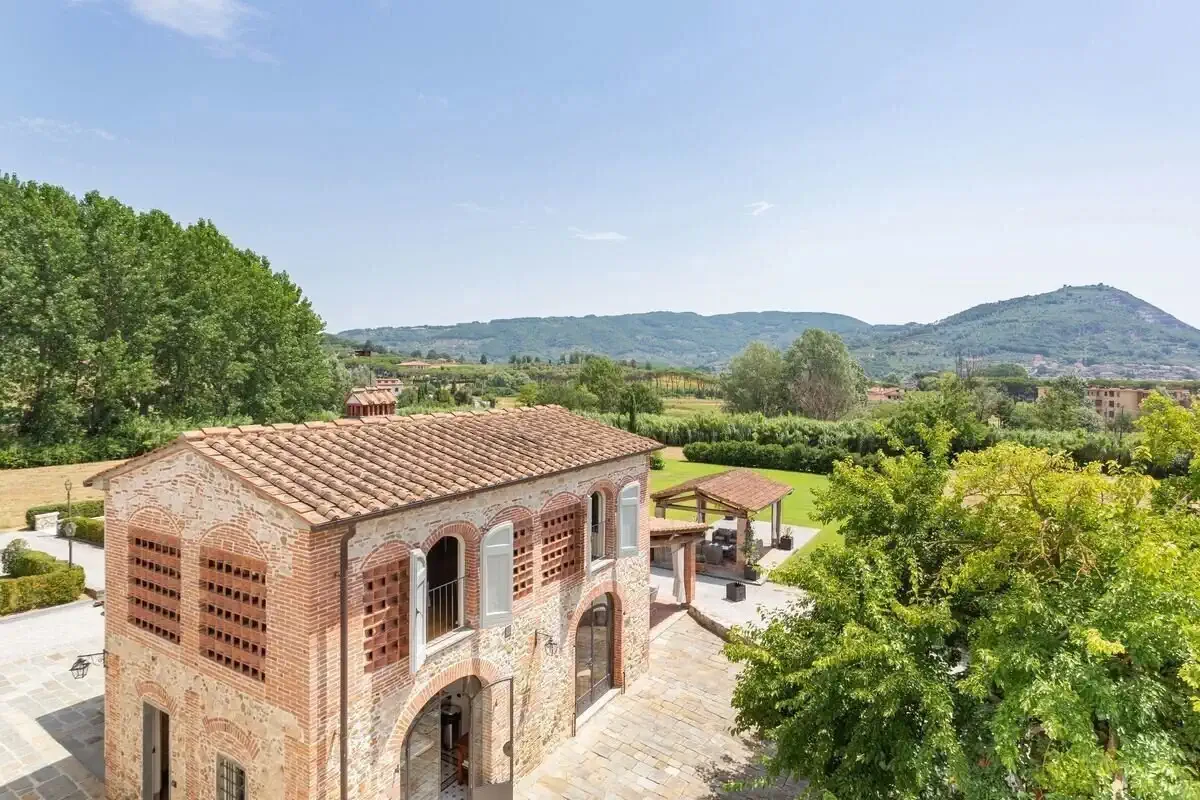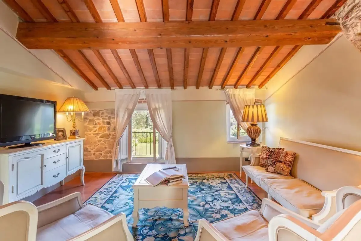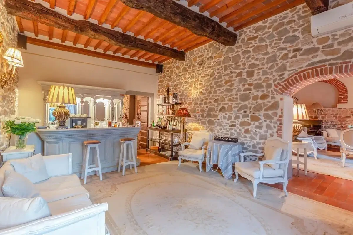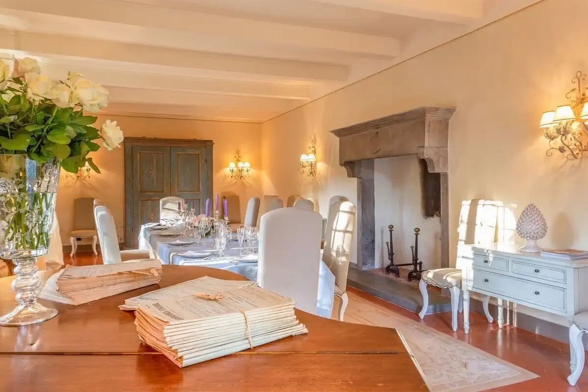 Le domaine architectural totalise environ 2.100 m² répartis sur trois niveaux et comprend la demeure principale, l’ancienne grange et une chapelle privée. Aujourd’hui, l’ensemble est utilisé comme résidence dotée de 13 suites d’hôtes. Les espaces intérieurs associent éléments toscans traditionnels – plafonds à caissons, pierre naturelle, finitions d’époque – et confort moderne.