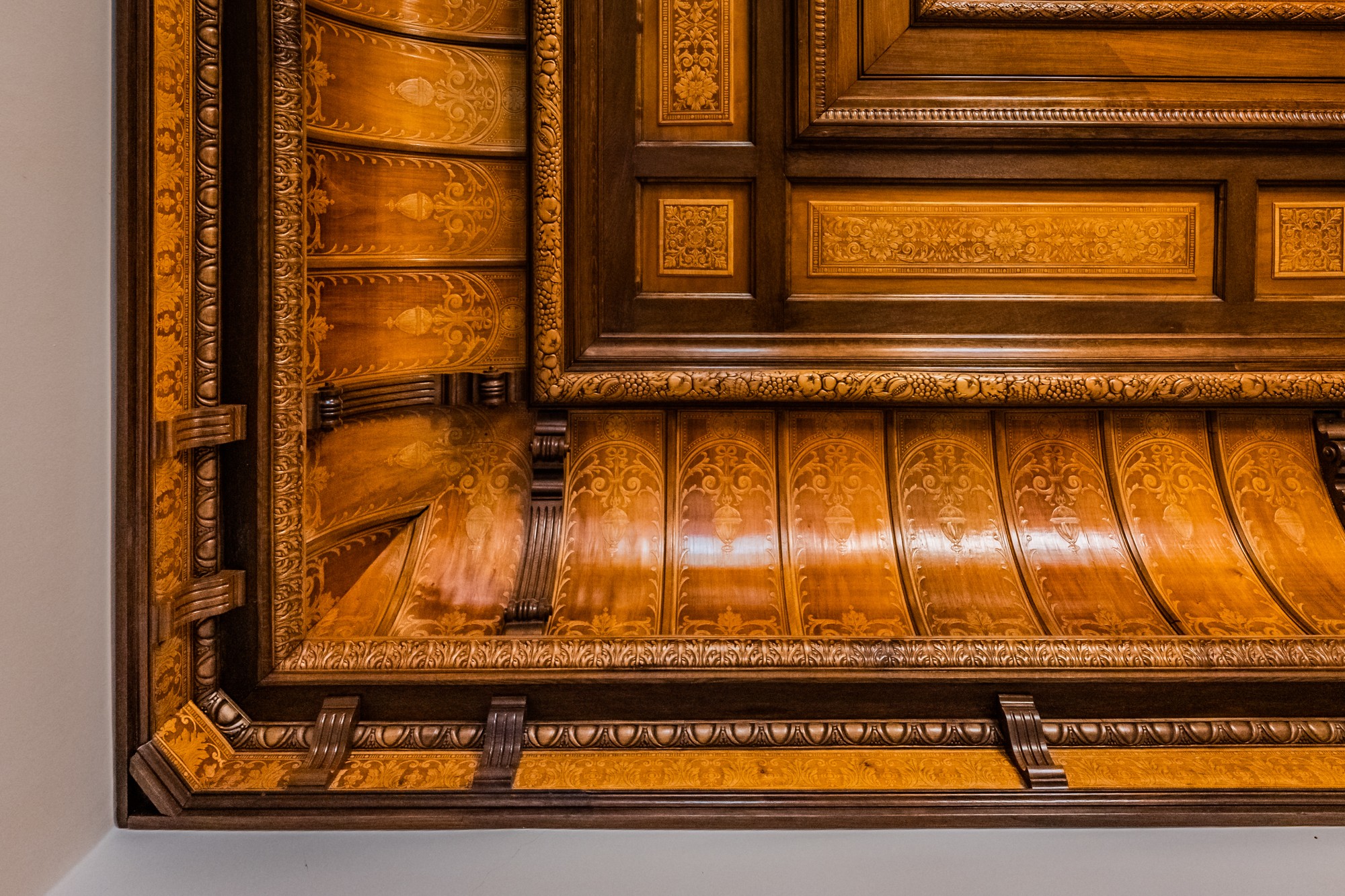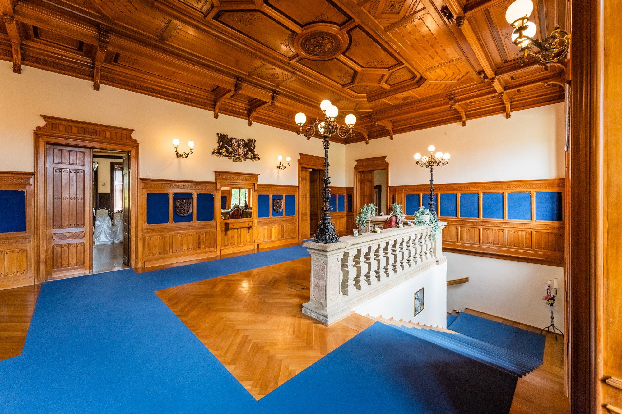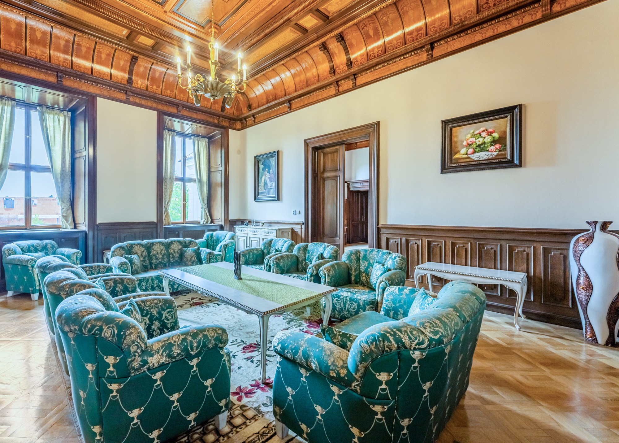 Historische Architekturdetails sind vollständig erhalten. Fensternischen und eingerückte Fensterbänke sind mit Holzschnitzereien verziert. Zwischen dem Eingang zum ovalen Saal und dem angrenzenden Zimmer befindet sich ein Spiegel, hinter dem eine schlanke Wendeltreppe zu den Räumen im Turm (77 m²) verborgen ist – ein geheimer Zugang.