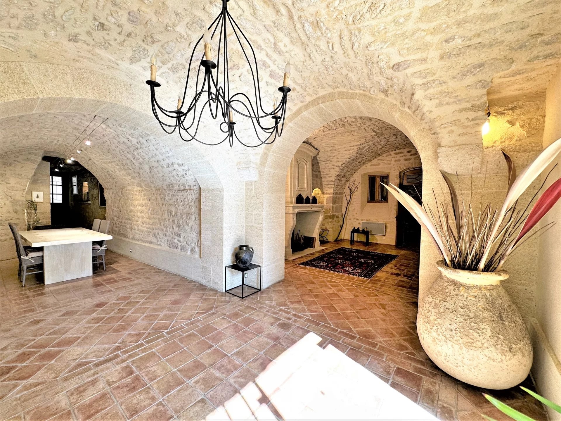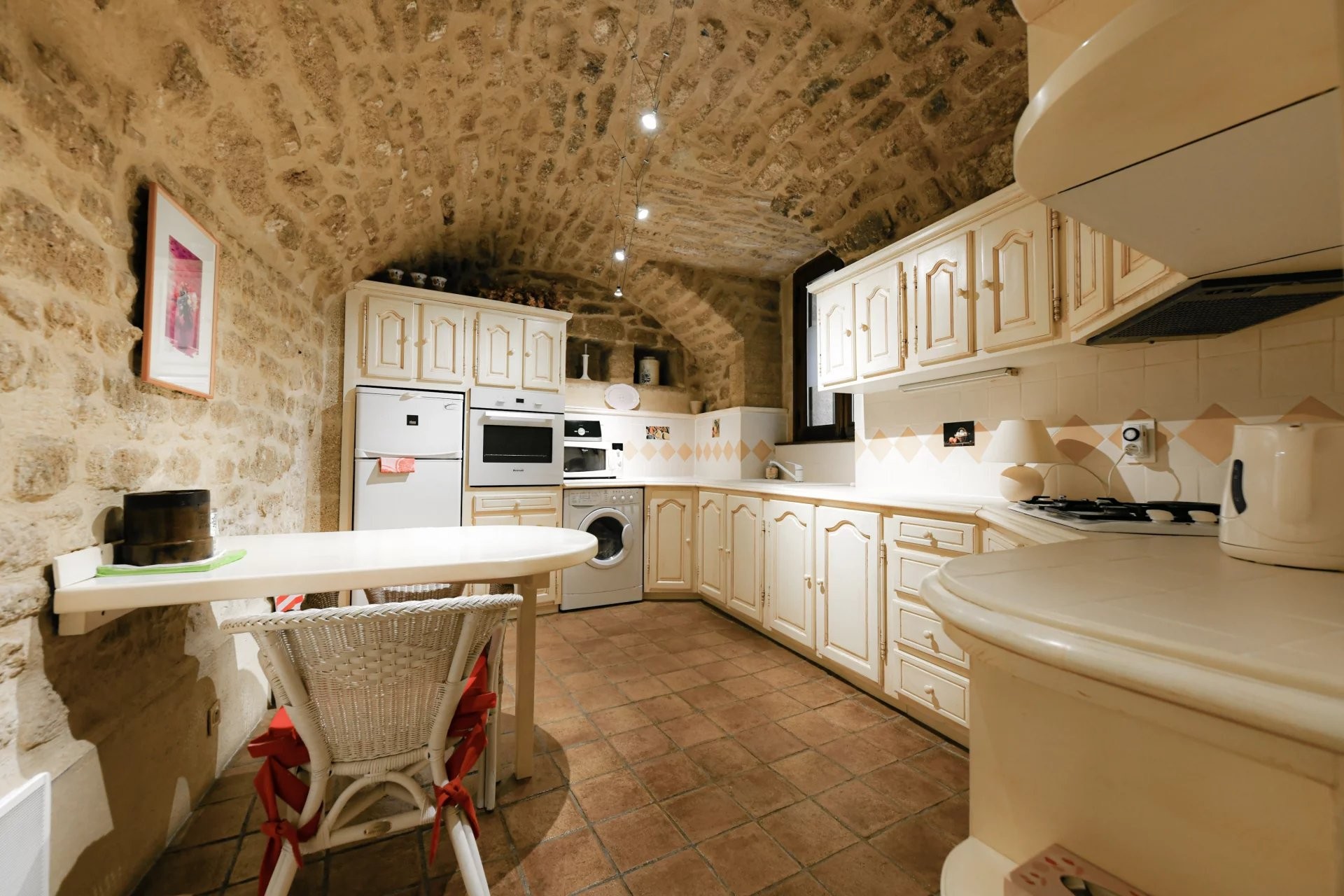 L’entrée spacieuse donne accès à un remarquable espace de réception de 60 m² comprenant un salon agrémenté d’un plafond voûté en croisée d’ogives et d’une cheminée en pierre, une salle à manger attenante ainsi qu’une cuisine entièrement équipée. Sous la cuisine se trouve une cave à vin historique.