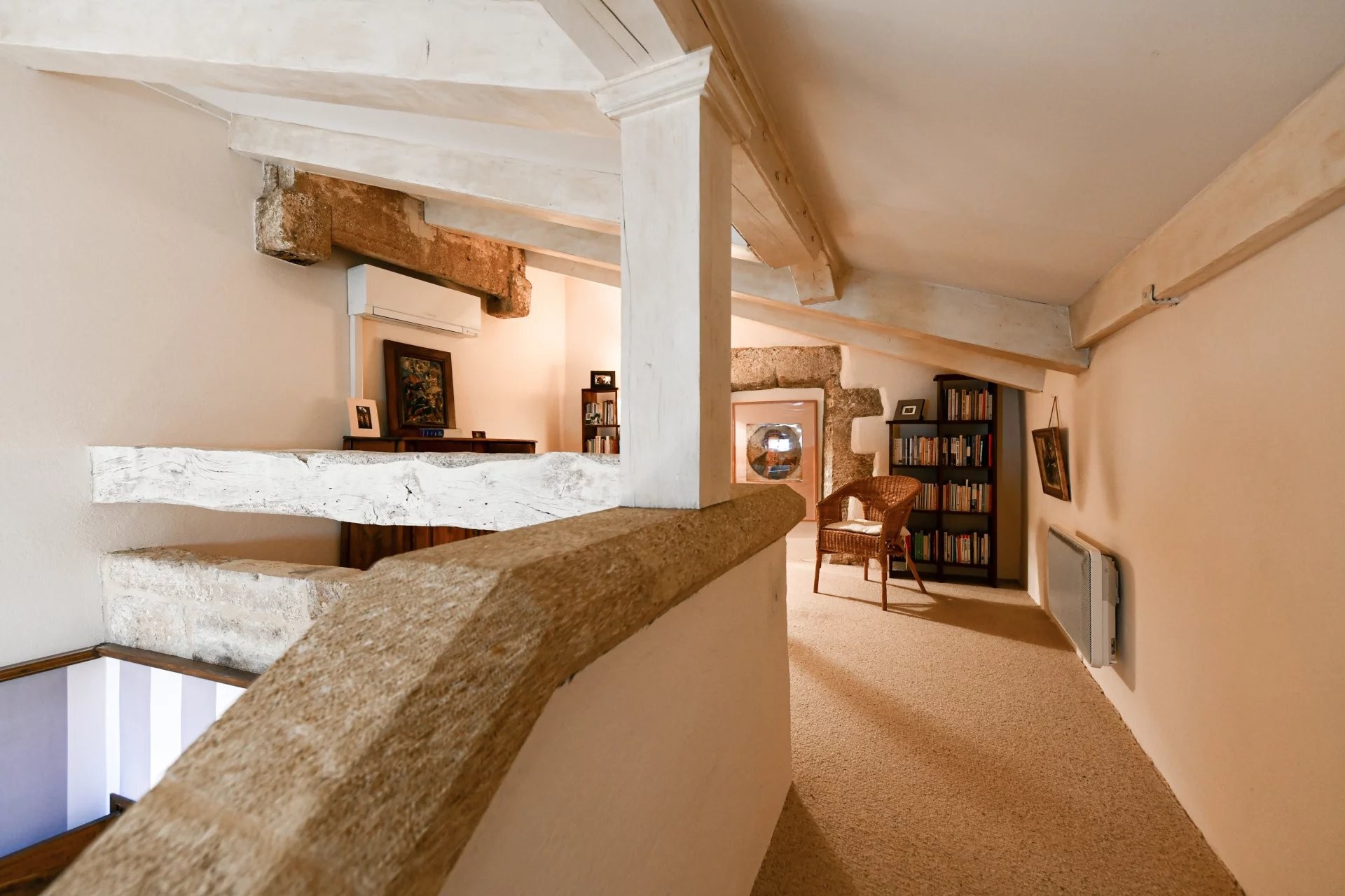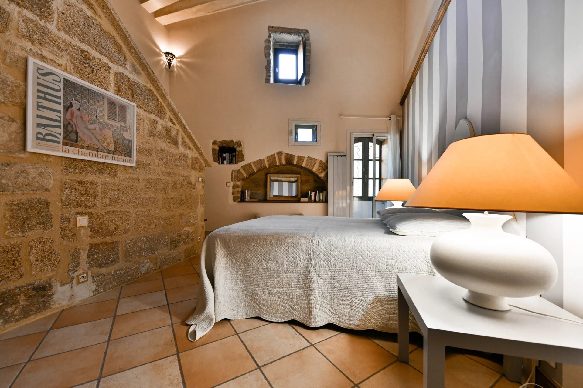 Accessible depuis la terrasse principale, un appartement d’invités en duplex comprend une suite généreuse (42 m²) avec accès direct à la terrasse, un dressing ainsi qu’une salle de bain avec baignoire, douche, lavabo et WC. À l’étage supérieur, un élégant espace de vie et salle à manger (19 m²) s’ouvre sur une seconde terrasse, offrant une vue imprenable sur les toits du village historique.