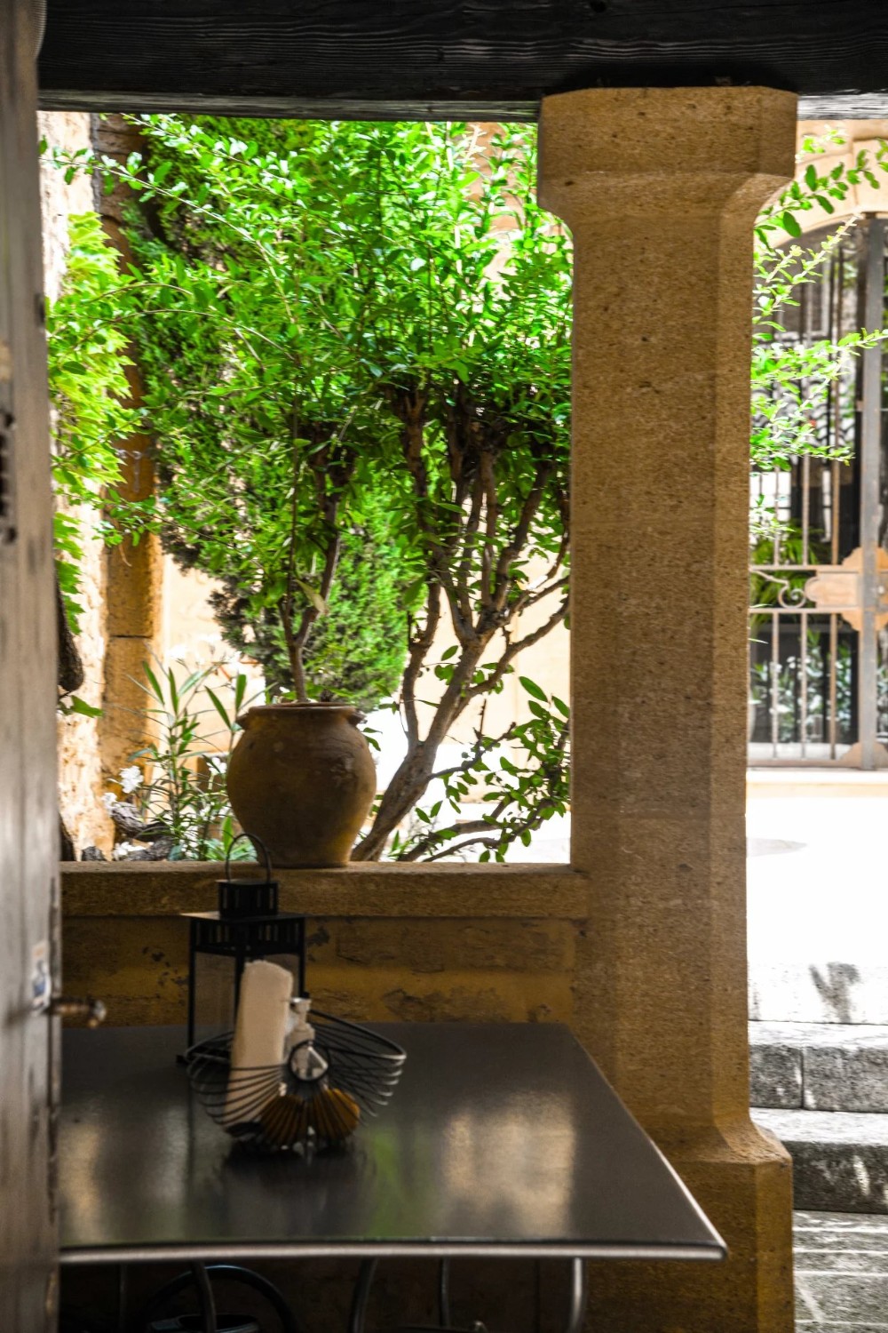 Au cœur de la vieille ville pittoresque d’un village médiéval, entourée de petites boutiques et d’une atmosphère animée, une élégante porte en pierre s’ouvre sur une cour intérieure enchanteresse.