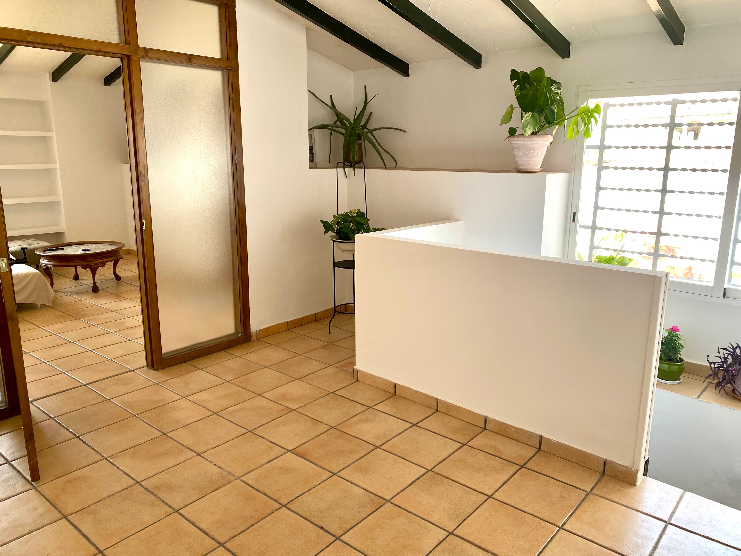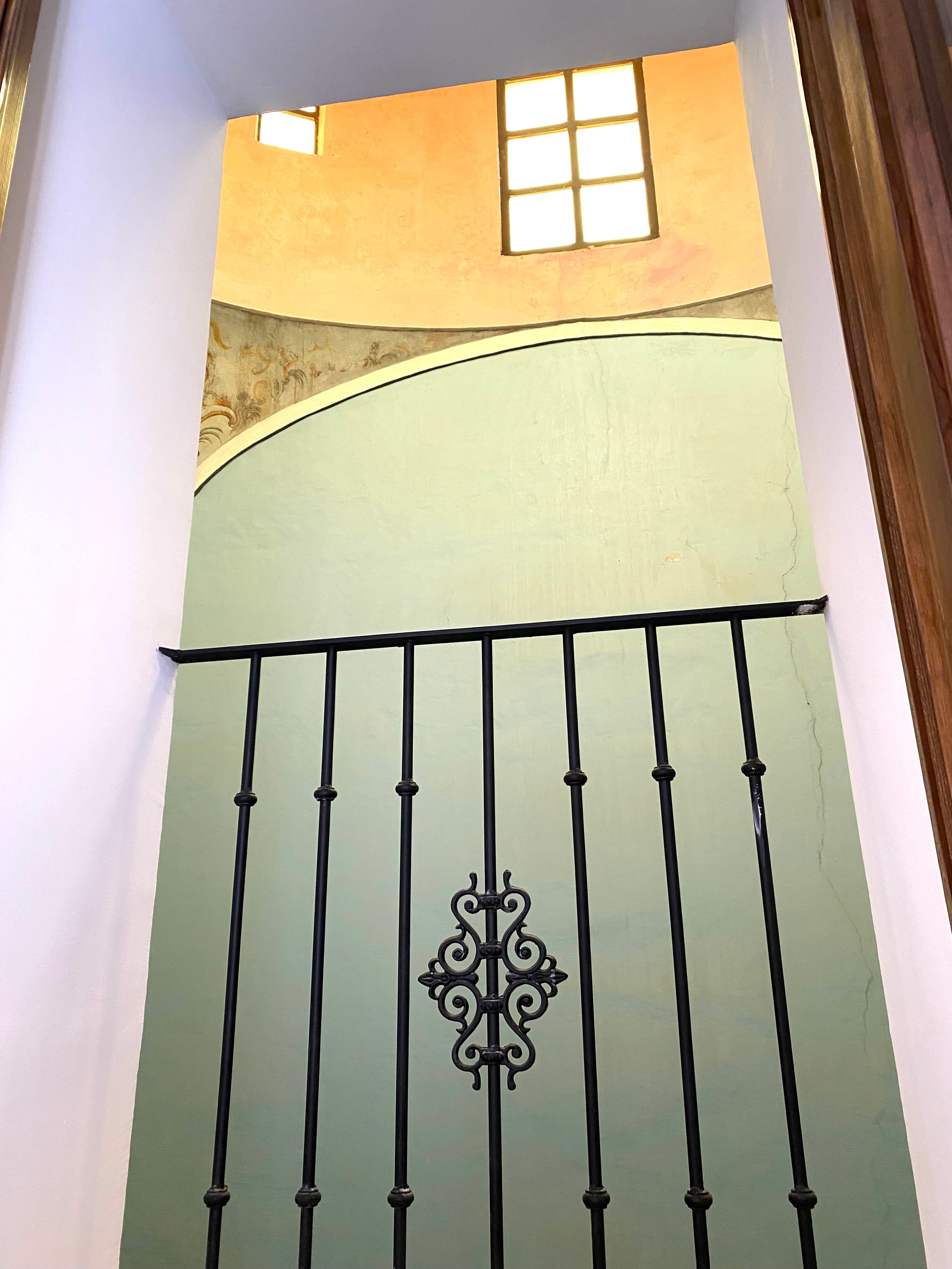 L’étage principal comprend plusieurs pièces historiques, dont six chambres, une cuisine, deux salles de bains et un vaste salon. Plusieurs espaces présentent des stucs et peintures murales de la fin du XIXe siècle, récemment restaurés par des spécialistes. Depuis cet étage, on accède à une terrasse ainsi qu’à une grande cour intérieure avec puits, garage et bâtiments annexes. La menuiserie intérieure d’origine en bois est préservée dans l’ensemble de la maison.