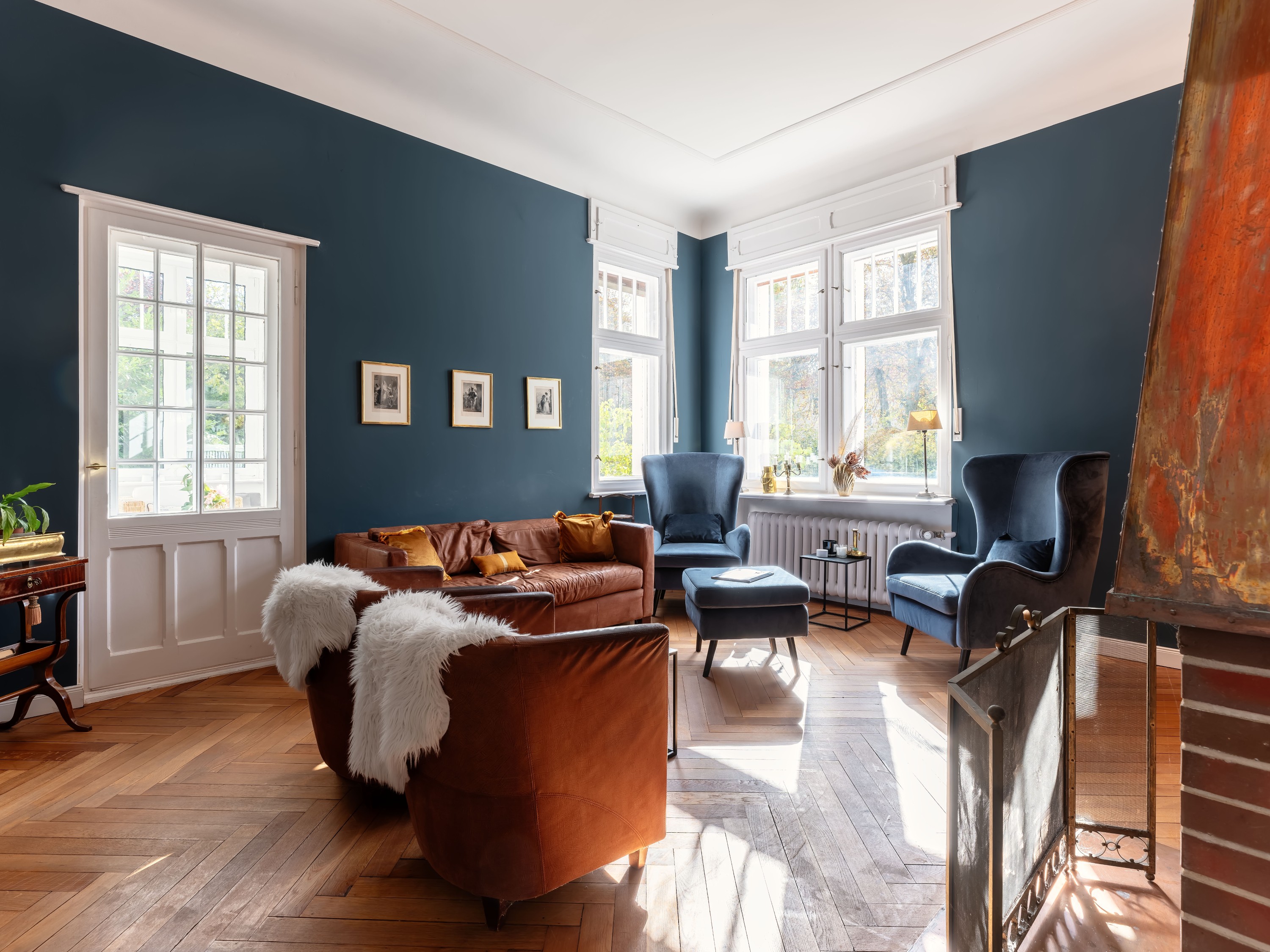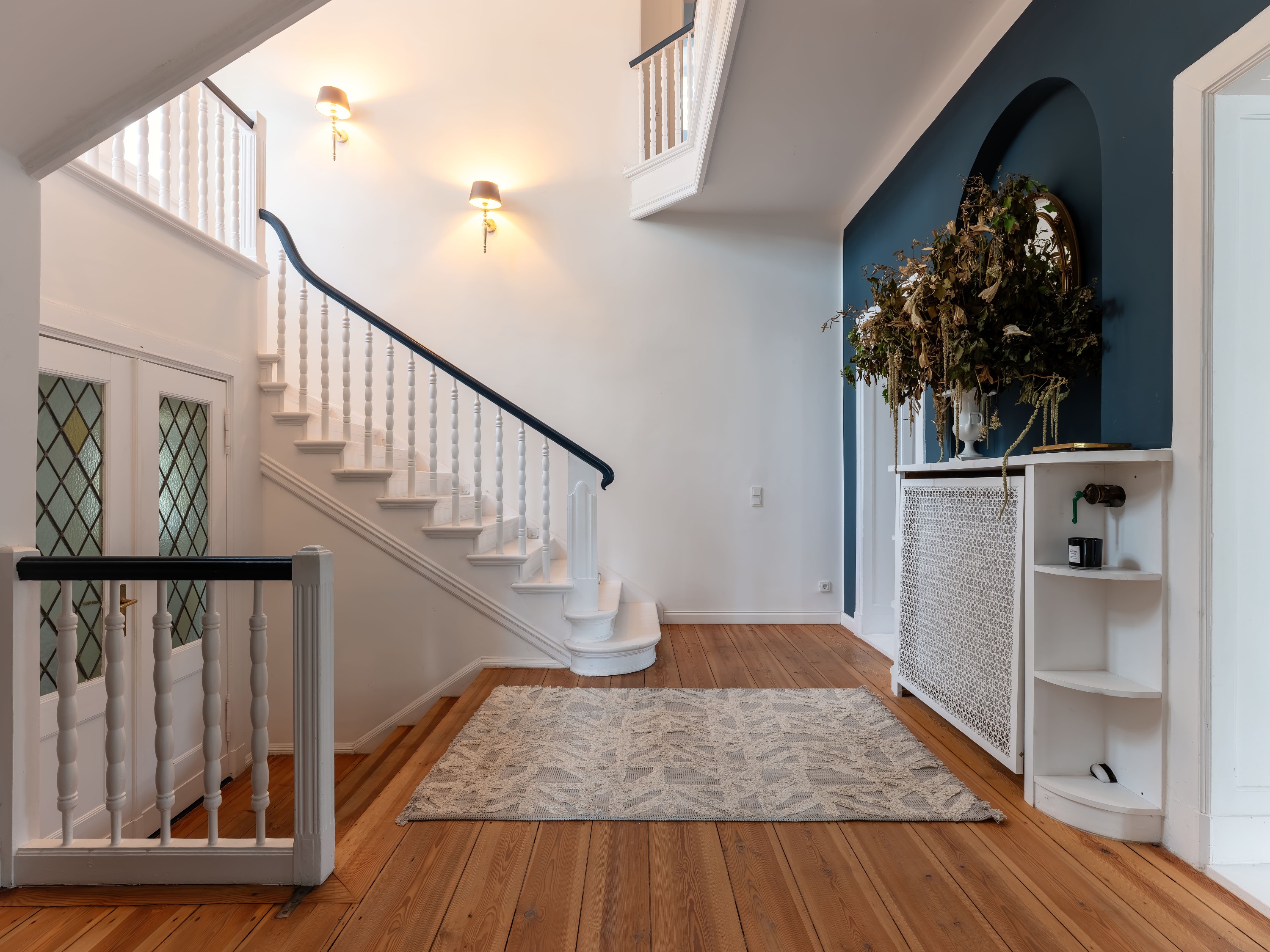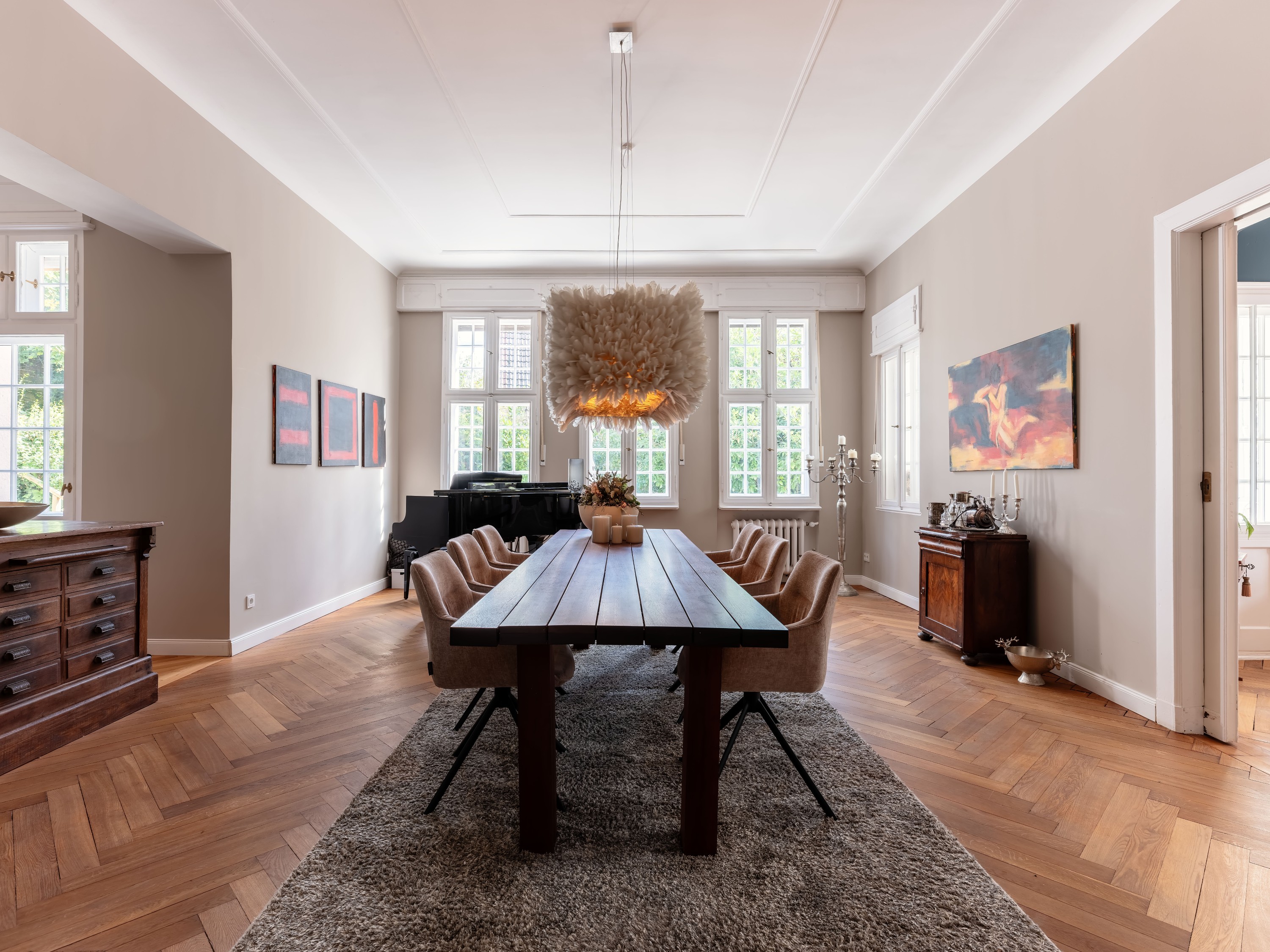 Dès l’entrée, un vestibule d’époque mène à un hall spacieux qui souligne l’élégance de la demeure. Répartie sur quatre niveaux, la villa comprend 13 pièces généreuses, des plafonds hauts et des éléments architecturaux restaurés avec soin. La structure historique a été préservée lors de la rénovation, tandis que les équipements modernes répondent aux exigences les plus élevées. Parquets nobles et larges planchers en bois massif accentuent le style raffiné qui parcourt toute la maison.