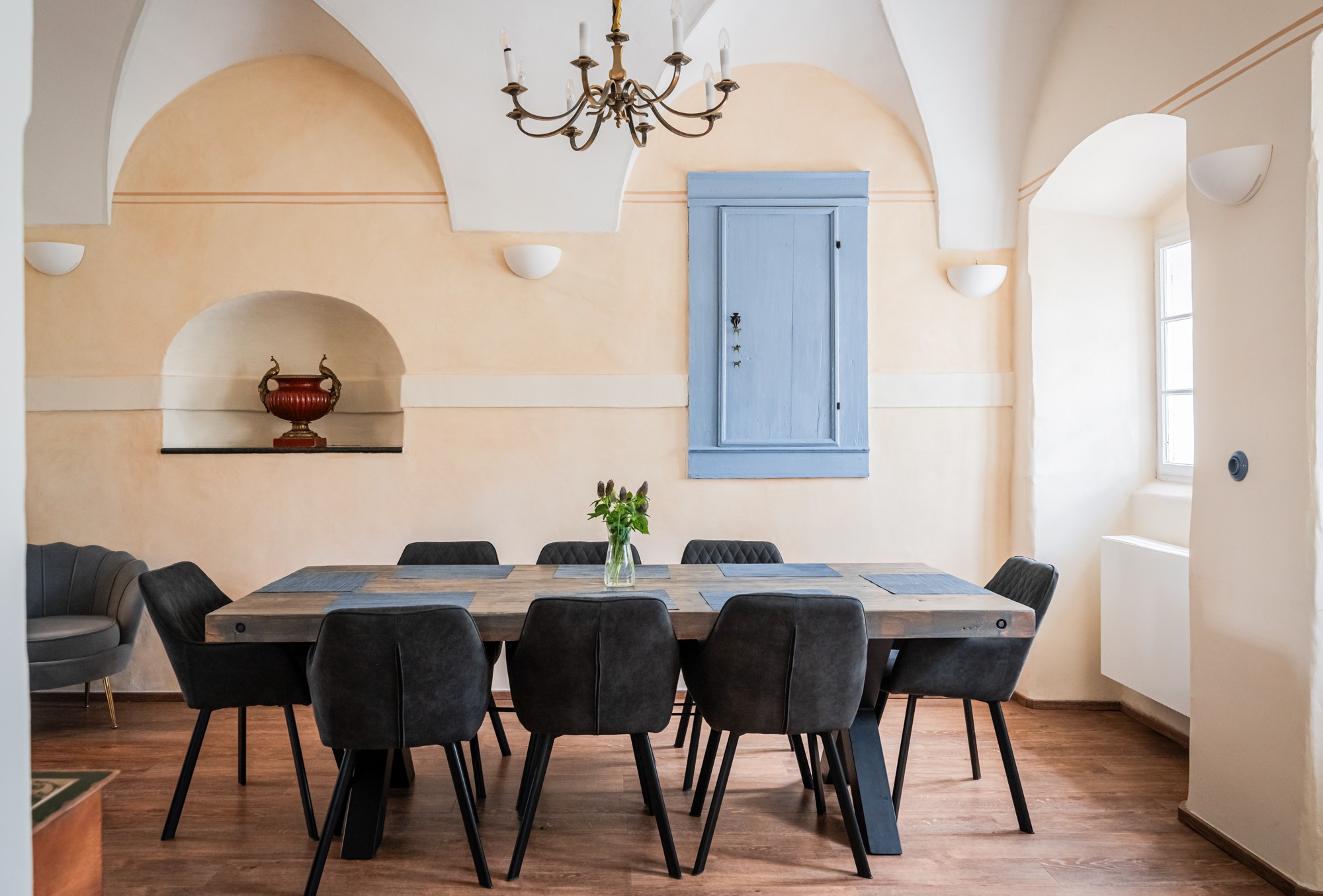 La situation était similaire pour son propre château (zámeček) au nord de České Budějovice. Grâce à une planification rigoureuse et à une conception claire, sept années de travail ont permis de créer une résidence fonctionnelle avec une véritable substance – obtenant l’effet d’une restauration historiquement respectueuse, sans aucune contrainte patrimoniale.