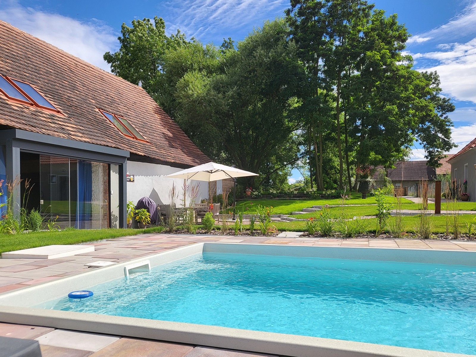 La grange restaurée occupe une place particulière : par sa taille et sa situation, elle pourrait aussi accueillir, si besoin, des usages à caractère commercial. Par ailleurs, la piscine extérieure chauffée et l’étang historique du château, entouré de coins verdoyants, forment un ensemble harmonieux où tradition et confort moderne se mêlent naturellement.