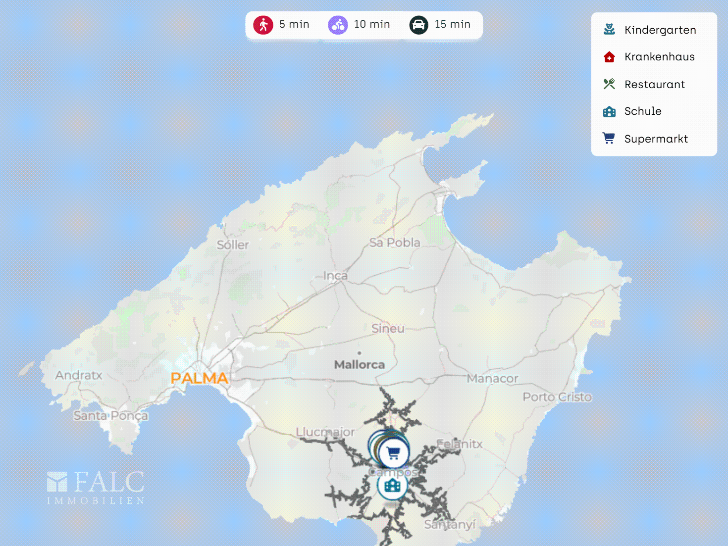 Campos is een traditioneel dorp in het zuiden van Mallorca, met volledige lokale voorzieningen, korte afstanden en de typische Mallorcaanse dorpssfeer. Het strand Es Trenc ligt op ongeveer 15 minuten rijden, en de luchthaven van Palma op circa 25-30 minuten.