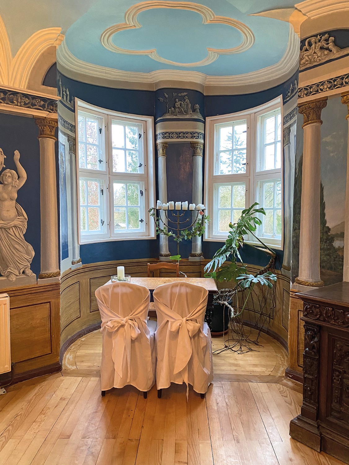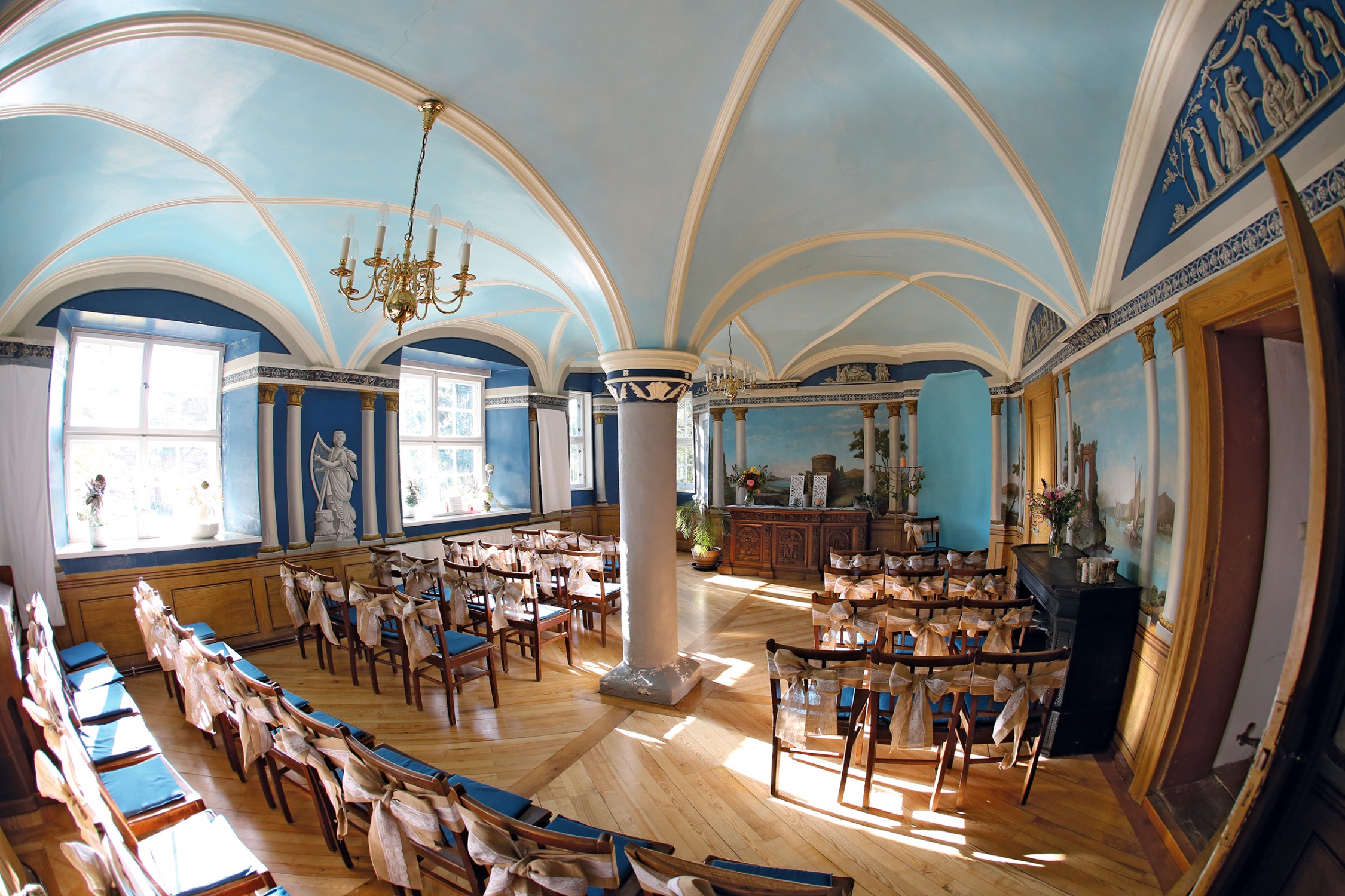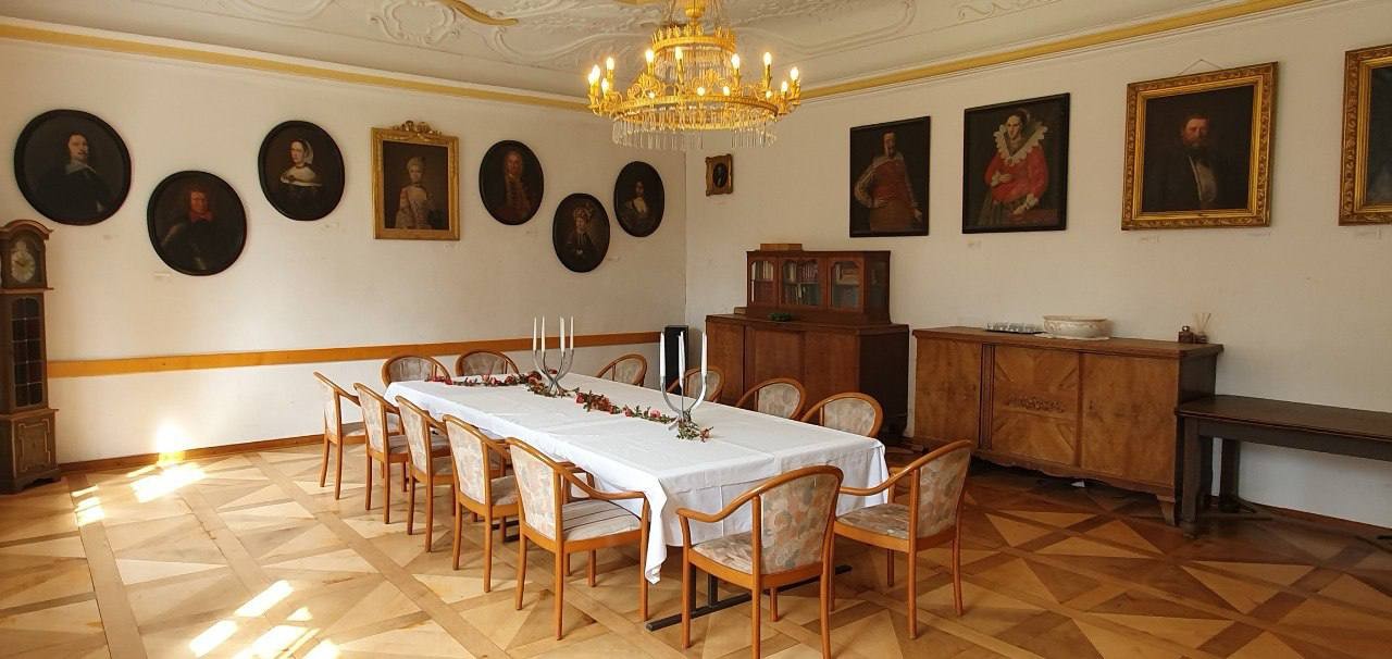 - Besonderheiten: historische Kapelle mit handbemalten Leinwandtapeten (arkadische Landschaften) aus dem 18. Jh., Festsaal mit italienischer Renaissance Stuckdecke, Eichenparkett, Kronleuchter und Ölgemälden