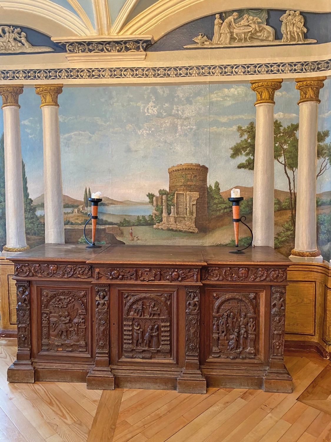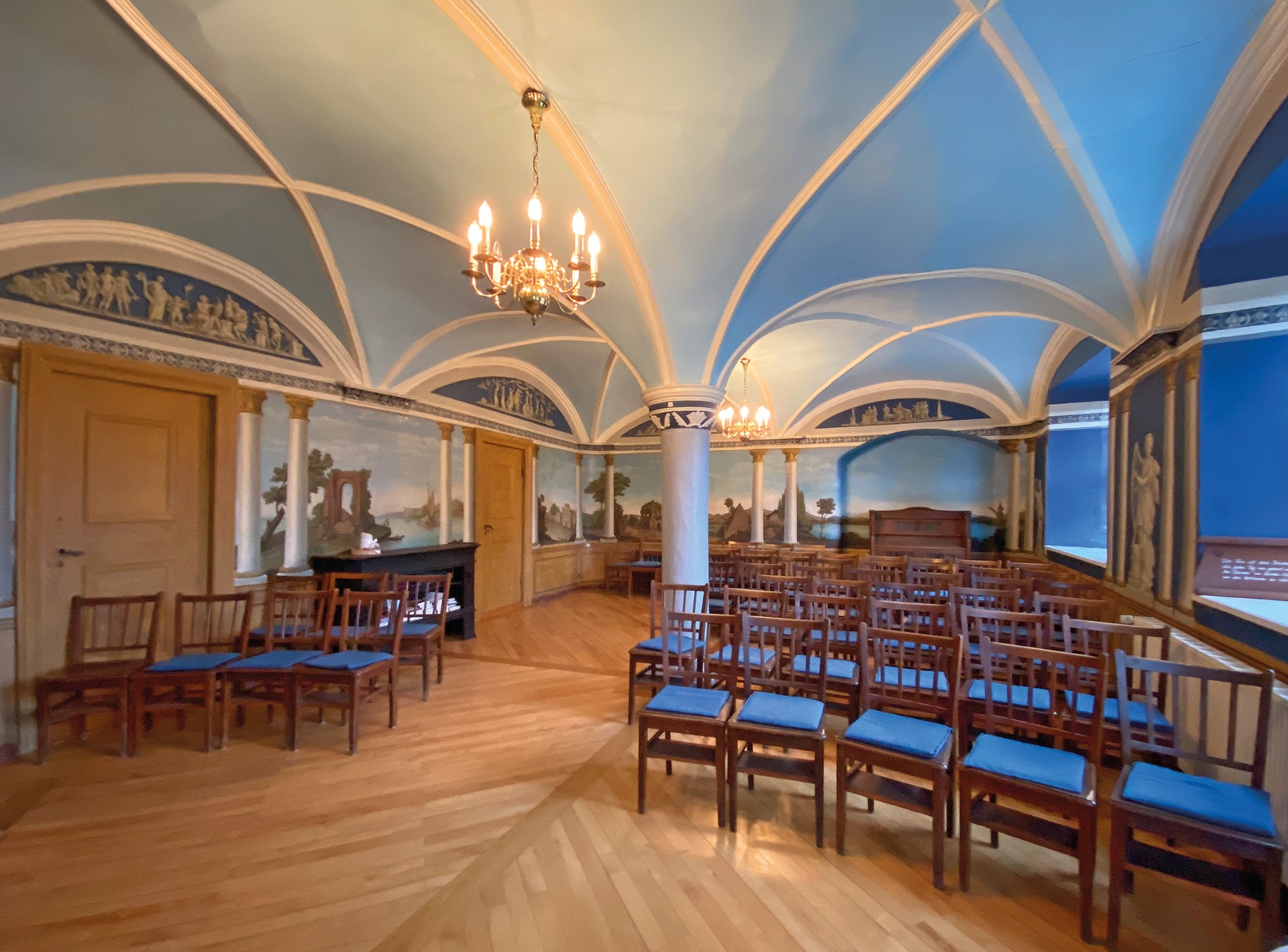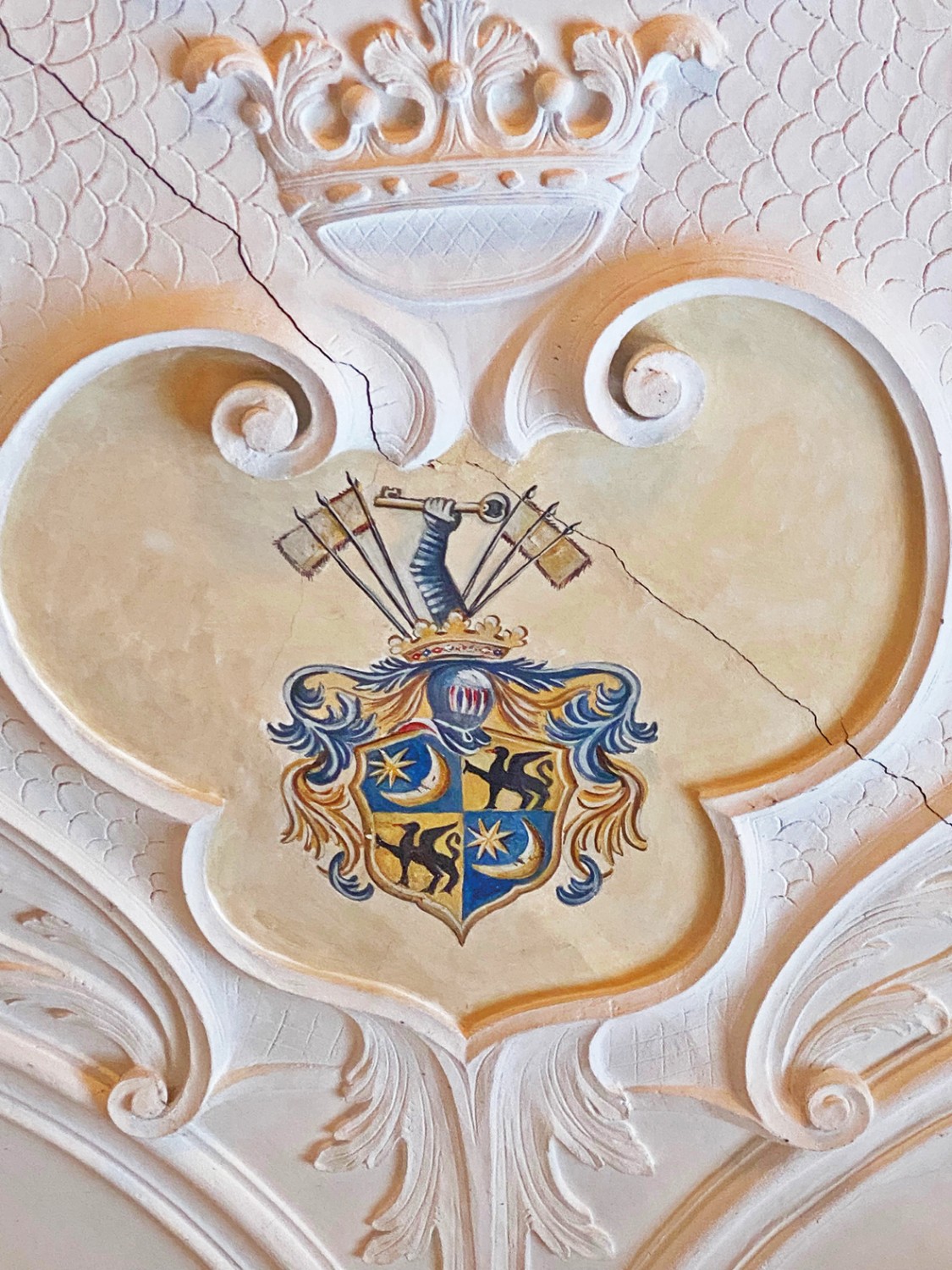 - Besonderheiten: historische Kapelle mit handbemalten Leinwandtapeten (arkadische Landschaften) aus dem 18. Jh., Festsaal mit italienischer Renaissance Stuckdecke, Eichenparkett, Kronleuchter und Ölgemälden