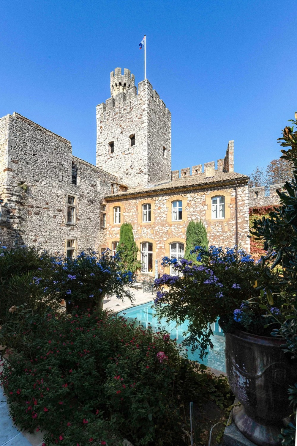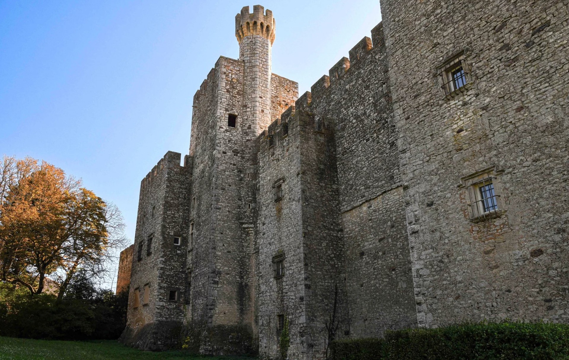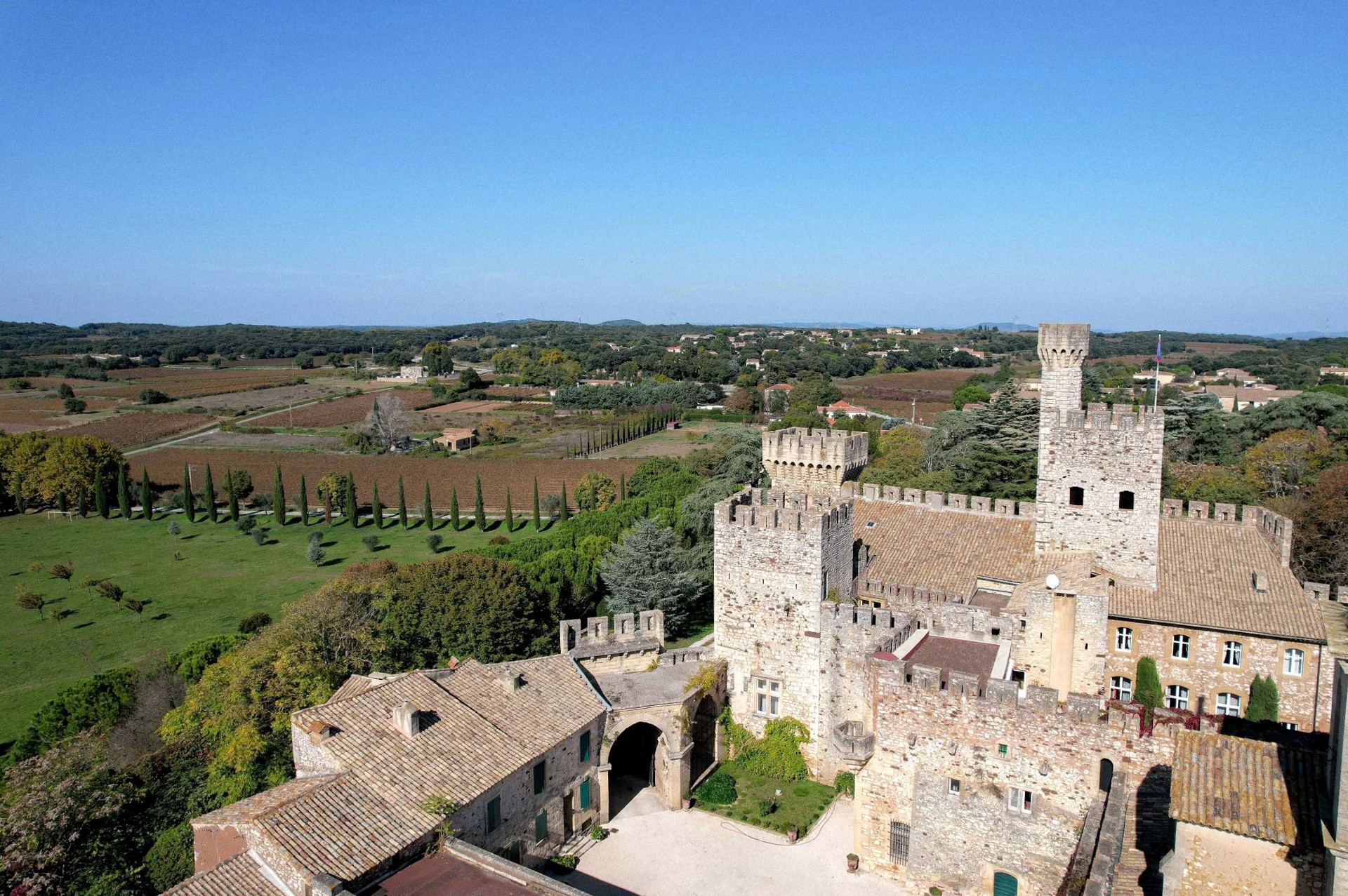 Het château beschikt ook over een donjon, vierkante torens, uitkijktorens, hoektorens en grote terrassen vanwaar men een uniek uitzicht heeft over het omliggende Toscaanse geïnspireerde landschap.