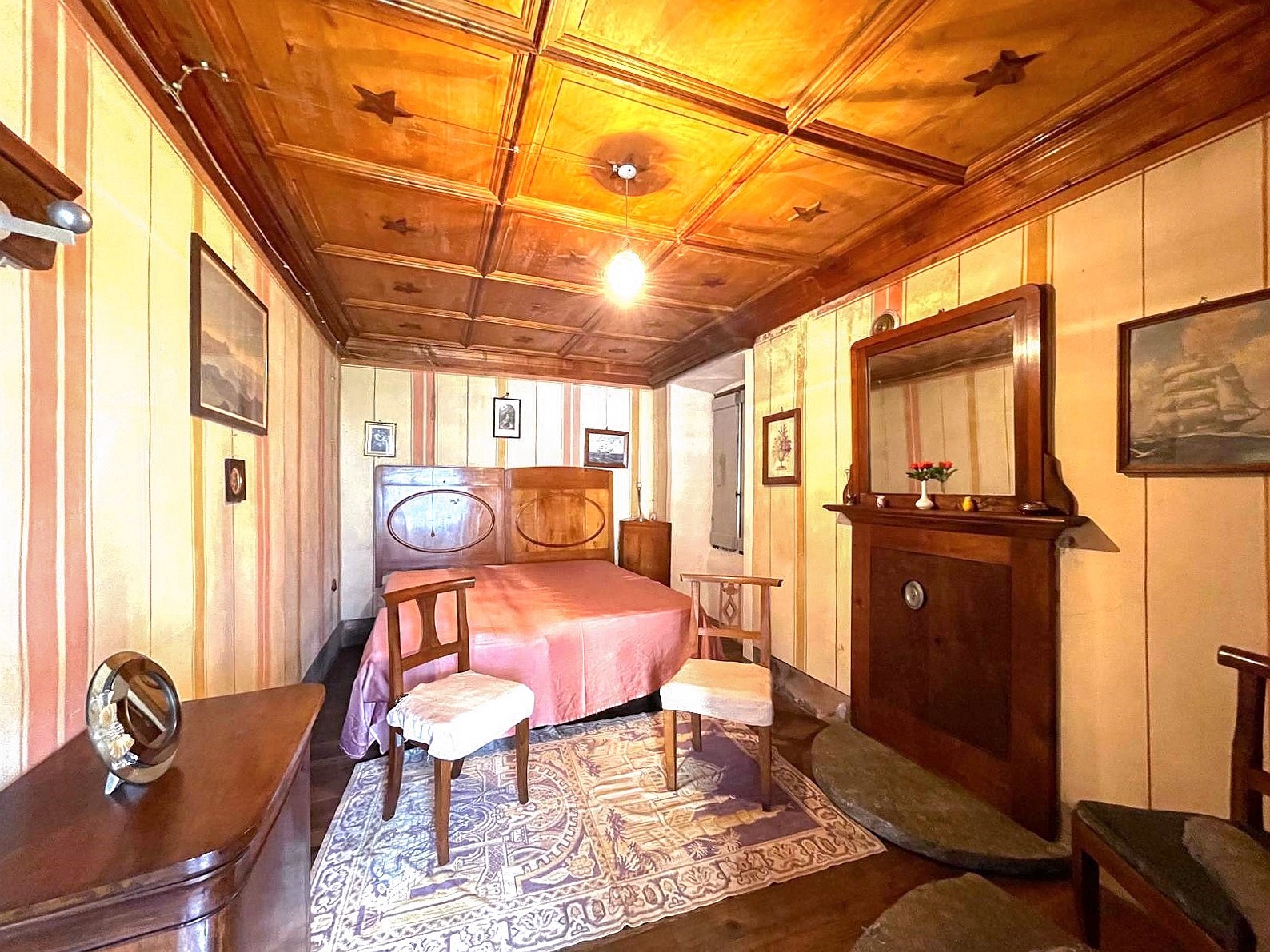 Op de eerste verdieping bevinden zich twee comfortabele slaapkamers en een charmante woonkamer met houten panelen, een ontspanningshoek waar u kunt genieten van een warme en gezellige sfeer. Een tweede badkamer completeert deze verdieping.