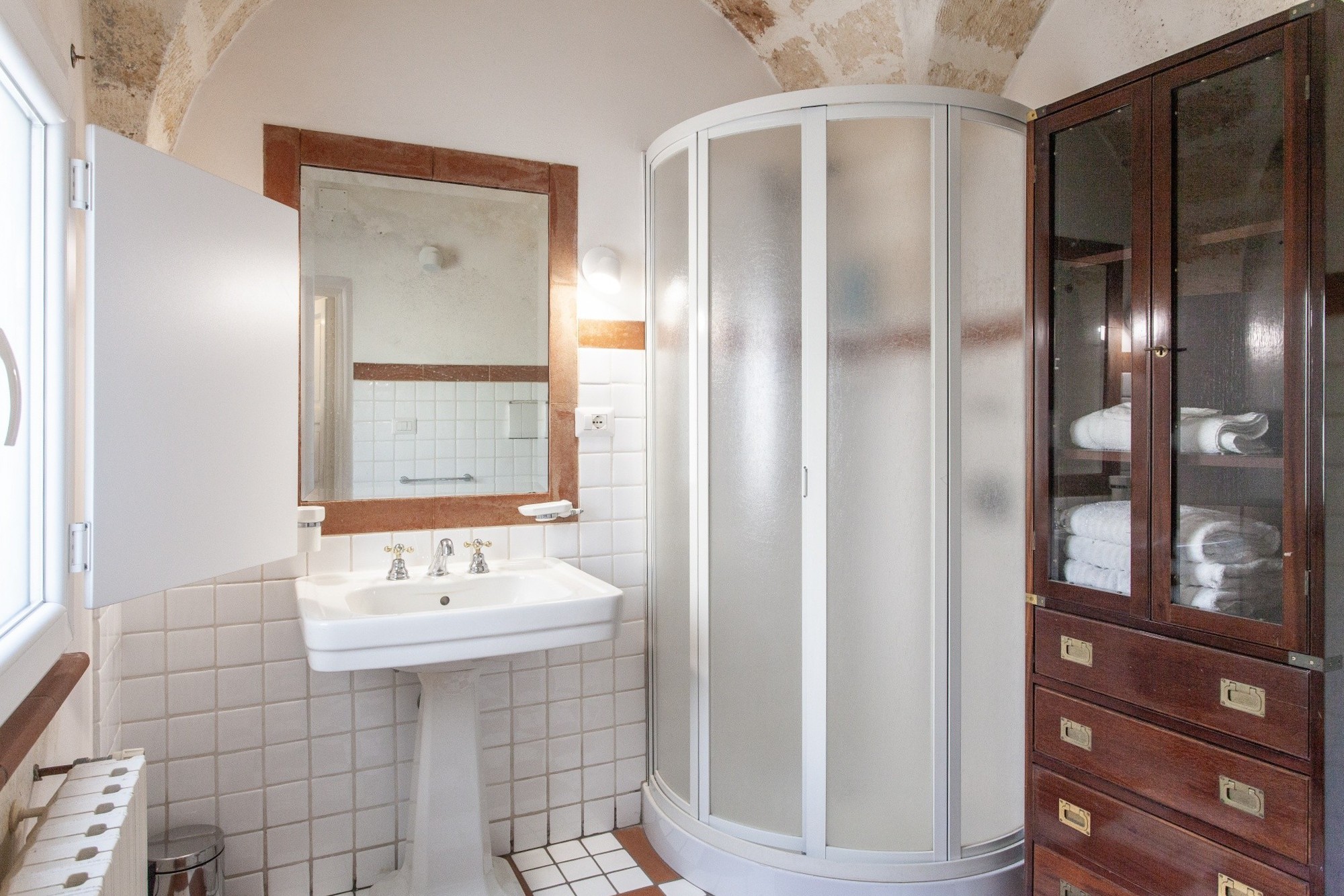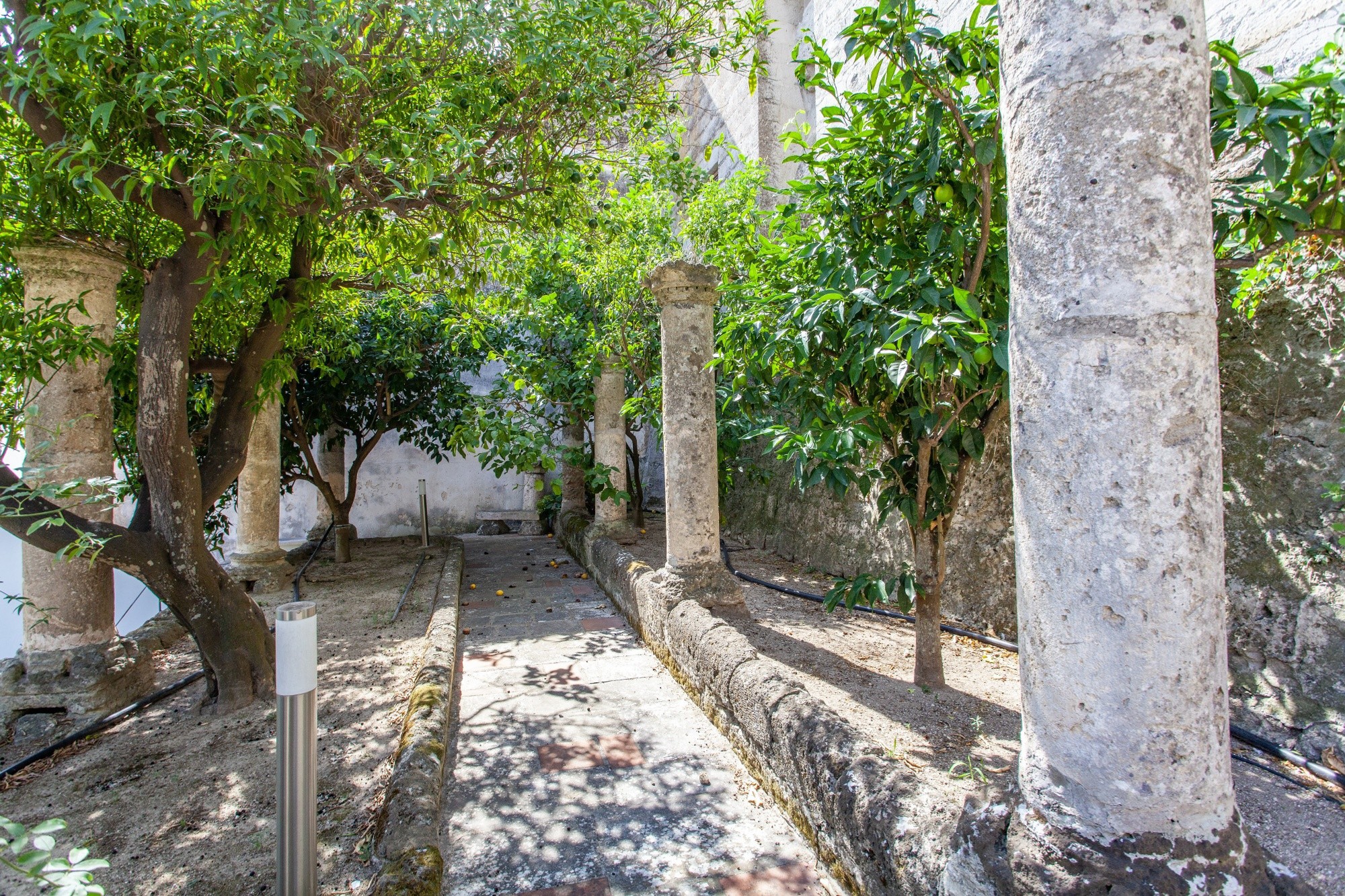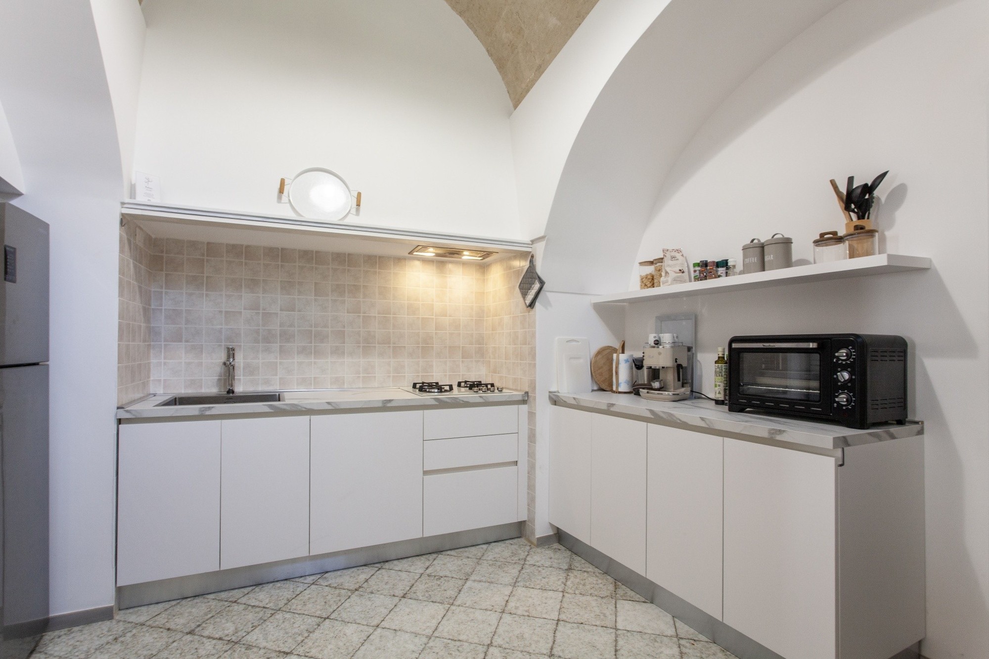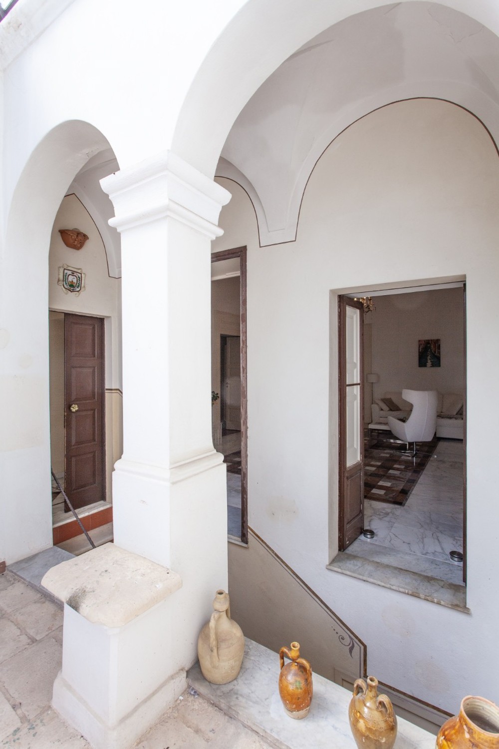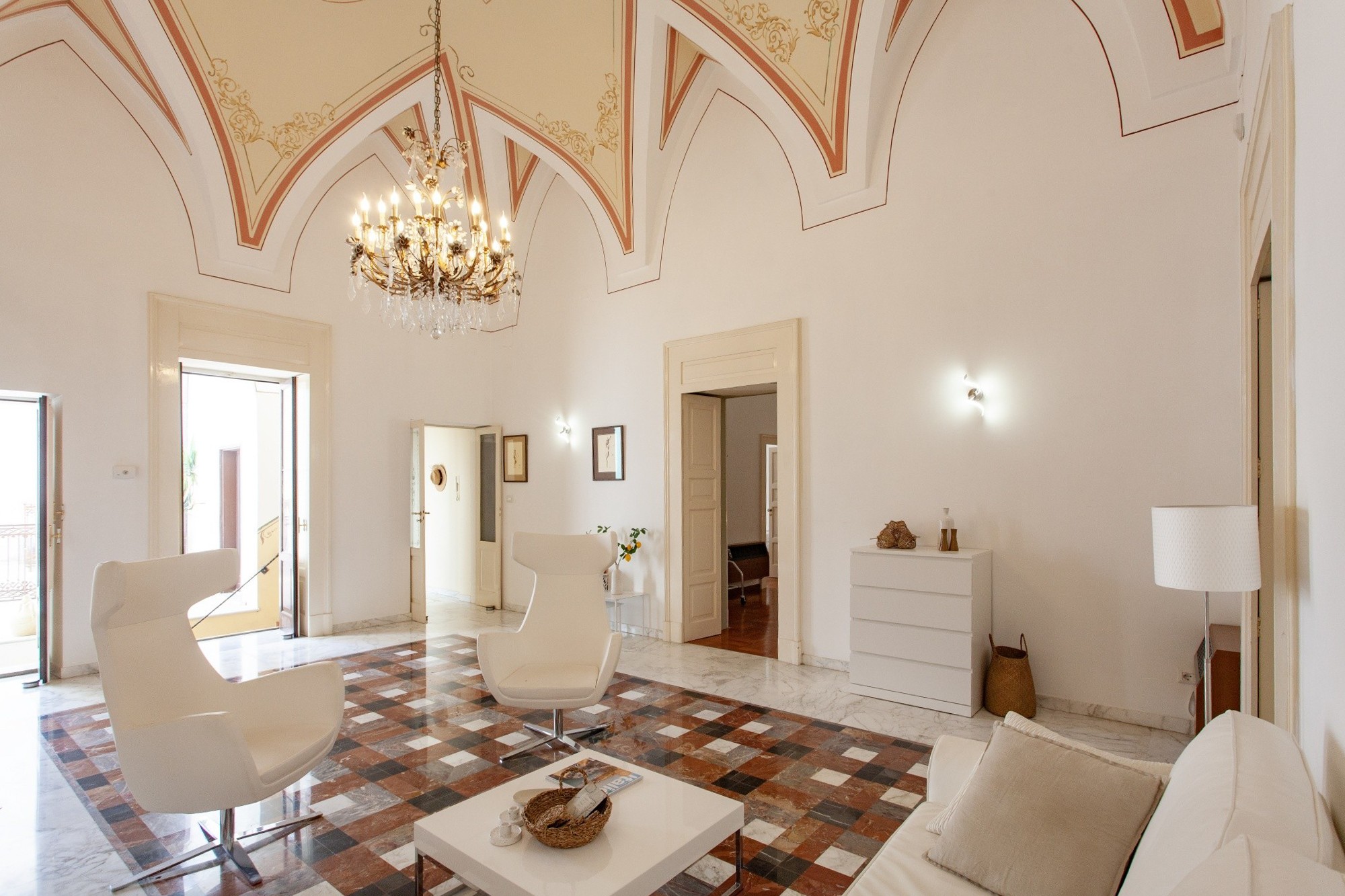 The main residence, located on the first floor, extends over 167 sqm on a single level. Its interiors retain the character of the local architecture, with star, barrel and lunette vaults—some delicately frescoed—harmoniously combined with modern minimal furniture. Elegant coloured marble floors and parquet further enhance the atmosphere.