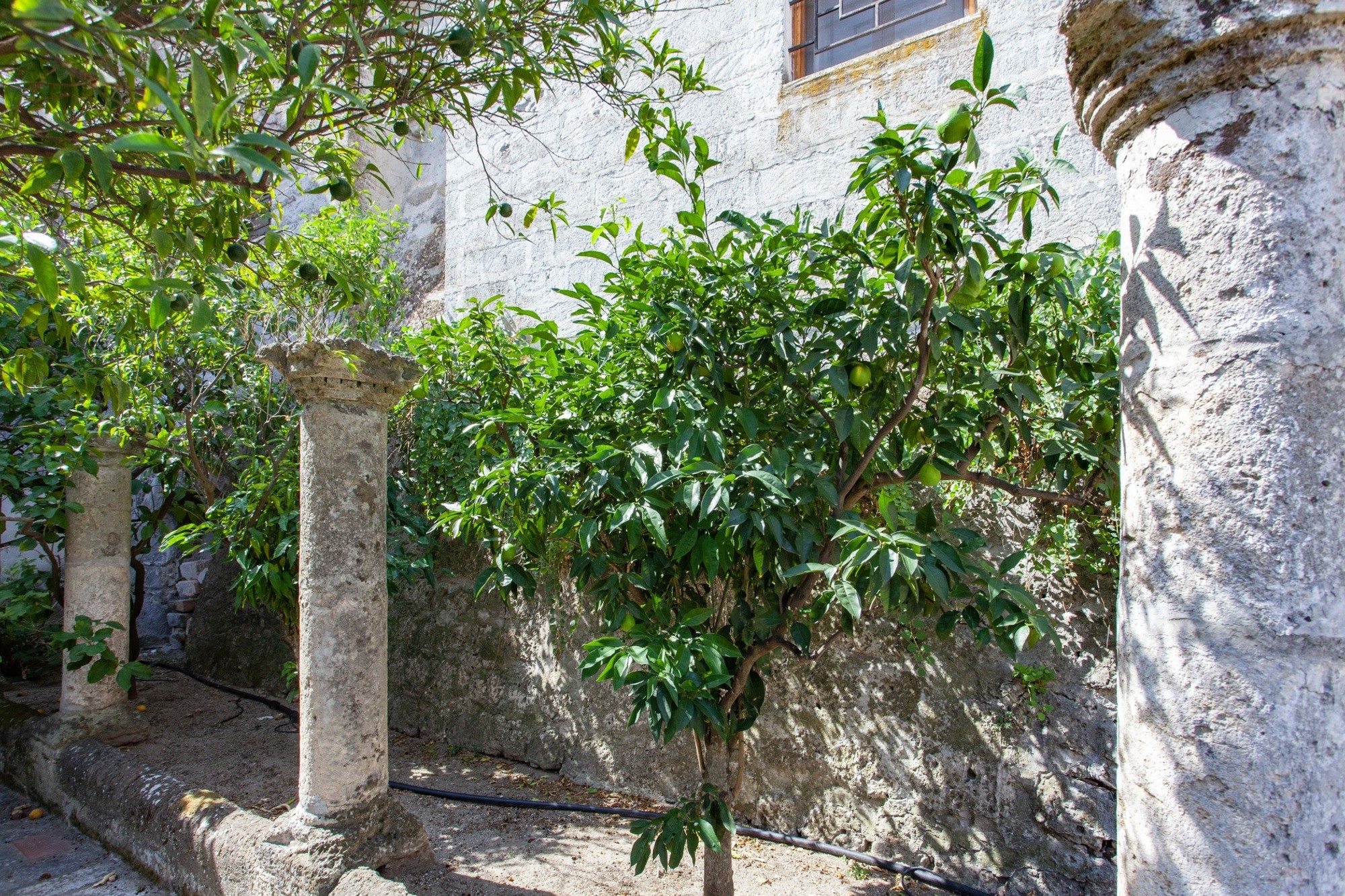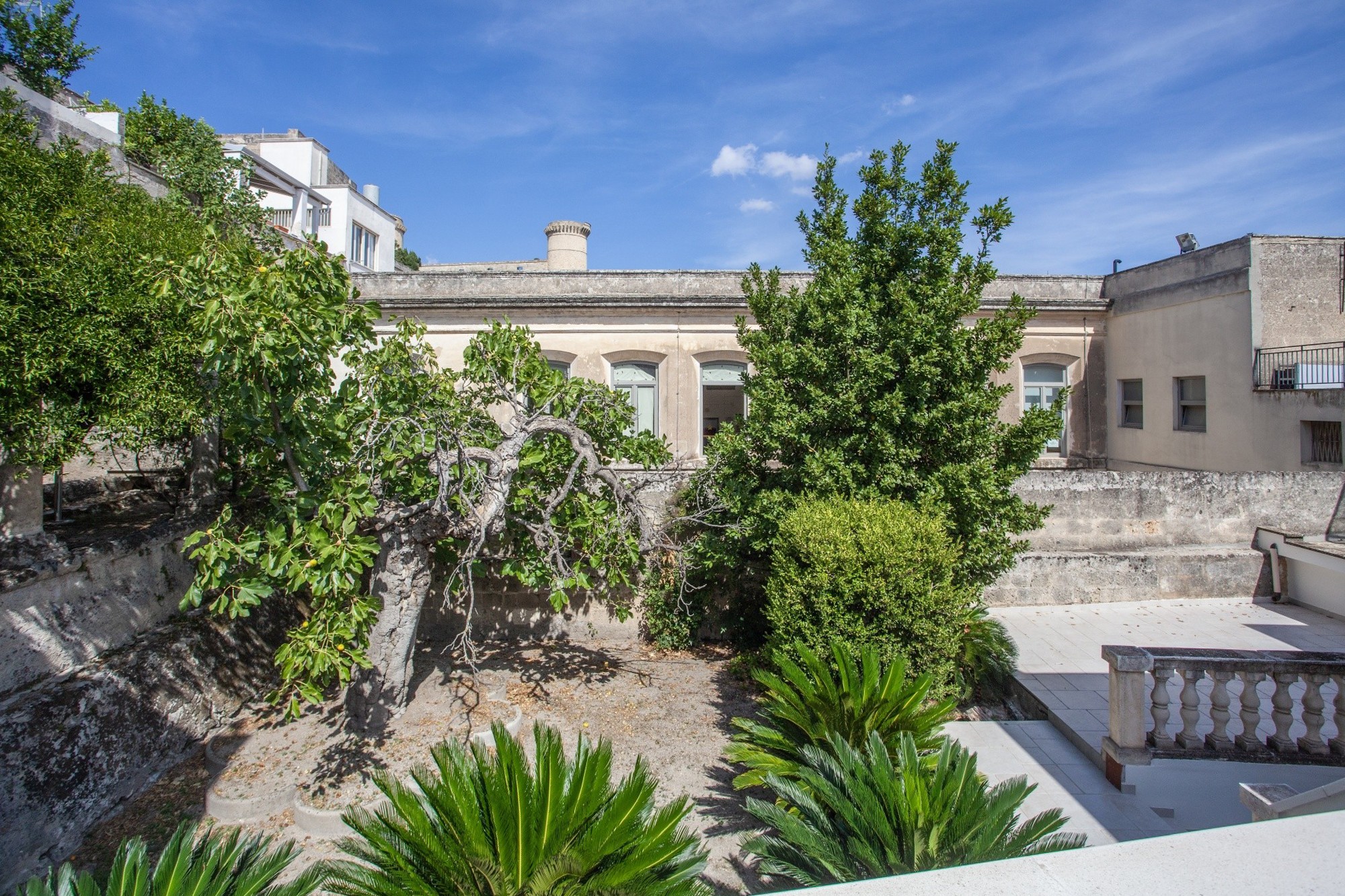 A staircase leads to the private outdoor area, set on a slightly higher level. Measuring approx. 265 sqm, this space combines garden and terraces with Mediterranean plants—palm trees, citrus and a large fig tree—while offering sweeping views over Oria’s castle, the colourful dome of the Cathedral and the rooftops of the old town. Within the garden stands a remarkable historic feature: a portion of the colonnade from the ancient Celestine convent, giving the property even greater prestige.