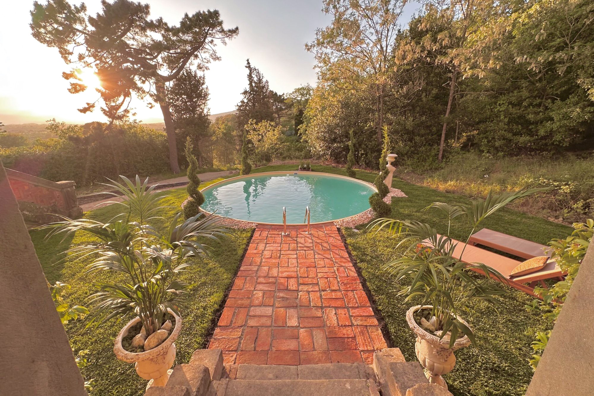 Het park van 7.550 m² omvat een geplande verhoogde zwembadlocatie. Een olijfgaard met 120 bomen maakt kleinschalige olijfolieproductie mogelijk. Toegang via een geasfalteerde weg, de A1 ligt op 10 km afstand.