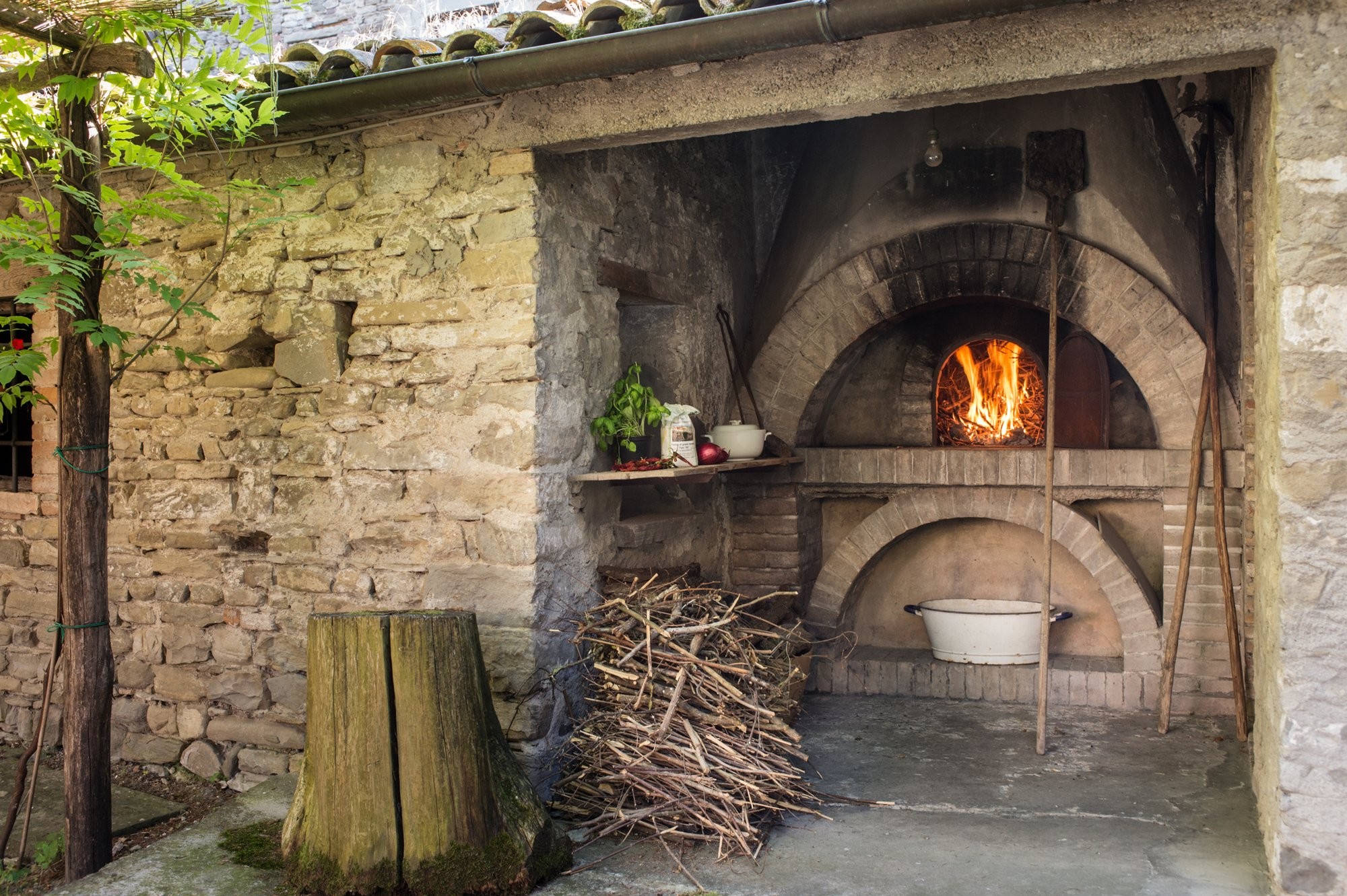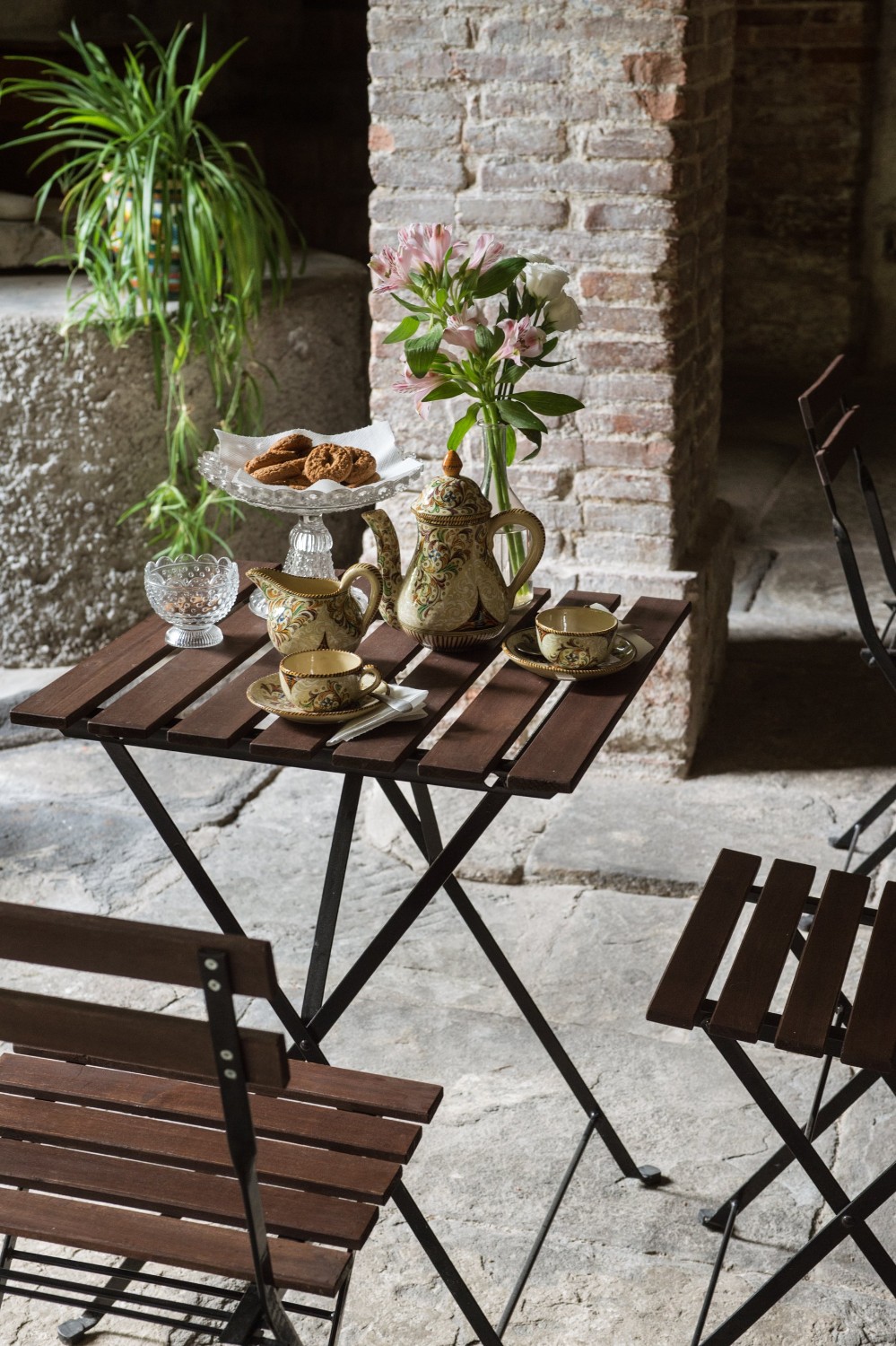 De binnenplaats biedt een rustige oase met rozen, citrusbomen, een pergola en een antieke fontein. Kleine balkons en panoramische ramen bieden uitzicht over het dorp en de omliggende Apennijnen, waardoor binnen- en buitenruimtes harmonieus worden verbonden.