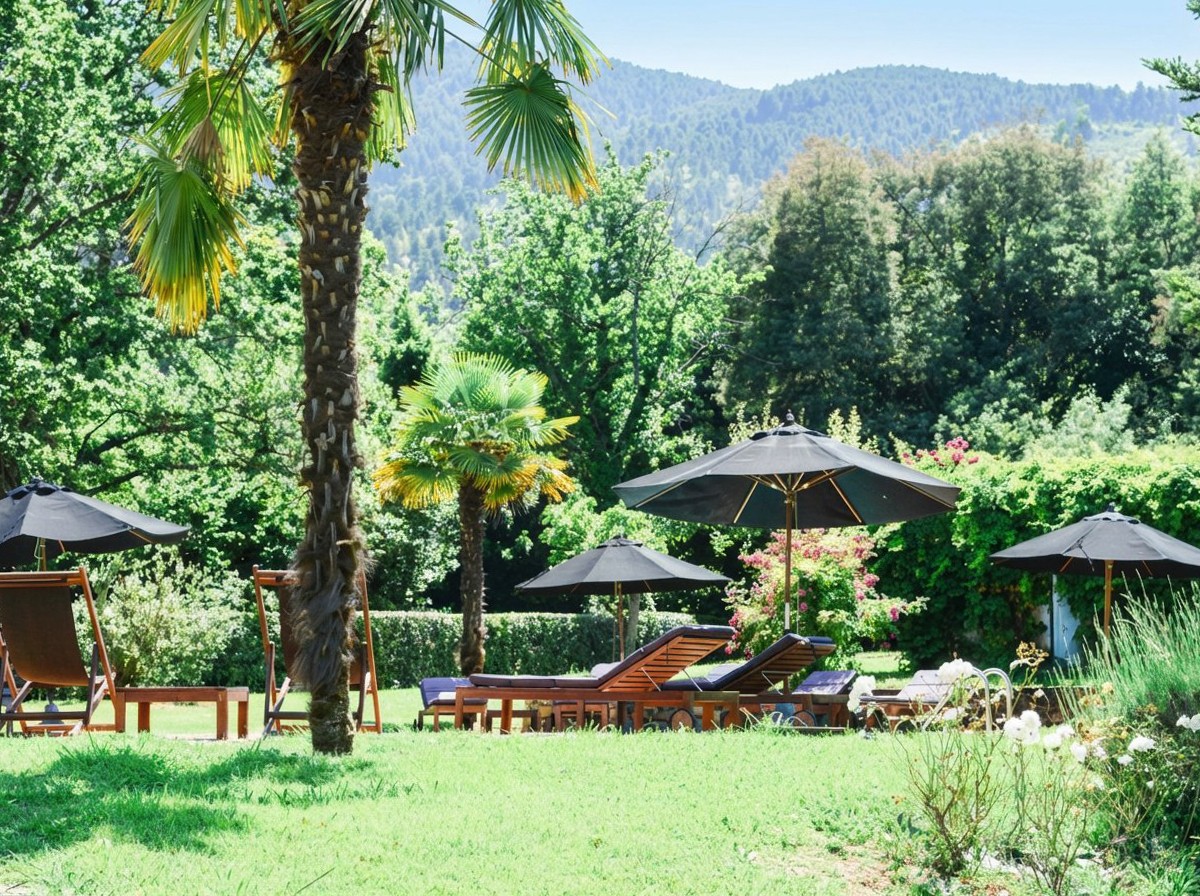 Die Außenbereiche und Grundstücke des Anwesens erstrecken sich über rund fünf Hektar. Neben dem italienischen Garten und dem Park gibt es einen Pool mit Sonnenterrasse und Außendusche, einen Innenhof mit Brunnen und Grillbereich, einen kleinen Wald mit Zitronenhainen und schattigen Ruheplätzen sowie einen Gemüsegarten mit Kräutern und biologischen Anbauprodukten. Außerdem gibt es Olivenhaine und einen eigenen Weinberg.