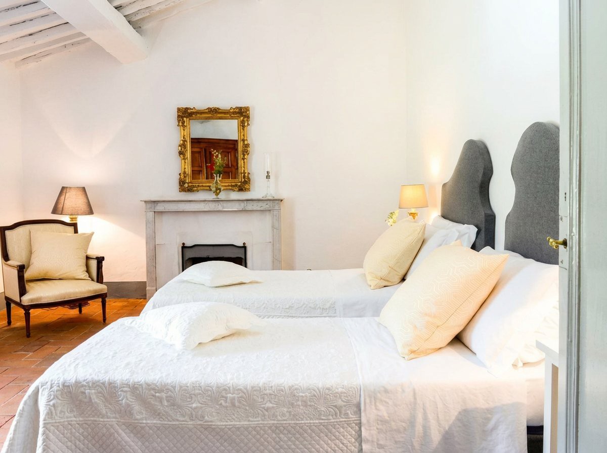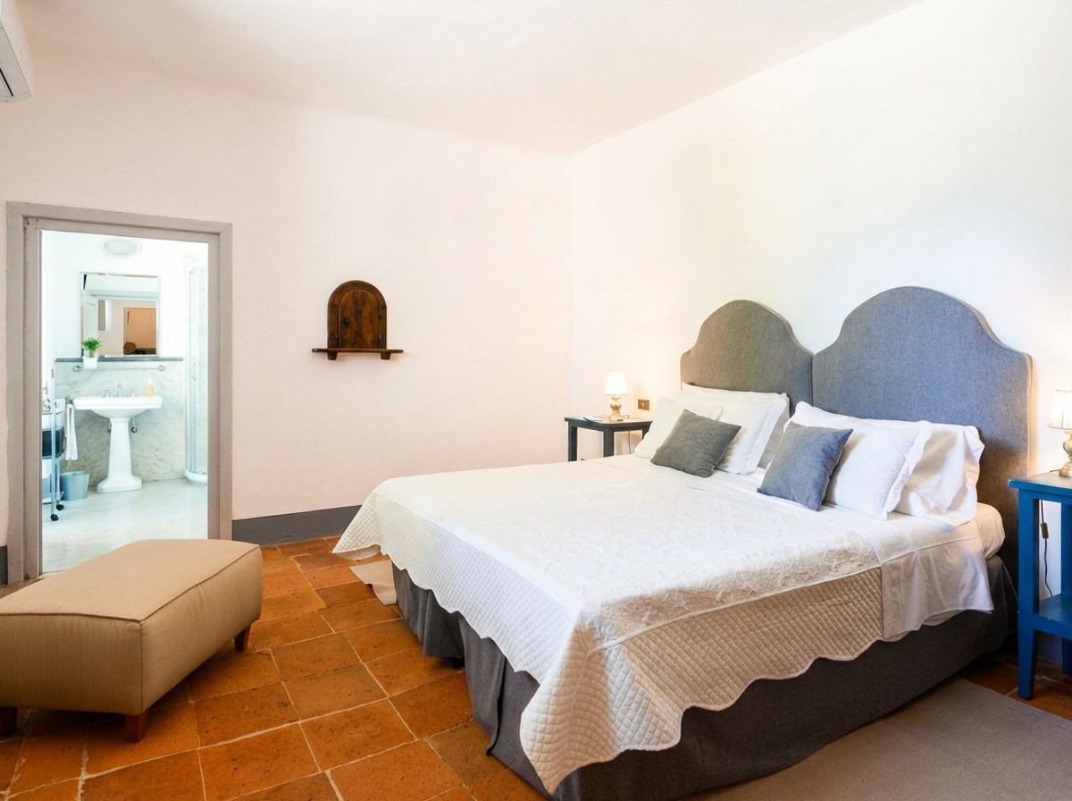 Das angrenzende Bauernhaus wurde mit großer Sorgfalt im „Country Chic“ restauriert und besitzt zwei Stockwerke. Im Erdgeschoss öffnet sich ein heller Wohnbereich mit direktem Zugang zum Innenhof, dazu Küche, Schlafzimmer mit eigenem Bad, Hauswirtschaftsraum und Garage. Im Obergeschoss befinden sich fünf weitere Schlafzimmer mit drei Bädern.