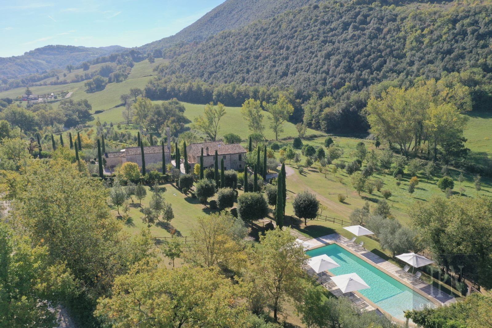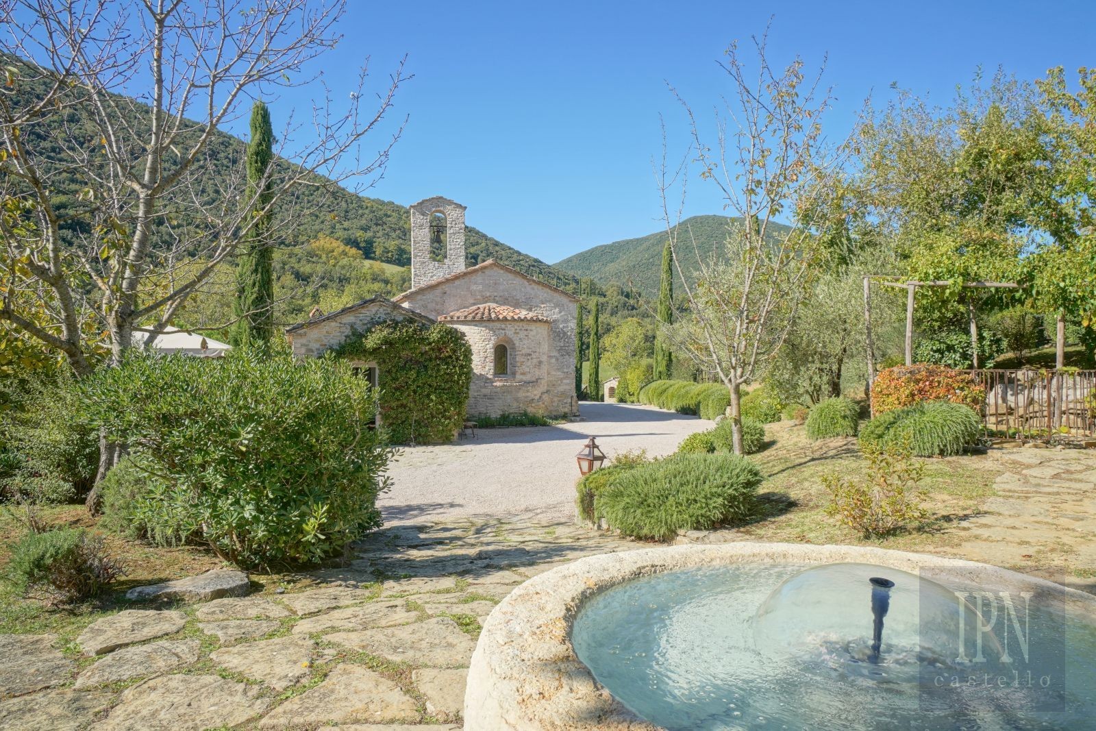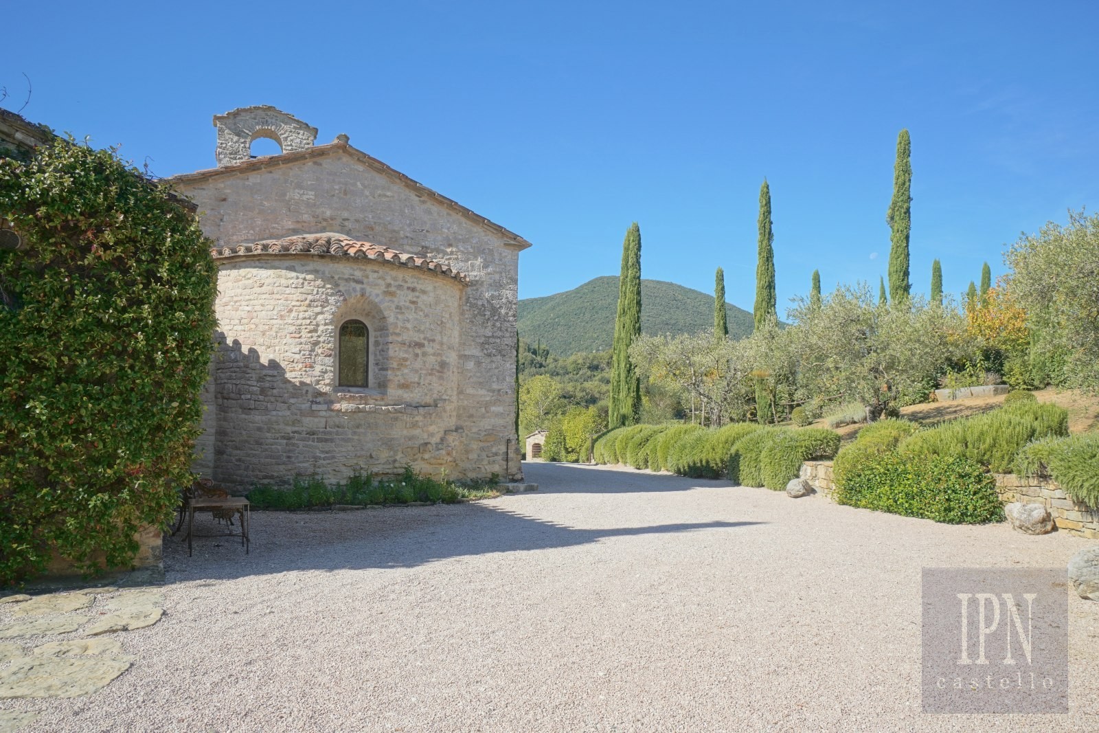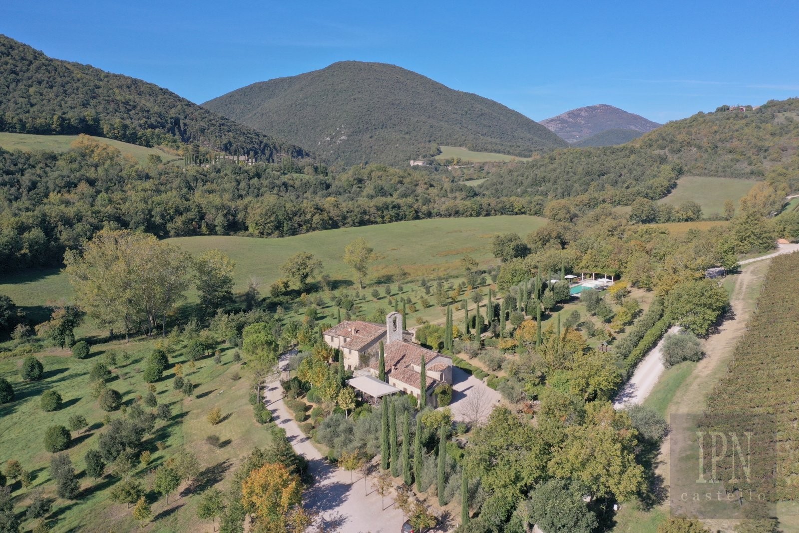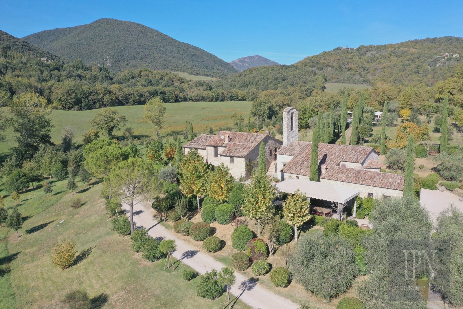 Gelegen in een rustige vallei in Umbrië, omgeven door weilanden, wijngaarden, olijfgaarden en bossen, combineert dit landgoed historische architectuur met modern comfort. Het omvat een kerk uit de 13e eeuw, omgebouwd tot woonruimte, en een landhuis uit de 18e eeuw, beide zorgvuldig gerestaureerd volgens hoge normen.