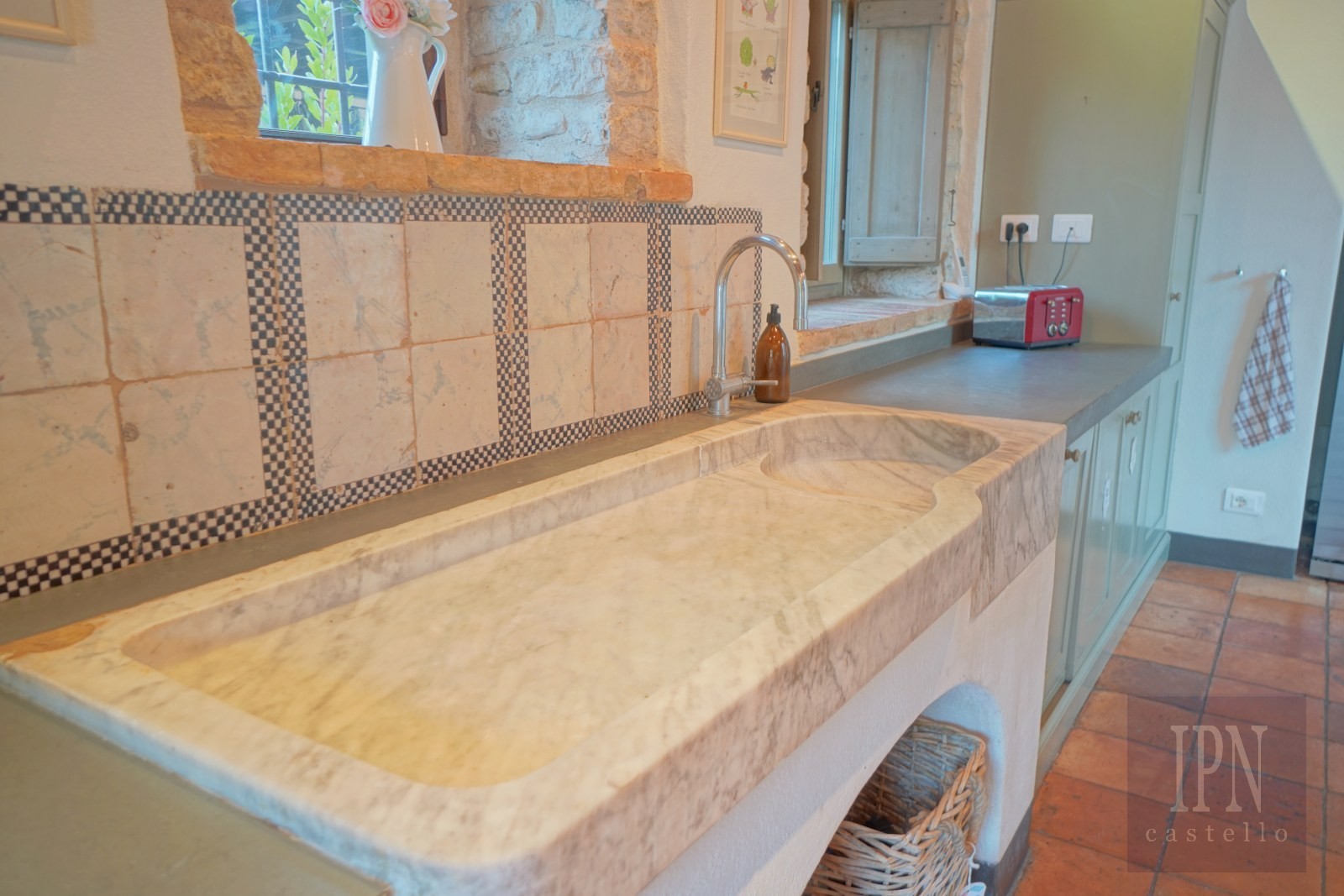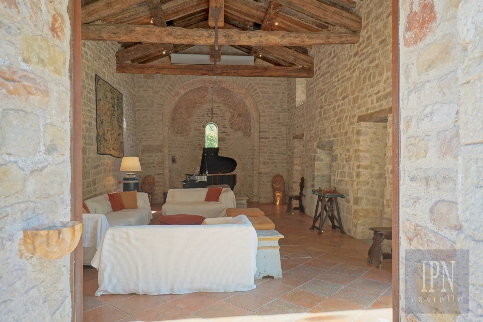 De kerk van 134 m² vormt het hart van het landgoed en biedt een volledig uitgeruste keuken, eetkamer en ruime woonkamer. Originele architectonische elementen, waaronder een kleine crypte, zijn bewaard gebleven. Grote ramen bieden panoramisch uitzicht over het Umbrese landschap, waardoor een rustige ruimte ontstaat voor ontspanning en ontvangst van gasten.