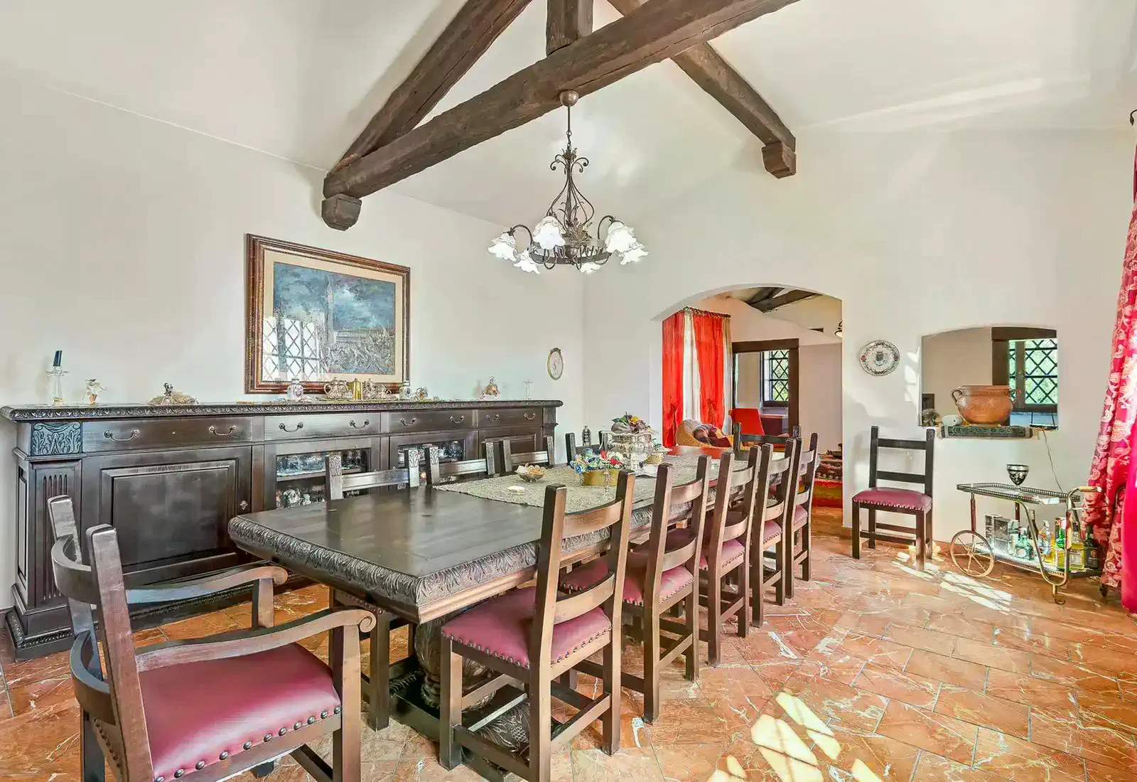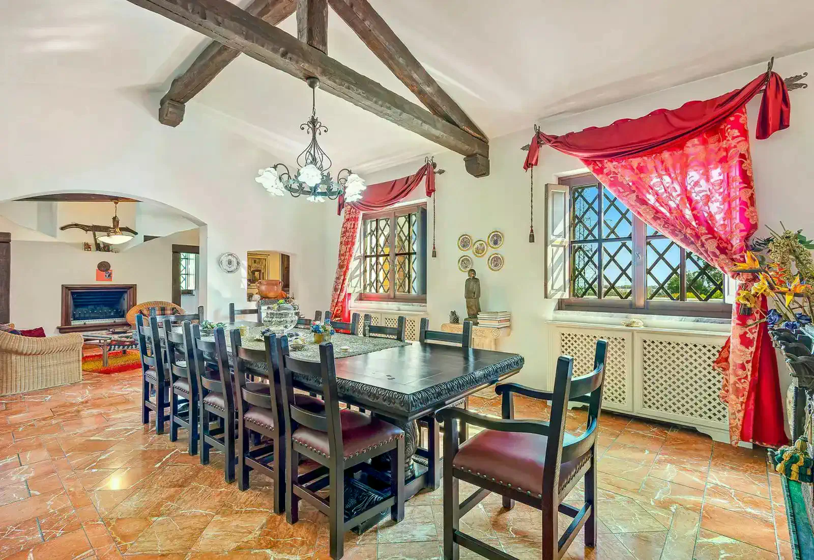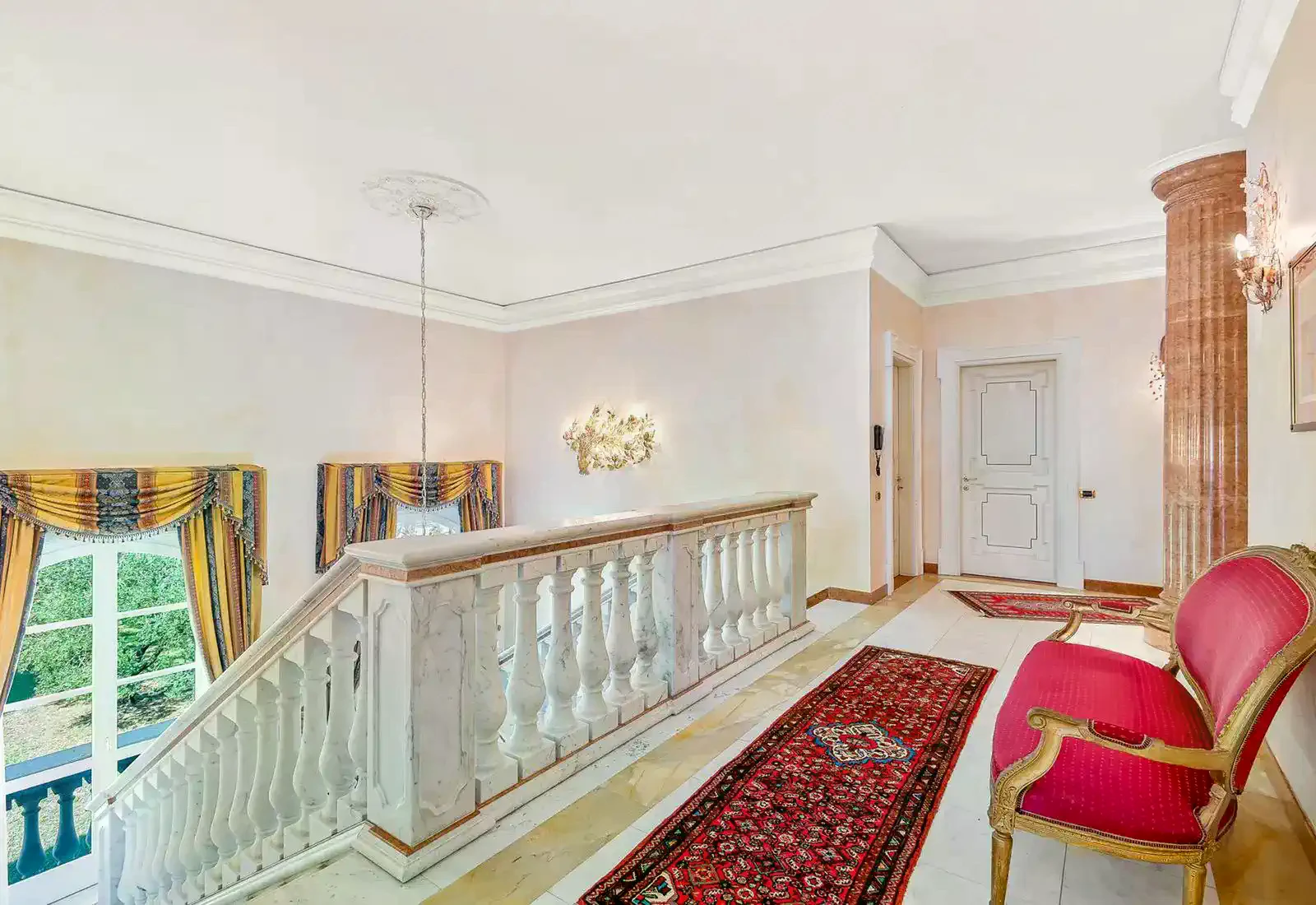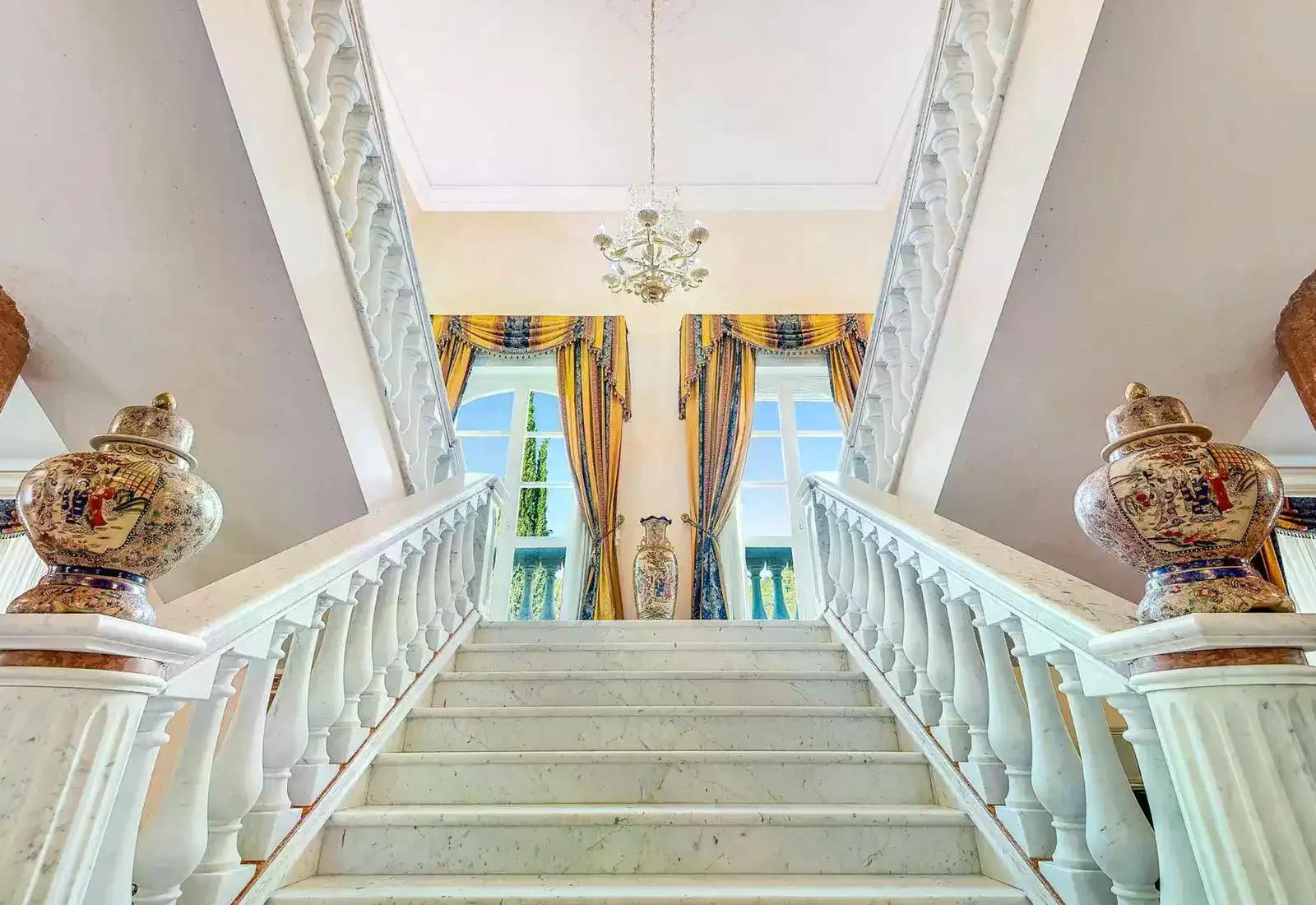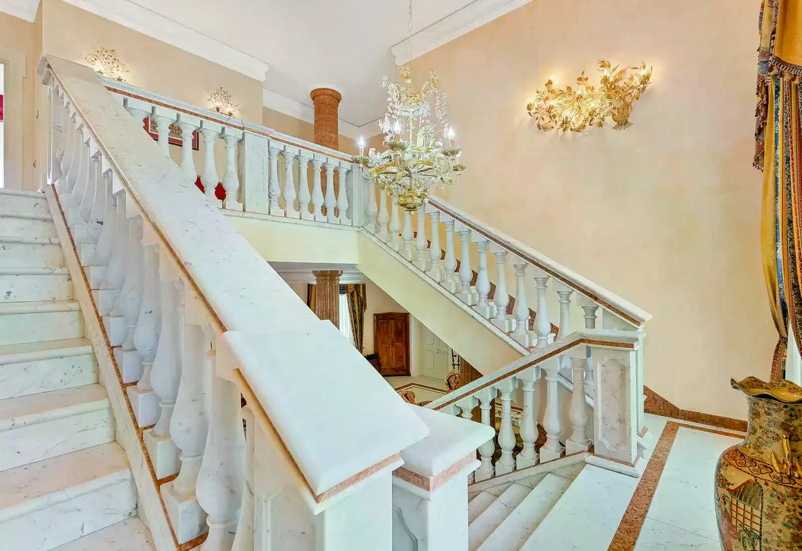 Op de begane grond bevinden zich een ruime woonkamer met originele open haard, een lichte eetkamer en twee volledig uitgeruste keukens – één voor gezellige bijeenkomsten en één functioneel voor personeel of privéchef. Op de bovenverdieping liggen zes ruime slaapkamers en vier badkamers, afgewerkt met marmer en maatwerk houtwerk.