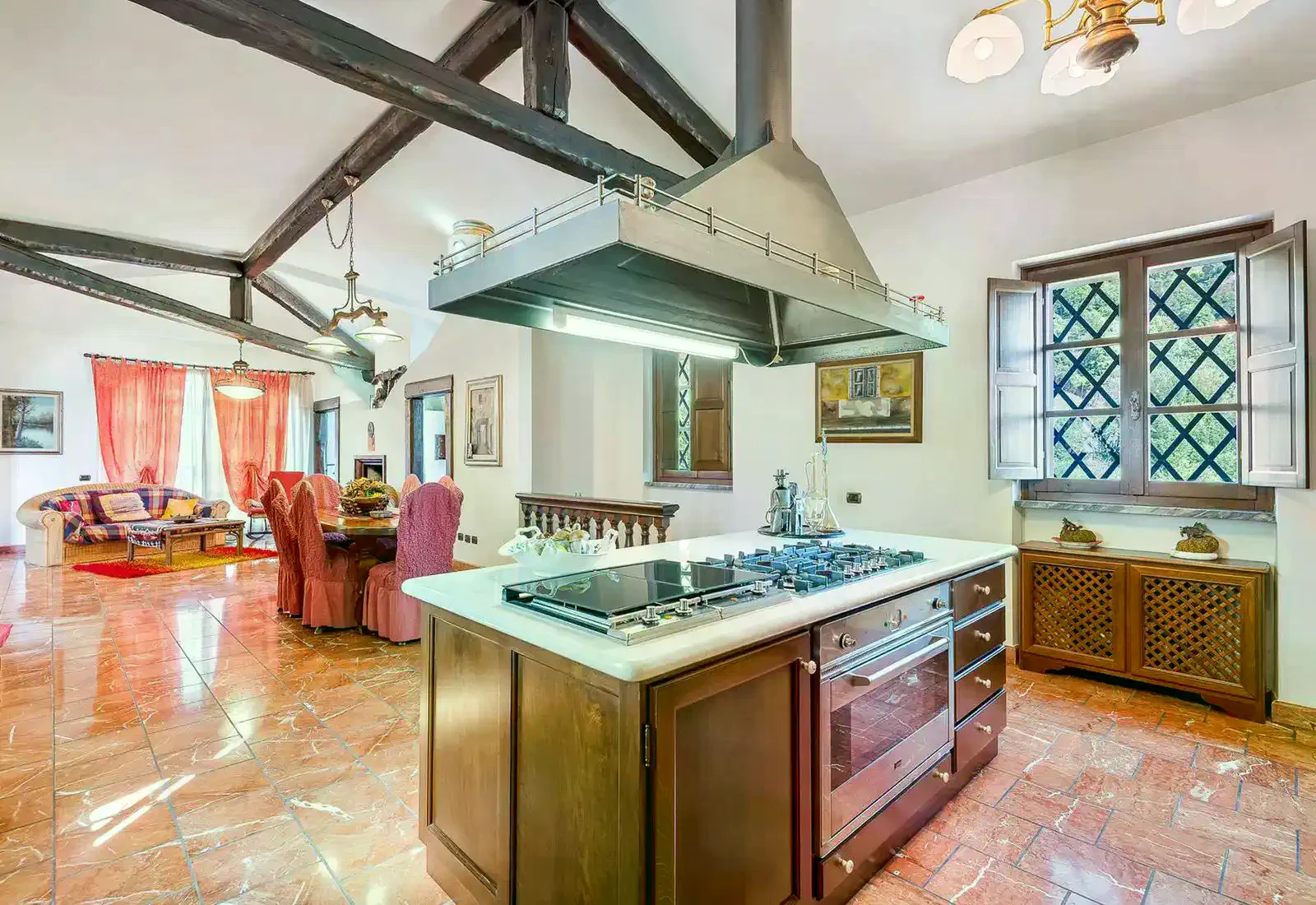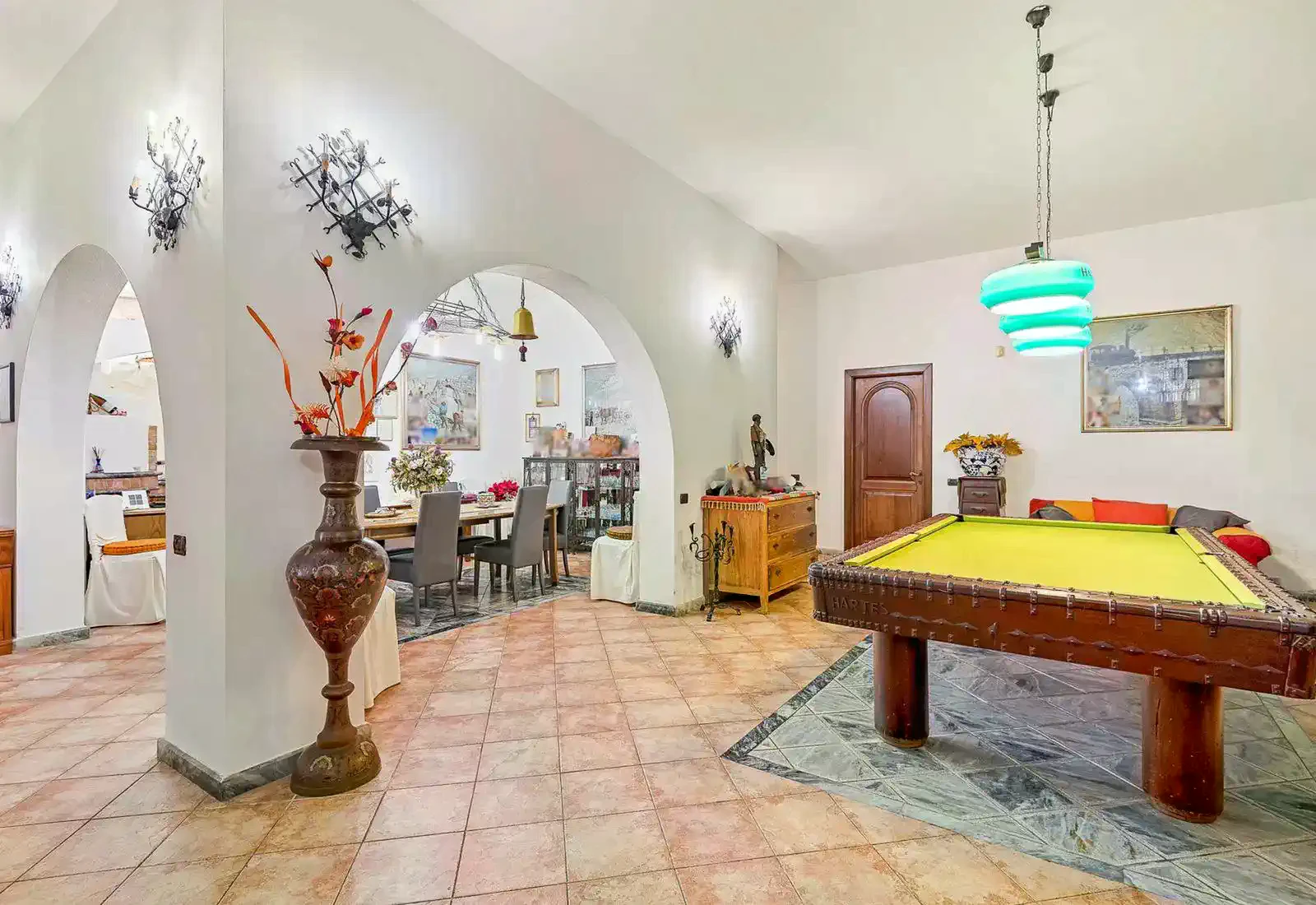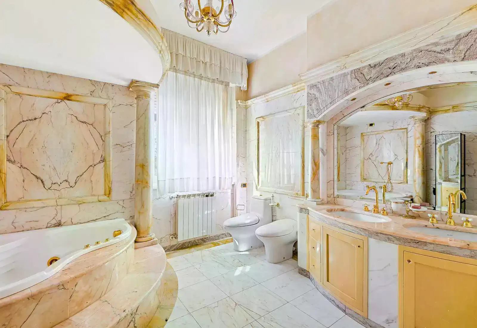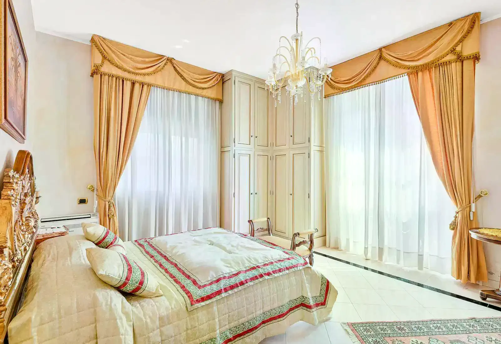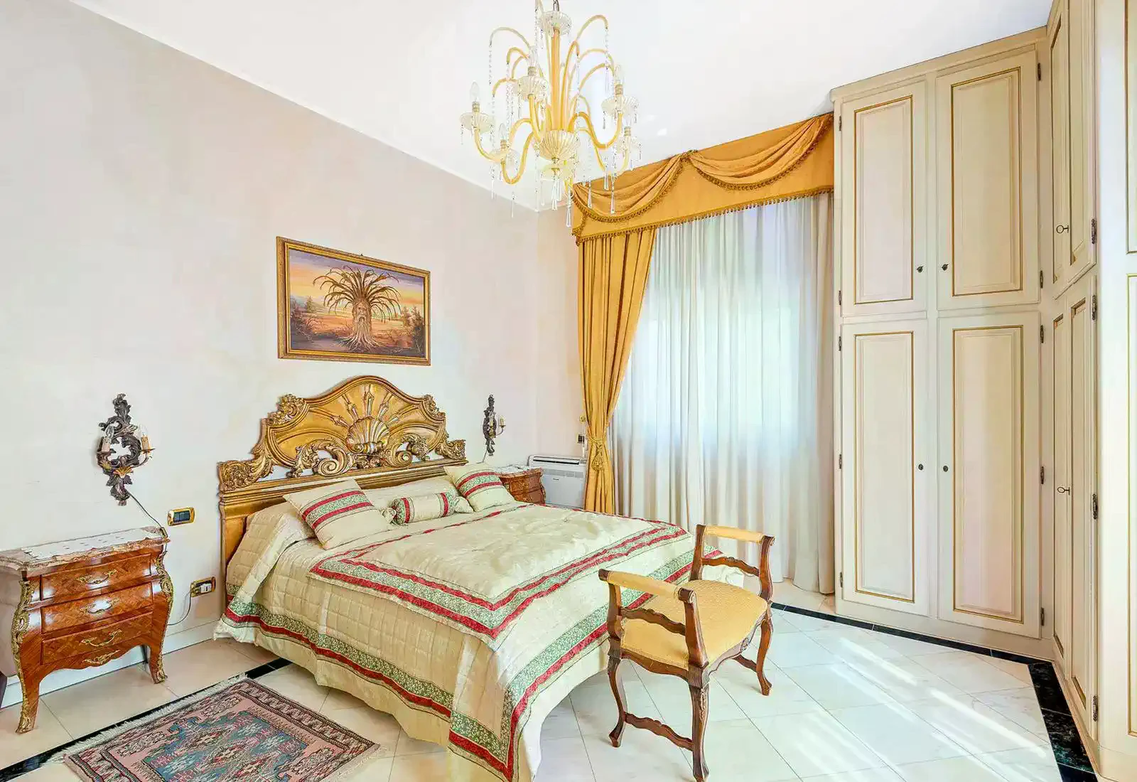 Op de begane grond bevinden zich een ruime woonkamer met originele open haard, een lichte eetkamer en twee volledig uitgeruste keukens – één voor gezellige bijeenkomsten en één functioneel voor personeel of privéchef. Op de bovenverdieping liggen zes ruime slaapkamers en vier badkamers, afgewerkt met marmer en maatwerk houtwerk.