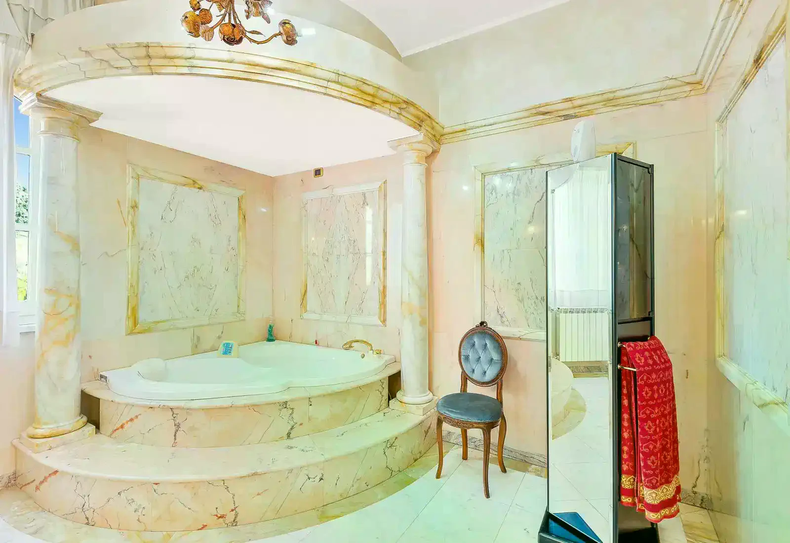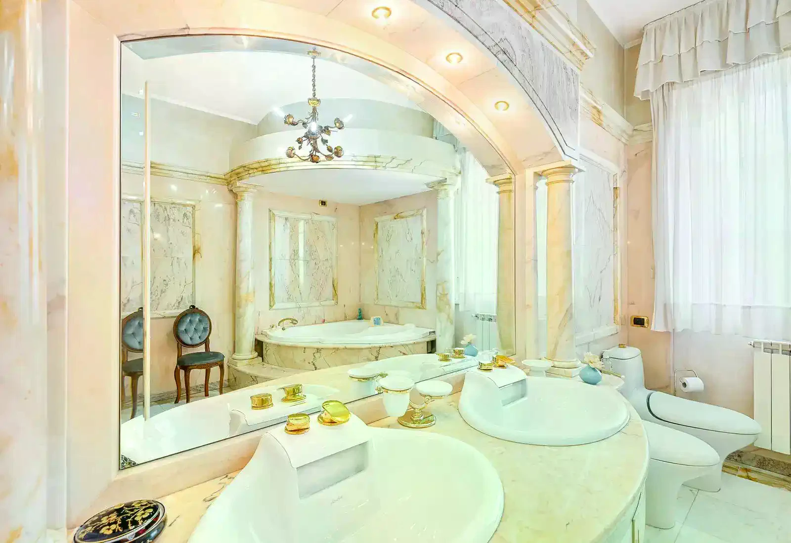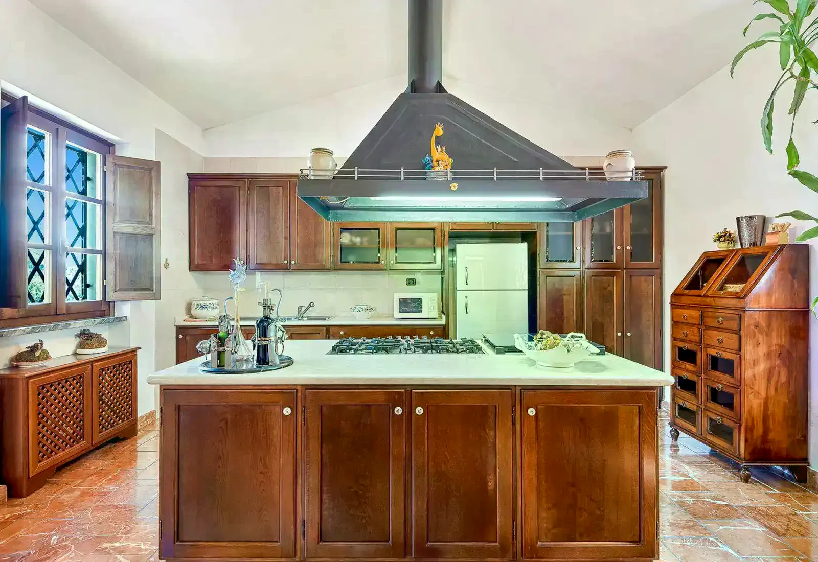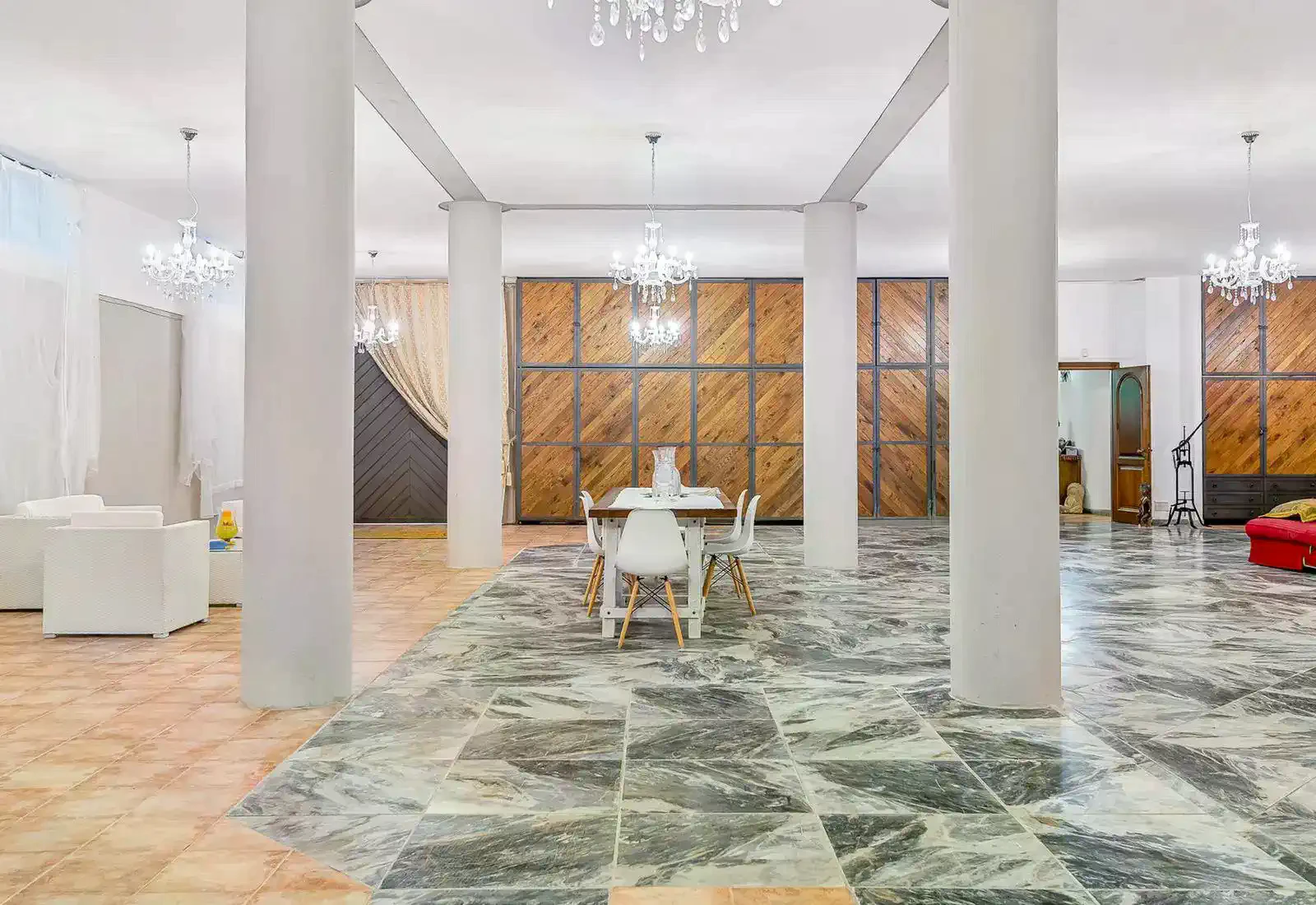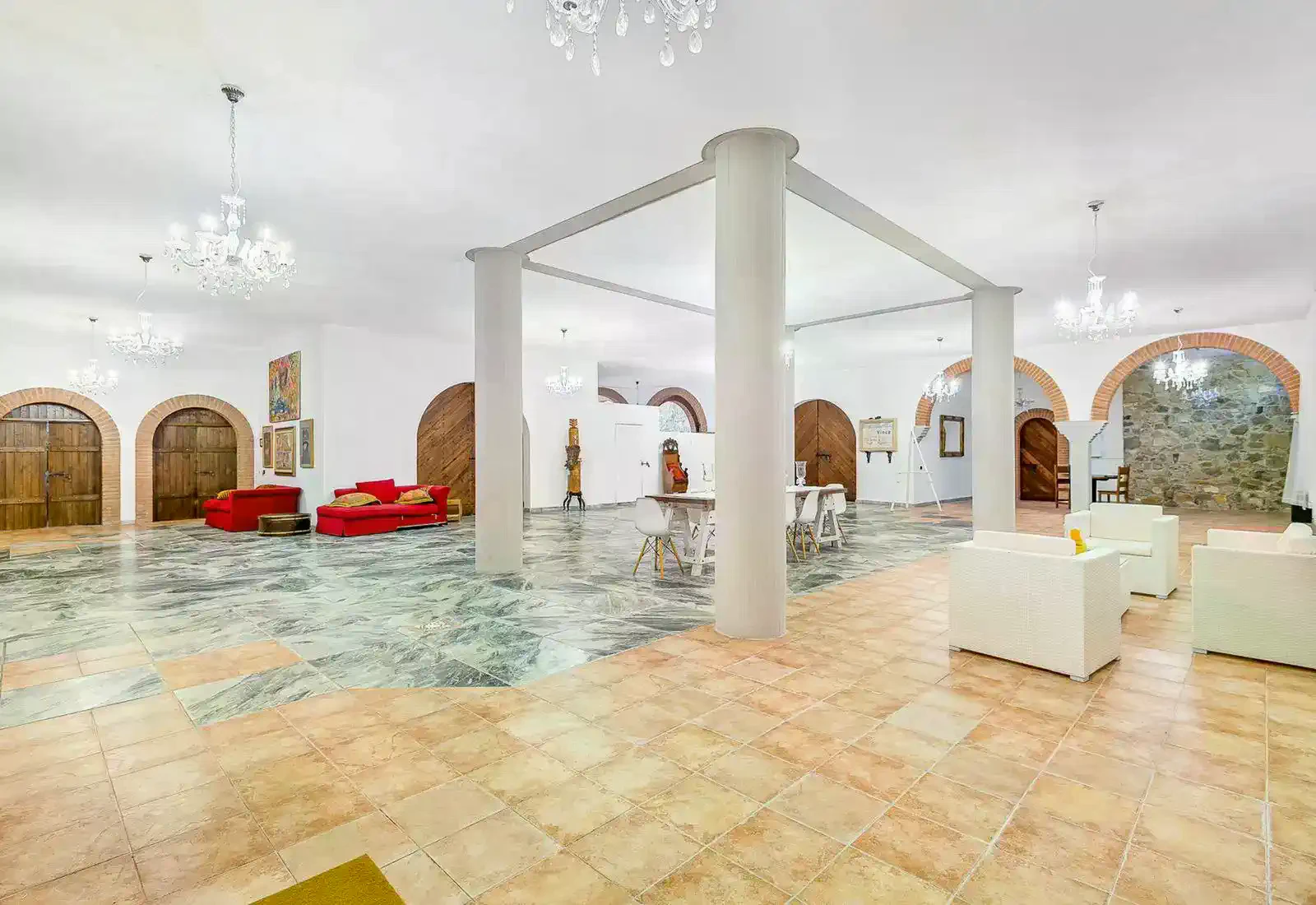 Op de begane grond bevinden zich een ruime woonkamer met originele open haard, een lichte eetkamer en twee volledig uitgeruste keukens – één voor gezellige bijeenkomsten en één functioneel voor personeel of privéchef. Op de bovenverdieping liggen zes ruime slaapkamers en vier badkamers, afgewerkt met marmer en maatwerk houtwerk.
