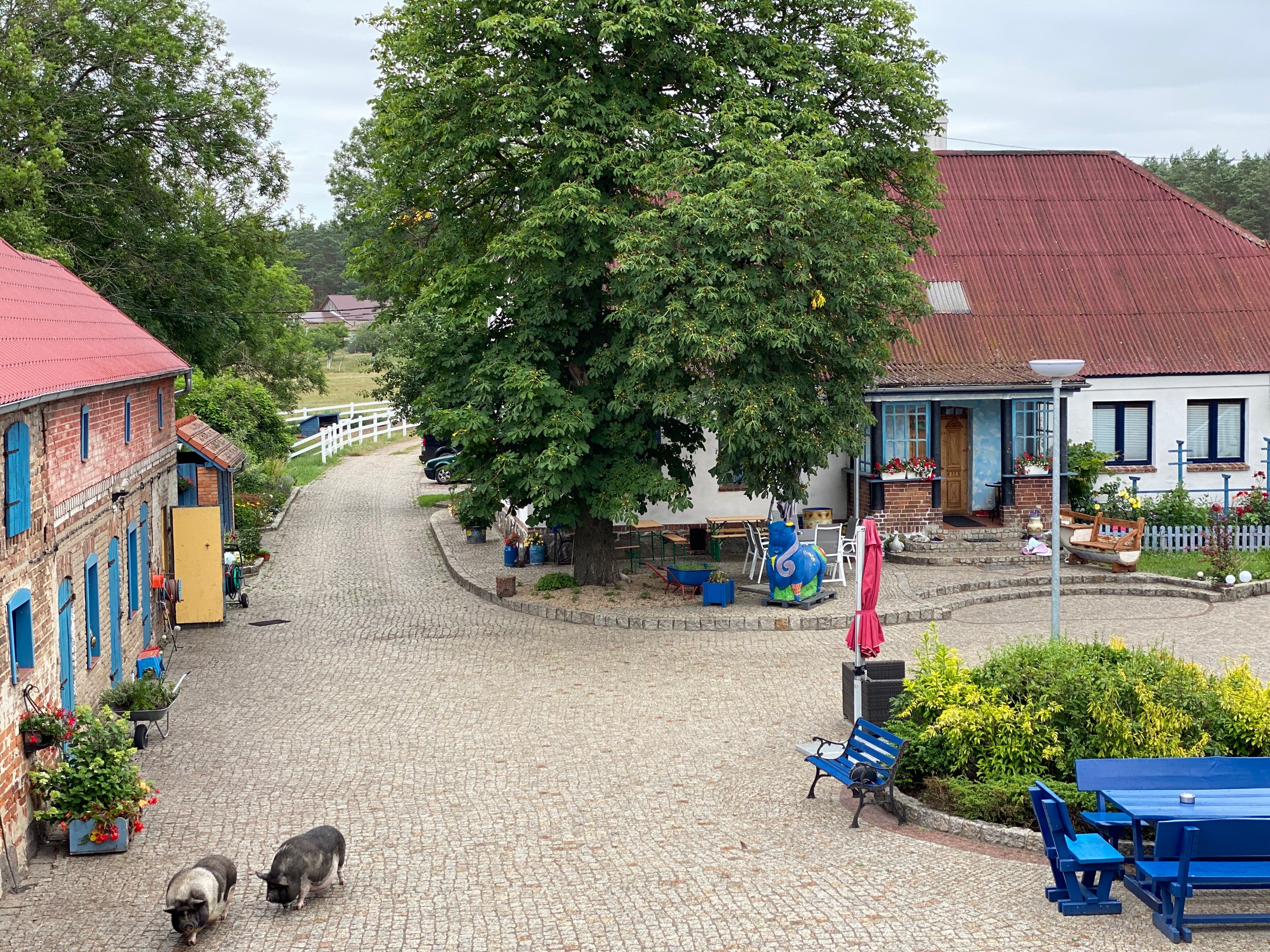 - Kopfsteinpflasterhof mit historischem Baumbestand