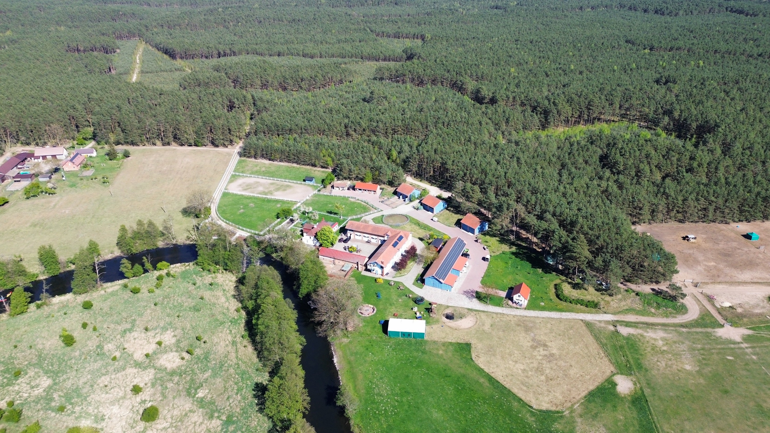 Das Grundstück grenzt direkt an den Fluss Drawa, einen der saubersten Flüsse Polens und Teil des Natura-2000-Netzwerks. Die Umgebung aus Wäldern, Seen, Mooren und offenen Feldern bietet ideale Bedingungen für Wanderer, Kanuten, Reiter und Naturfreunde.
