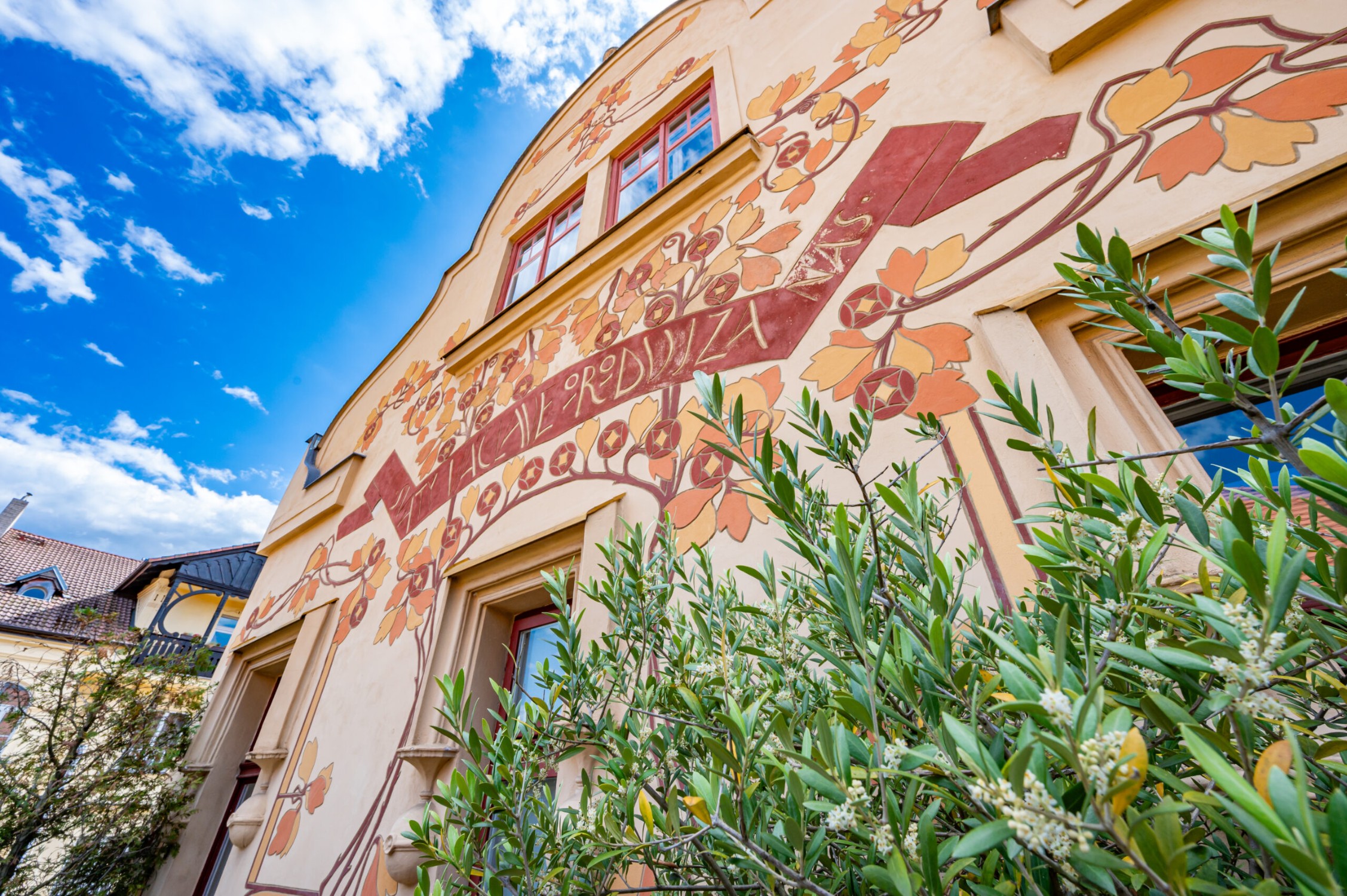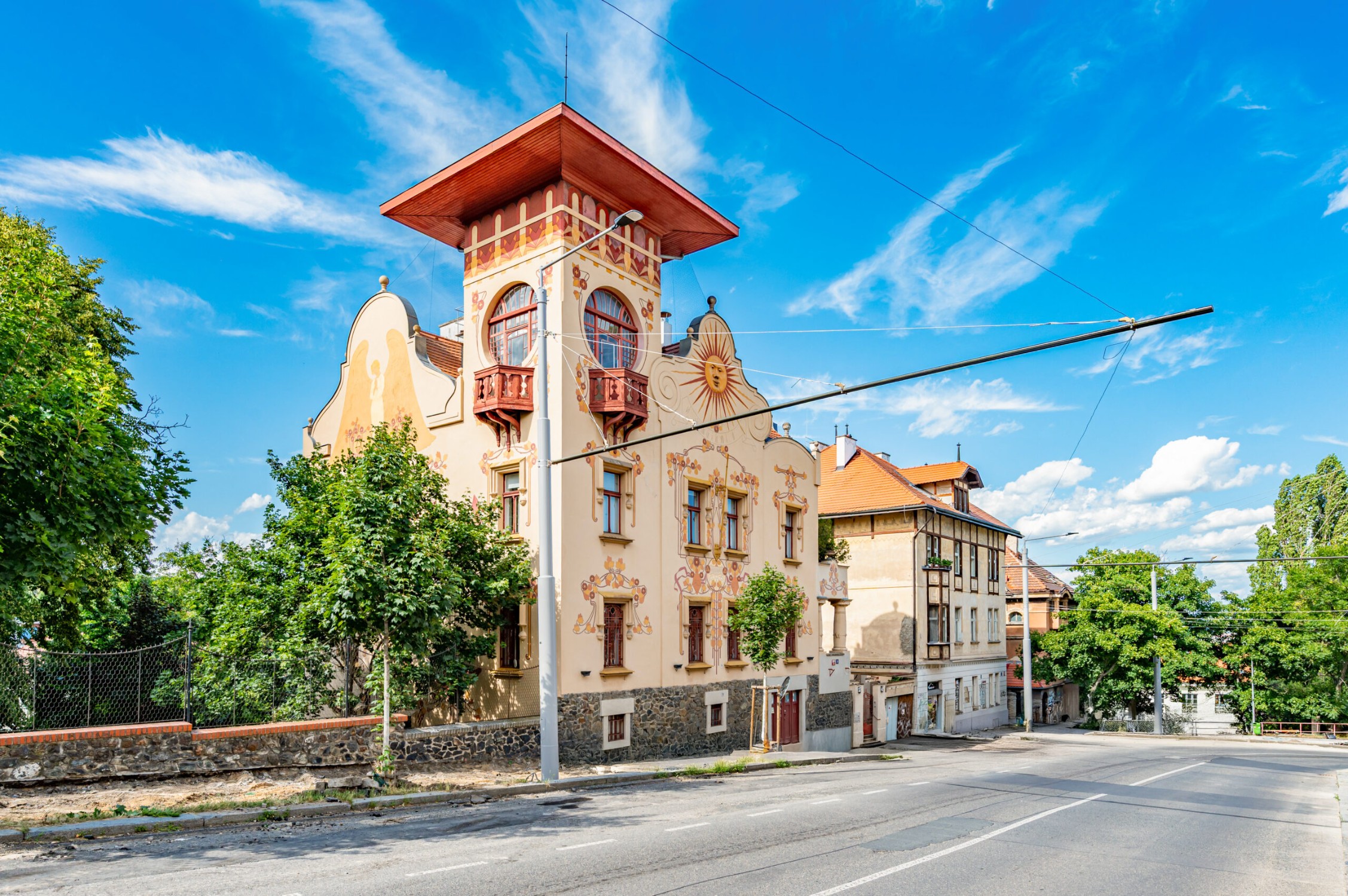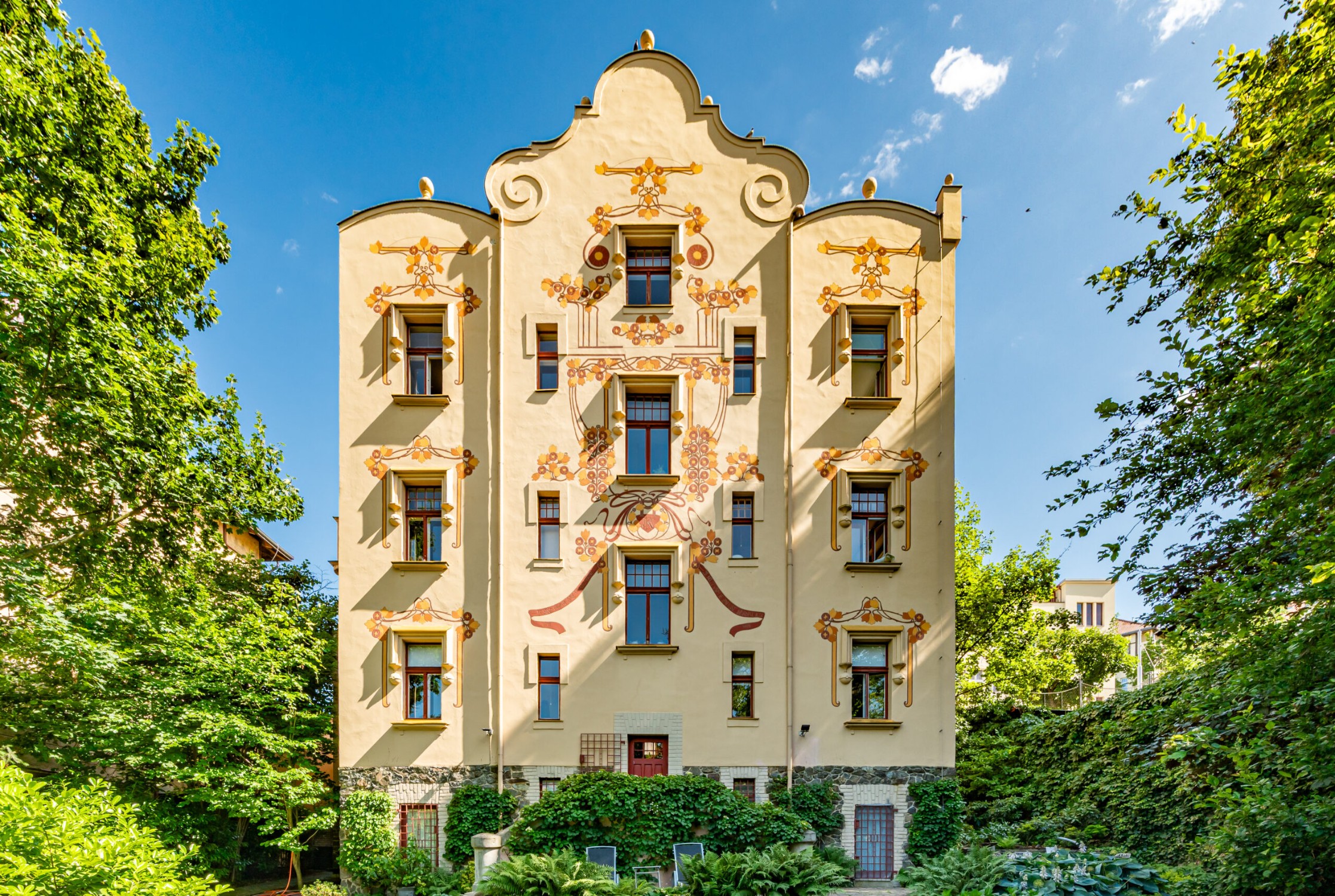 De gevel van het landhuis is ontworpen en uitgevoerd door de beroemde academische schilder František Kobliha. Zijn artistieke nalatenschap is zichtbaar in de decoratieve details, fresco’s, de engelfiguur en de zonnewijzer – elk element getuigt van de authentieke art-nouveau-esthetiek.