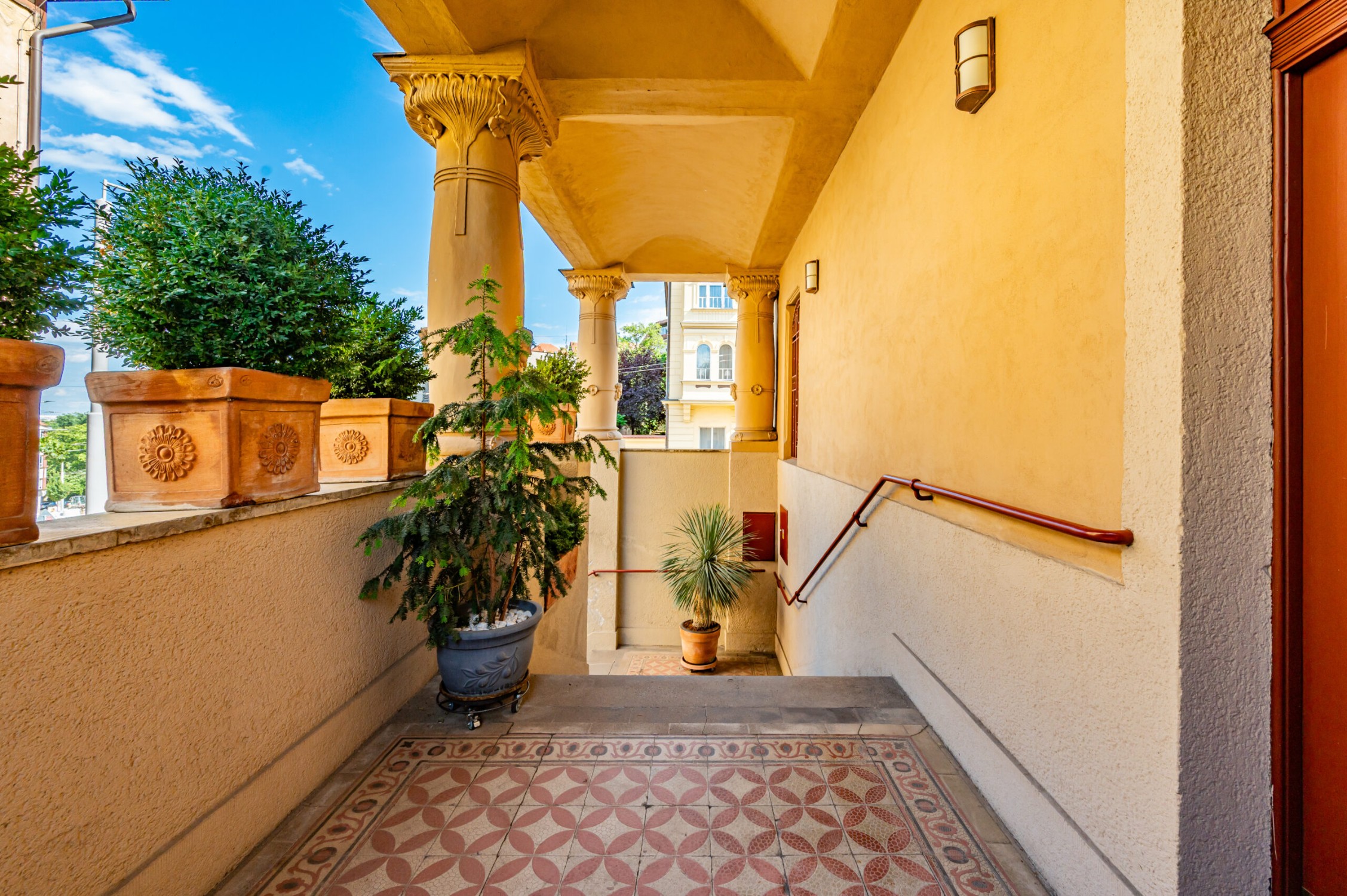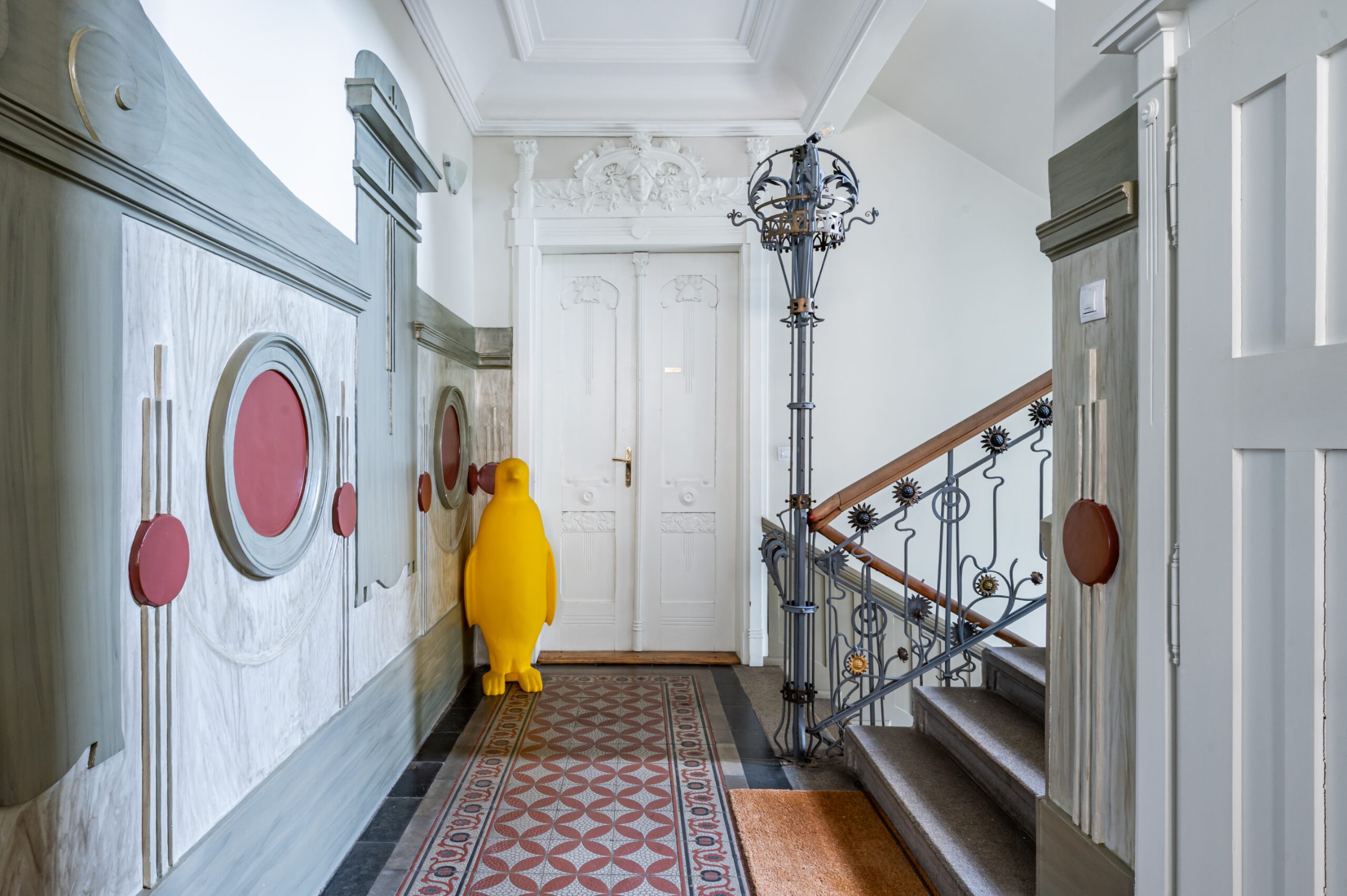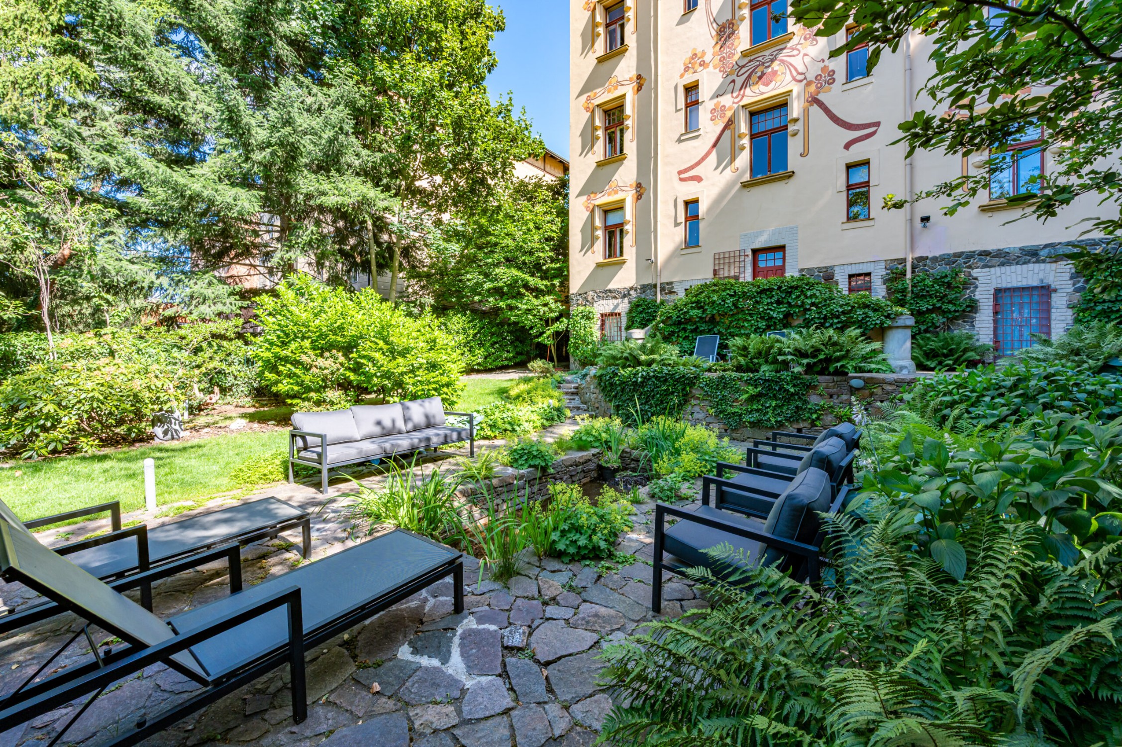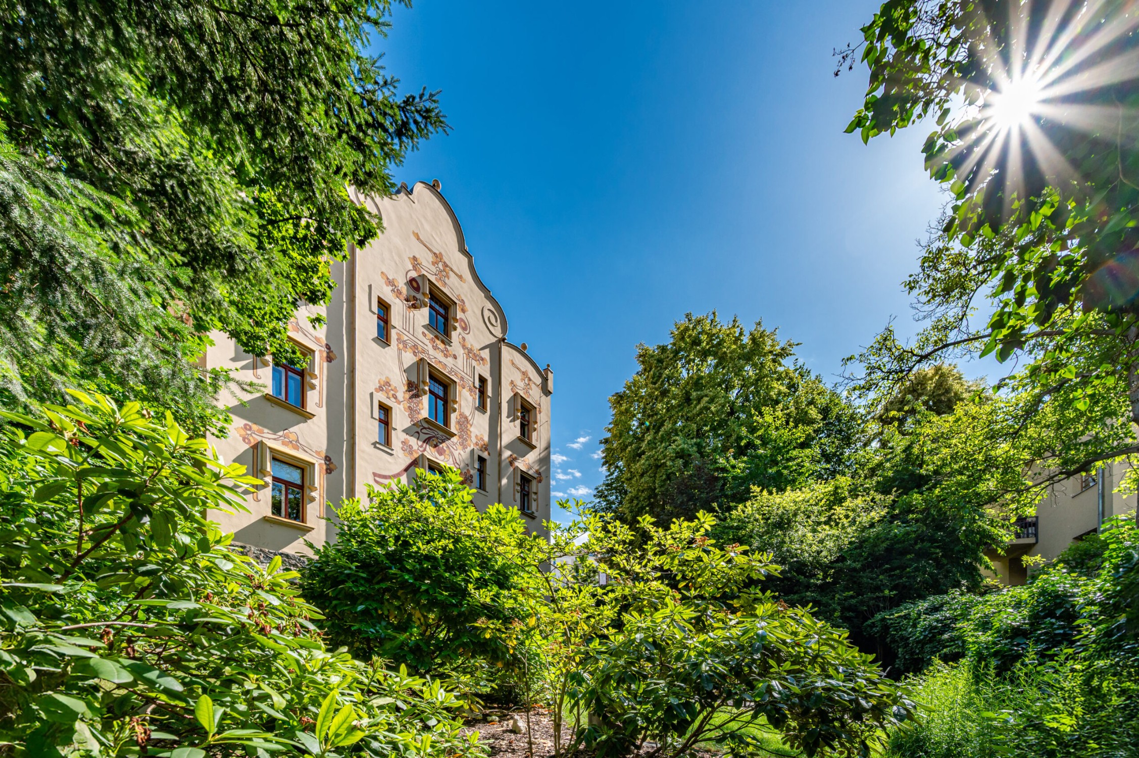 De gevel van het landhuis is ontworpen en uitgevoerd door de beroemde academische schilder František Kobliha. Zijn artistieke nalatenschap is zichtbaar in de decoratieve details, fresco’s, de engelfiguur en de zonnewijzer – elk element getuigt van de authentieke art-nouveau-esthetiek.