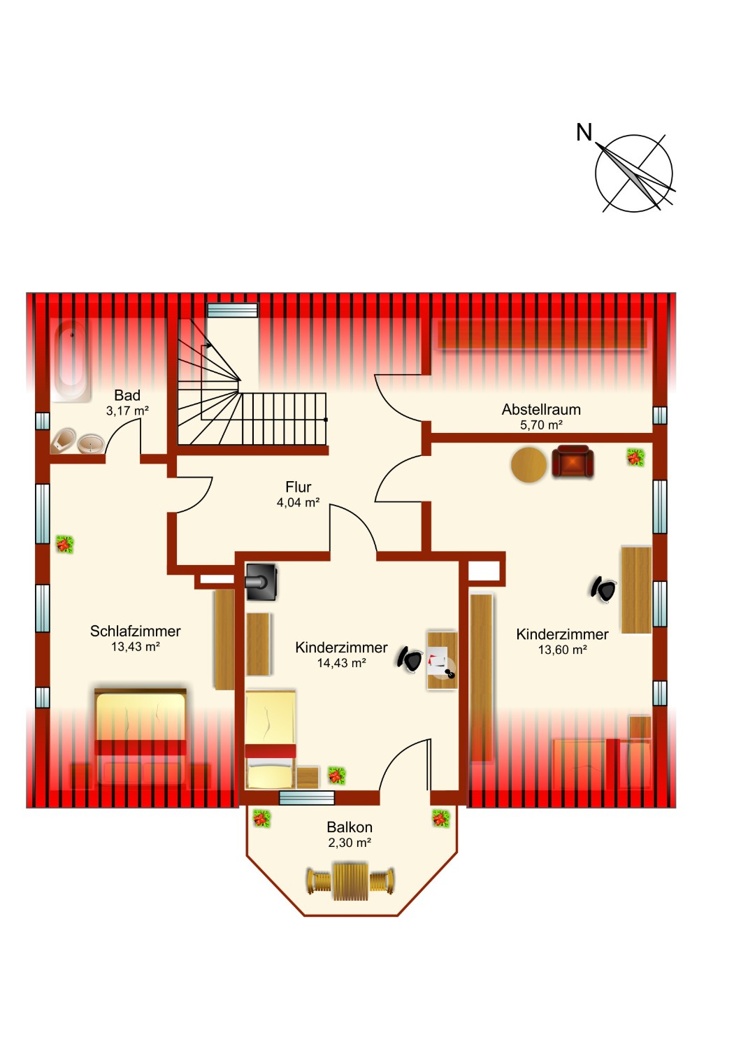 • Bovenverdieping: 3 kamers, berging, badkamer (bad, toilet), balkon, ca. 56,67 m²