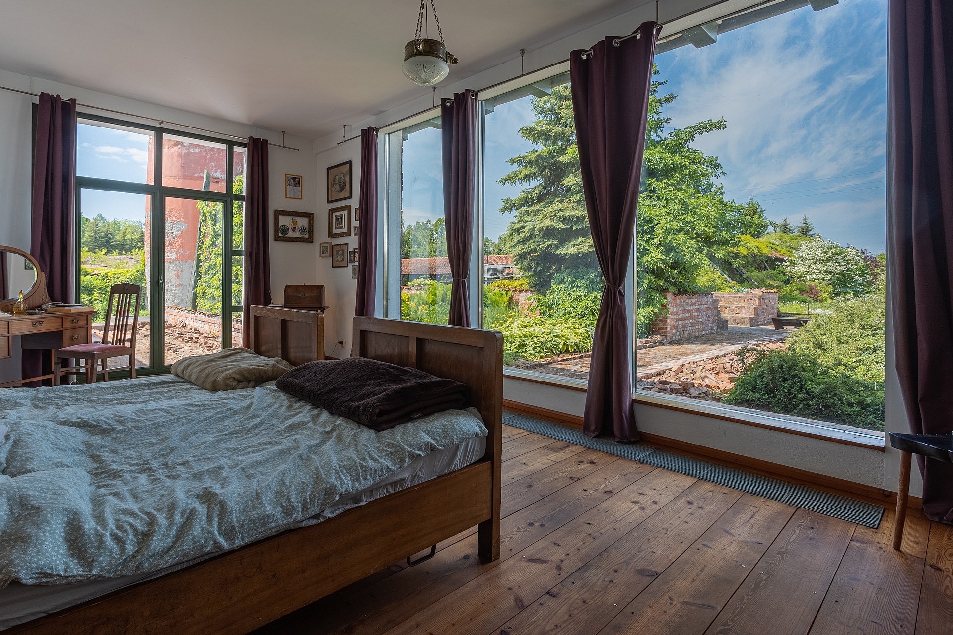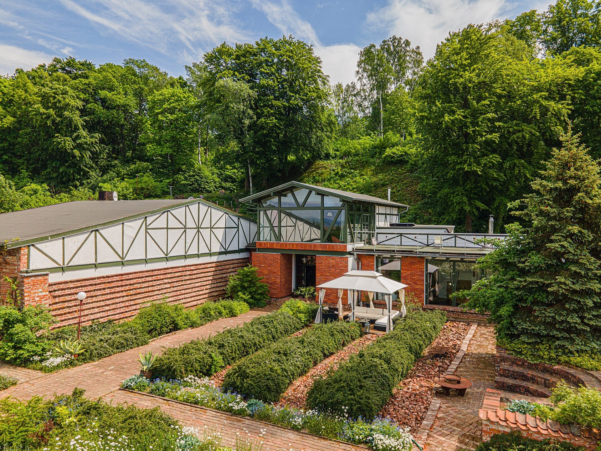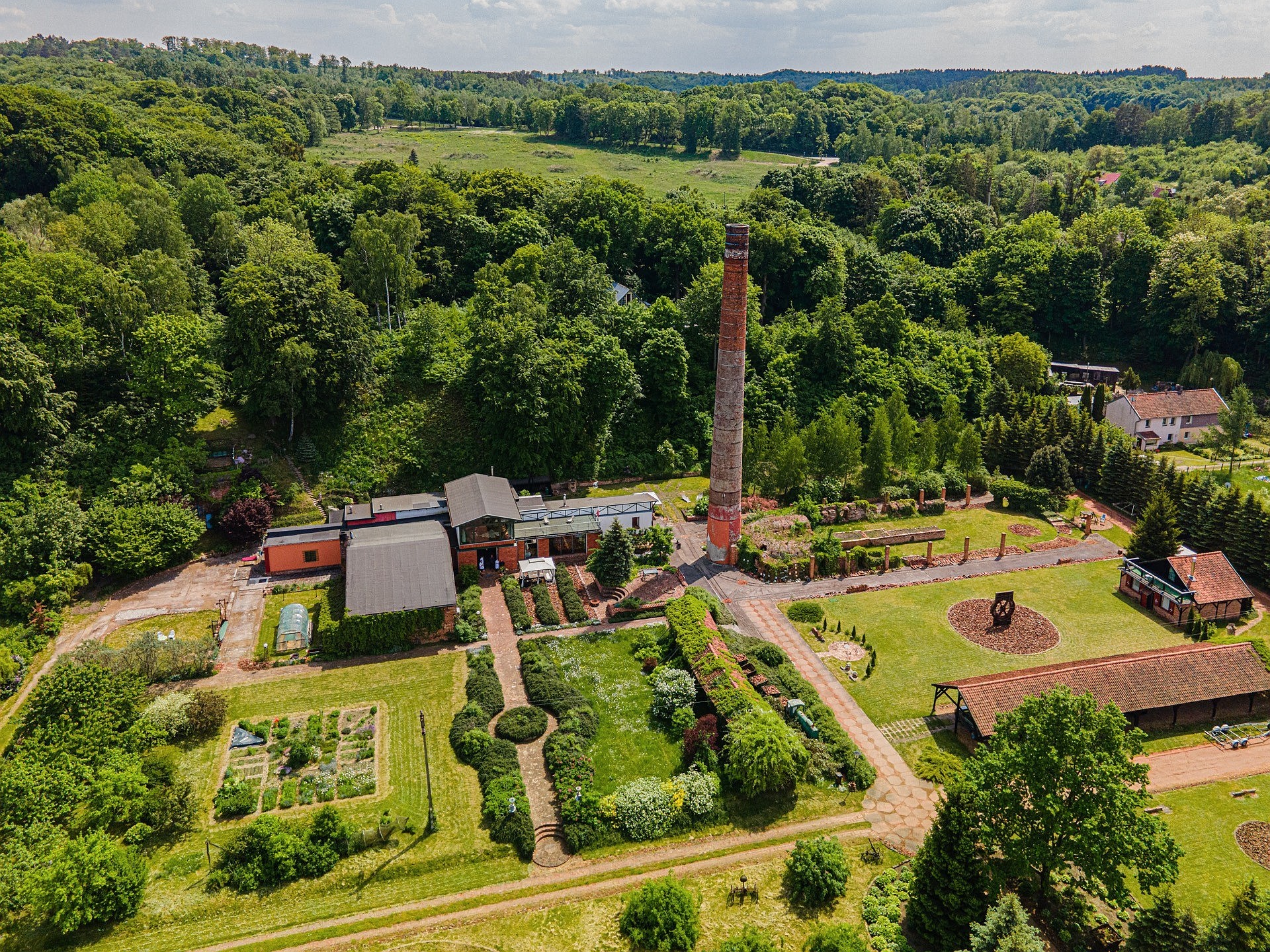 Aan de andere kant van het perceel staat een tweede woning met een oppervlakte van ongeveer 70 m², voorzien van een eigen open haard, twee terrassen en drie kamers. Dit gebouw is geschikt als gastenverblijf, atelier of vakantiewoning. Het volledige terrein van 6.100 m² (ca. 0,6 hectare) is beplant, omheind en zorgvuldig onderhouden, inclusief struiken, bloemen en een moestuin.