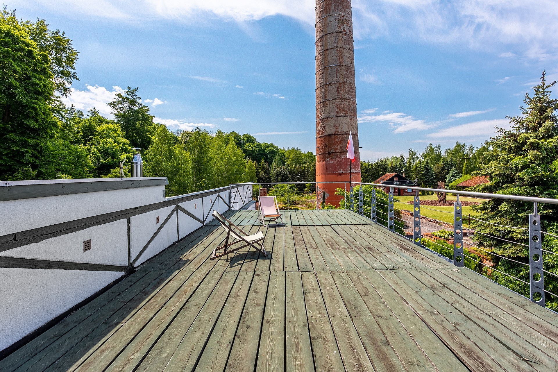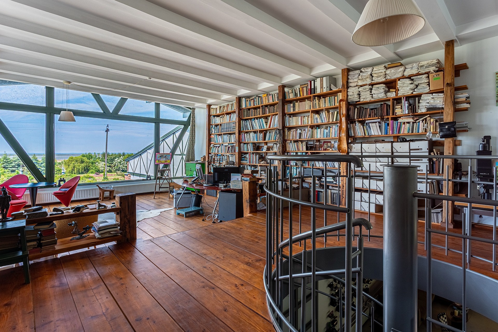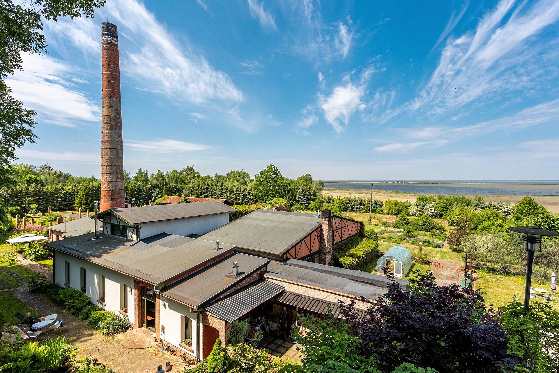 Het hoofdhuis is ontworpen als een loft in de ware zin van het woord. De gelijkvloerse verdieping omvat een open keuken met kookeiland en een leefruimte met open haard en eikenhouten banken. Een metalen trap in de typische stijl van Gdańsk leidt naar de bovenverdieping, waar zich een werkkamer met beglaasde bibliotheek en lorkenhouten vloer bevindt. Het panoramische uitzicht op de lagune nodigt uit tot zowel concentratie als rust. Een ruim terras sluit hier direct op aan. De slaapkamer op het gelijkvloers is bijna volledig beglaasd en biedt directe toegang tot de tuin. De badkamer, met een ellipsvormig vrijstaand bad, vloerverwarming en hoogwaardige details, is opgevat als een volwaardige rustruimte.